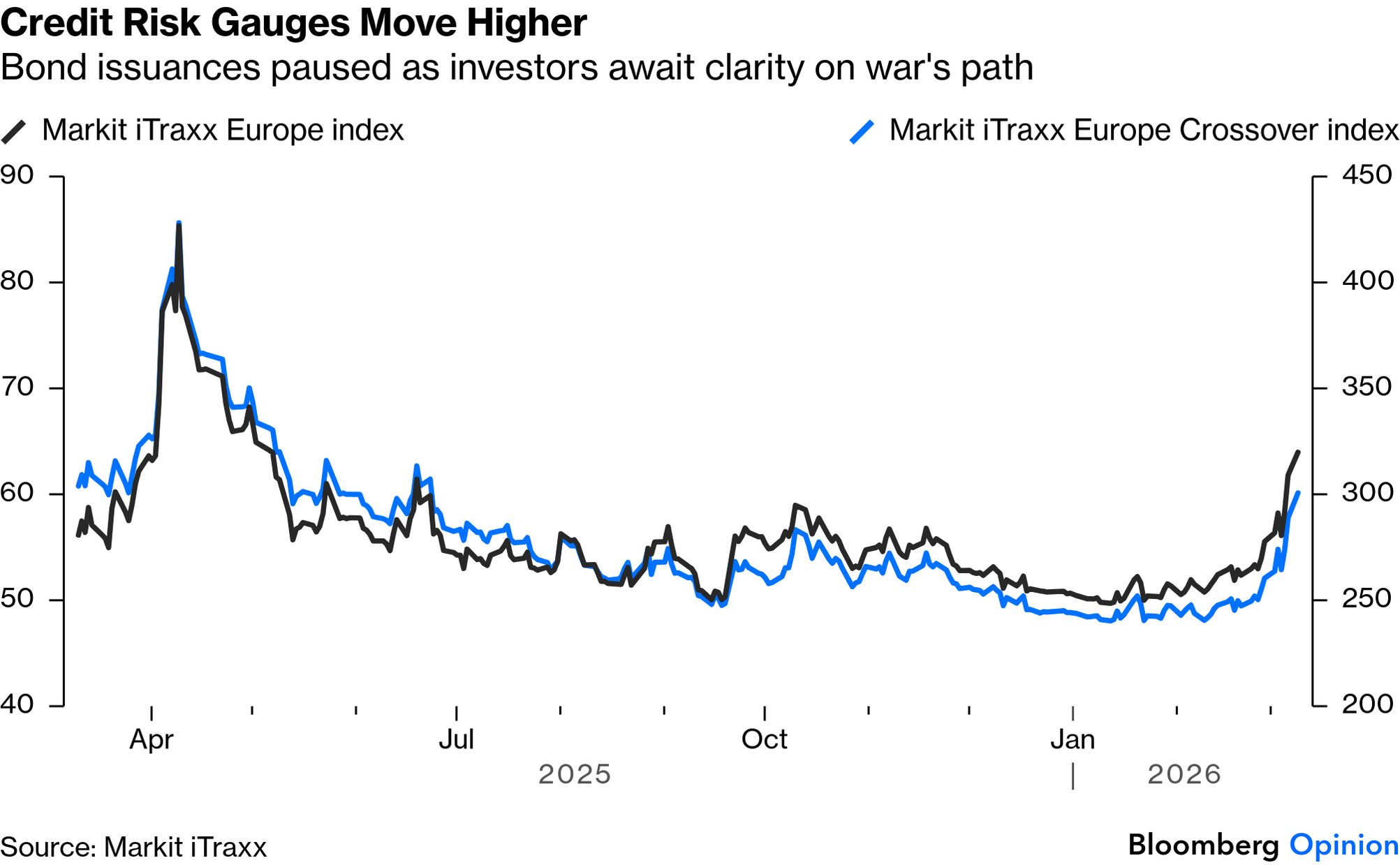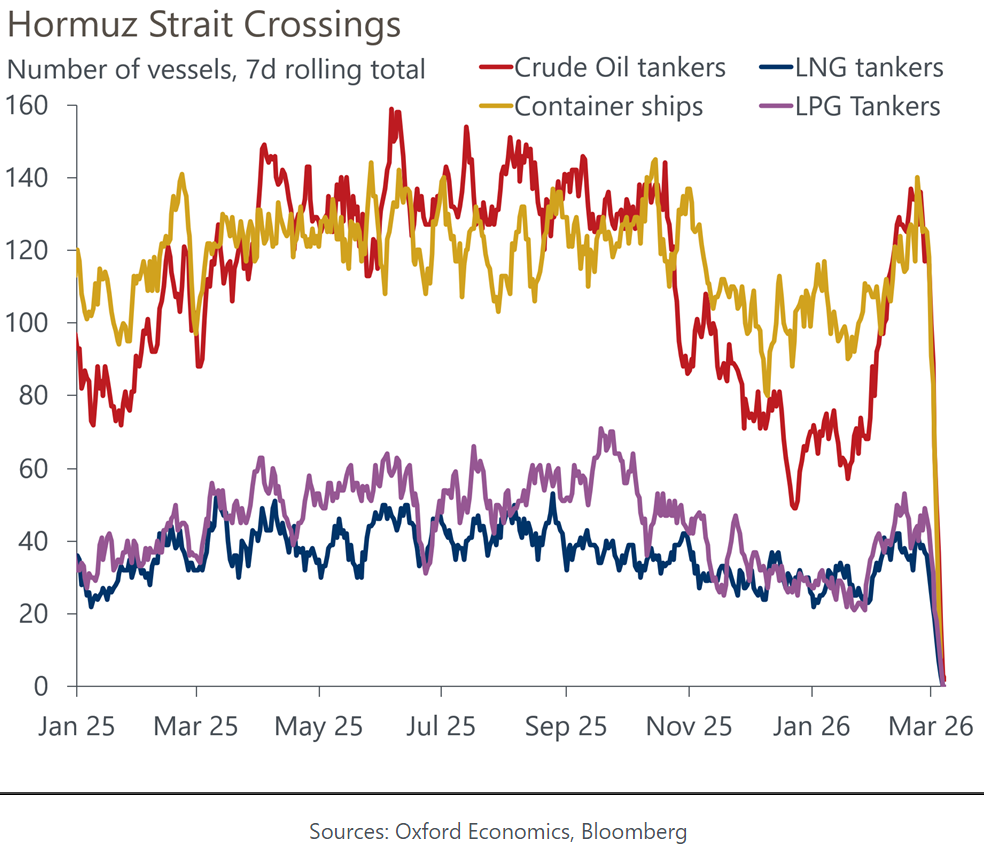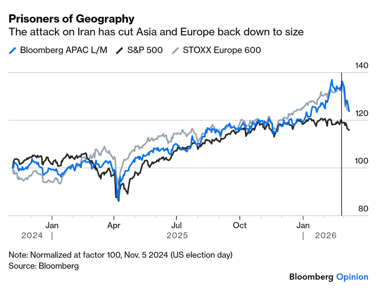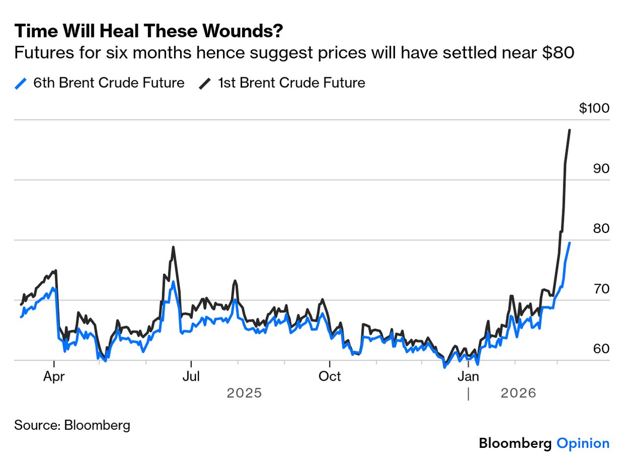 Years go by with less activity in the oil market than we have witnessed in just the first day of this week. The lingering question is whether all's well that ends well. Crude prices surged almost to $120, in a sharper and more sudden rise even than ever occurred in the early days of the Ukraine invasion. Is it more important that traders took the price this high, or that they swiftly thought better of it, and brought it back below $90? These are unusual events and while they were in part driven by exceptionally volatile news flow, it would be misleading to try to label the chart with events to explain the moves. Iran's choice of the son of the late Ayatollah Ali Khamenei as new supreme leader seemed a bad sign of intransigence to open the day. Reports that the G-7 was prepared to tap oil reserves if needed helped to bring the price under control, and then President Donald Trump's comment that the war would be short prompted the drop to $90. But it's impossible to explain all of the moves with news flow. Sentiment is driving this, and some traders were evidently willing to panic. But it's equally true that they weren't comfortable leaving oil above the landmark of $100. Oil is naturally giving a lead to other markets. Asian exchanges, open when the oil spike was at its worst, took severe damage, while the main US indexes were flat. Overall, the reaction in stocks continues to be surprisingly calm given the extreme goings-on in commodities markets. Geography has asserted itself with Asia and Europe, physically close to the conflict and in need of energy imports, sustaining greater losses than the US, which is neither. But all the last week has done is bring the rest of the world to heel somewhat. Asia and Europe have still outperformed the US since the election of Trump in November 2024: Despite an exceptionally alarming spasm as trading opened Monday in Asia, then, markets remain orderly, and are still not greatly impacted by the terrible events in the Middle East. What would change this? And what if anything would provide a clear signal that it was time to buy? Disruption to oil supply is, we all know, critical to turning a geopolitical shock into a more serious economic event. That has already happened. As this dramatic chart from Oxford Economics demonstrates, trade through the Strait of Hormuz has dried up: The issue is how long supply will stay stoppered up. And markets remained moderately positive on this front, even before Trump's comments were taken as evidence that he did not have the political appetite for a prolonged conflict. The 6th and 1st month futures on Brent crude, covering the price of a barrel at those points into the future, have been trading close together for most of the last year, but now a gap has opened. Futures are still pricing oil to be just around $80 in six months' time (about 10% above its $72 price on the eve of the conflict) — which would be significant, but not the economic game-changer that $120 oil would be: We need to keep following developments on the war and on oil supply. Beyond the duration of the shock, we also need to monitor the impact on central banks and on the macroeconomy. Societe Generale's Manish Kabra lays out the criteria as follows: An exogenous shock lasts beyond a week, but oil spikes usually peak in three months. That's the timeline and only two things matter: 1) shock duration and 2) the Fed's reaction function.