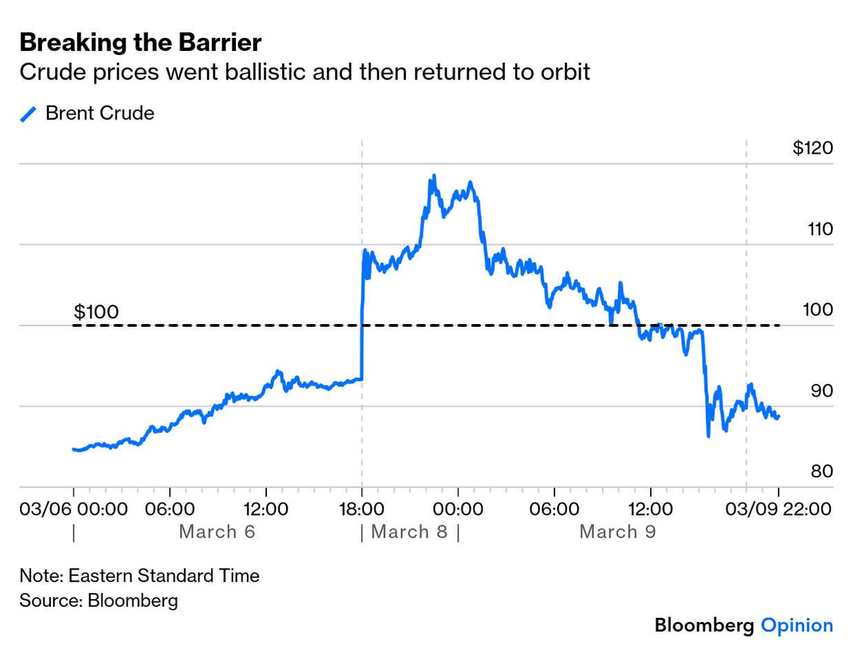 | To get John Authers' newsletter delivered directly to your inbox, sign up here. - So far this week, Brent crude surged from $93.50 to $118.90 — and back to $88.