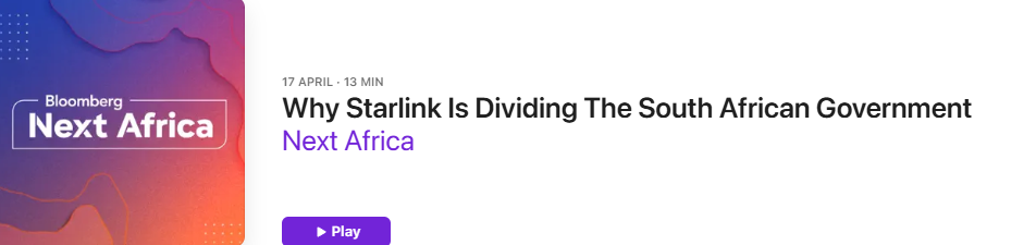On this week’s Next Africa episode, Jennifer Zabasajja is joined by Bloomberg’s Loni Prinsloo and Rivaldo Jantjies to discuss Starlink’s expansion across Africa and its clash with the South African government.