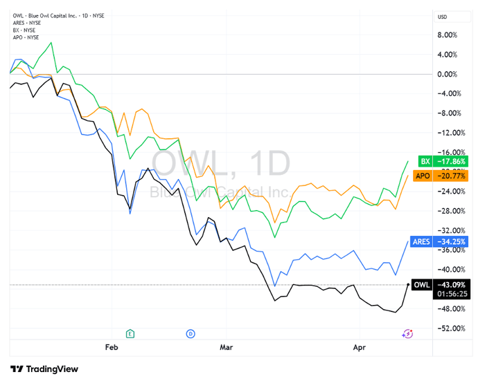 As money flows out, prices will come under pressure. And we’re already seeing that show up in the market. Asset managers heavily involved in private credit – firms like Blue Owl (OWL), Ares Management (ARES), Blackstone (BX), and Apollo Global Management (APO) – are all down double digits this year.