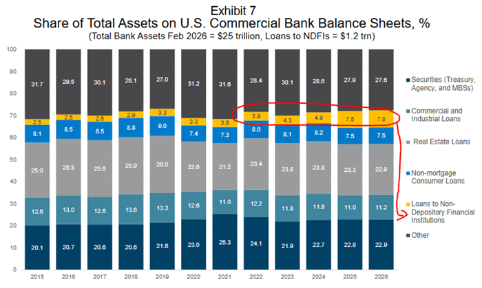 Start with exposure. Bank lending to non-depository financial institutions. This is the primary channel through which private credit could impact the broader financial system. But this kind of debt accounts for just 7.8% of bank balance sheets.