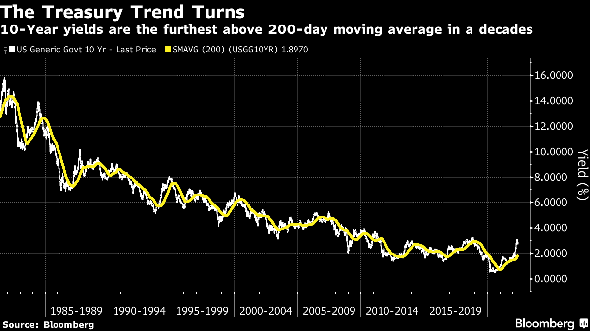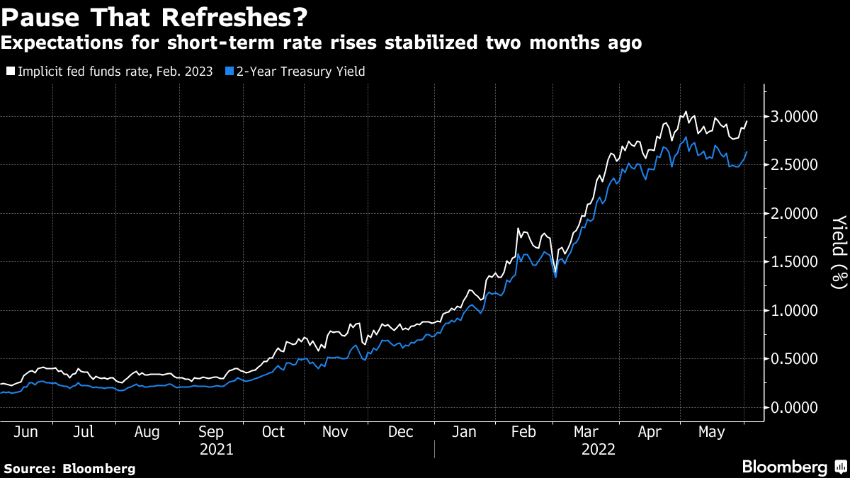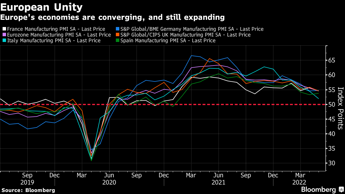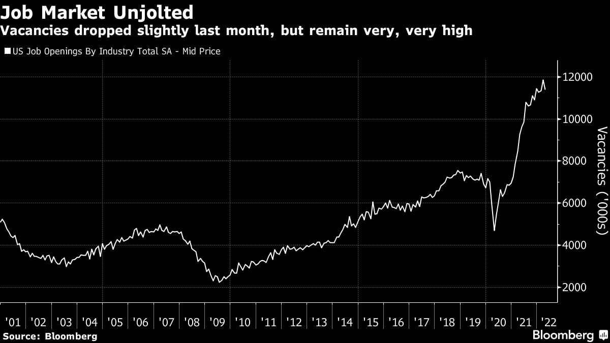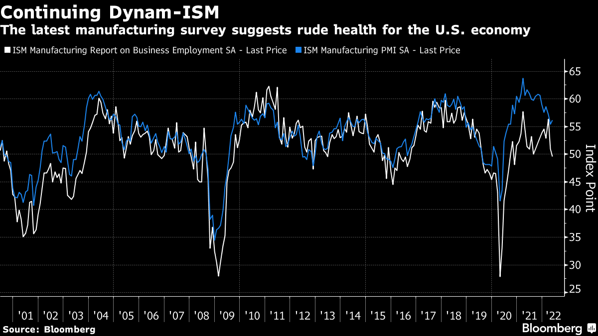 | Everything is inevitable once it's already happened. A few years from now, it will be so obvious where the world economy was heading in the summer of 2022. How could people at the time possibly have been in any doubt? In real time, however, doubt is not only widespread but necessary. And with divergent scenarios ahead of us, markets are priced for an outcome that nobody actually thinks will happen. As is more or less always true, nothing matters more than the 10-year Treasury yield, which sets the "risk-free" rate for transactions around the world. That yield is formed by innumerable transactions by people consciously or unconsciously expressing their view on the long-term direction of the economy. The final number represents a compromise between the views of buyers and sellers. And it ultimately represents a scenario that few believe can occur. The analogy is with the statistical concept of "expected value." That takes each possible outcome multiplied by its probability, and adds them together to find an expected outcome. For example, if you have to draw one of two cards, numbered 1 and 2, then the expected value of the card you draw is 1.5 ((0.5 *1) + (0.5*2)), even though there is zero chance that this number will show up. Similarly, there are two dominant narratives for the bond market at present. One is that inflation continues to mount, without bringing economic disaster in its wake, and so the Federal Reserve and other central banks have no choice but to keep hiking rates. The other is that the Fed swiftly realizes it has "broken something," growth slows sharply, and monetary policy goes into reverse. The former implies bond yields will need to rise significantly from here, while the latter implies that they must fall. As investors wrestle with the evidence, we are left with rates that are very unlikely to be suitable for the outcome that results. As this was the first day of the month, it brought the standard download of monthly data. Mostly, it was consistent with an economy still in decent health with persistent inflation, so bond yields rose again. But they remain distinctly too low if inflation is really going to be as bad as many now fear. Looking at the ISM supply manager data for US manufacturers, the headline index rose slightly — very much against expectations. Its measure of employment dipped below the 50 level that marks the border between expansion and recession, but only just. This measure spent a long time at lower levels than this during the post-crisis decade: Meanwhile, manufacturers' complaints about prices remain historically high. Usually, after a spike like this, prices have swiftly reverted to more normal levels, but not this time. This may be exacerbated by continuing backlogs, although the problem isn't as bad as it was a year ago: As for the job market, at the center of concerns that inflation is going to prove durable, it remains very tight, implying a strong negotiating position for labor. The JOLTS survey of job vacancies in the US fell slightly from month to month, but remains phenomenally high: More surprisingly perhaps, supply manager surveys for Europe also show continuing resilience, despite the drawn-out conflict in Ukraine. Italy is lagging, but the main economies of the region are converging around the level of 55. This isn't an economic boom, but it's far too high to justify the negative overnight rates currently on offer from the European Central Bank: How does this translate into markets? The two-year yield and the fed funds rate implied by the futures market for next February both saw a dramatic surge, or "tantrum," in the first three months of this year, and have since wobbled downward. The market currently expects a fed funds rate of just under 3% after the central bank's meeting early next year, while the two-year is a little lower. That implies tightening, and then rate cuts within two years. This is possible, but most would think rates should be much higher or much lower than that 24 months from now: As for the 10-year yield, which has also retraced some of its advance in the last few weeks, it remains below 3%, after a sharp rise in response to the latest data. The turn down last month awakened hopes that the yield was now going into reverse — but that looks somewhat hopeful. Here is the famous downward trend going back four decades, with its 200-day moving average. The yield has never in all those decades been as far above the 200-day average as it is now. This looks much more of an interruption to the long-term trend than perhaps the most similar incident, the "taper tantrum" of 2013, when a sharp rise in yields tailed off as the Fed retreated by tapering its asset purchases much more gently than had been expected. If the Fed is to retreat again, history suggests it will need to do so soon. Otherwise, it looks as though decades of a steadily declining cost of money might actually be over. It's hard to imagine the 10-year yield moving calmly in a horizontal line from here; the current price is a compromise between those who believe that a new inflationary era has begun, and those who expect the Fed to respond to gravity any day now. Stock markets had a difficult day after strong economic data, which helps show that high rates at this point are regarded as the chief concern. Looking at the first-quarter earnings season and the change it wrought in analysts' expectations for growth in profits and revenues over the full year, there is little or no evidence of concern about an economic slowdown. As this chart from FactSet demonstrates, expectations for 2022 earnings are slightly higher now than they were when the first quarter ended: This is despite nerves in the bond market in that period. Meanwhile revenues, more directly tied to the state of the economy than profits, are also projected for healthy growth of 10.2% for the year as a whole. That's more than was expected at the end of March: But what's fascinating is that even earni