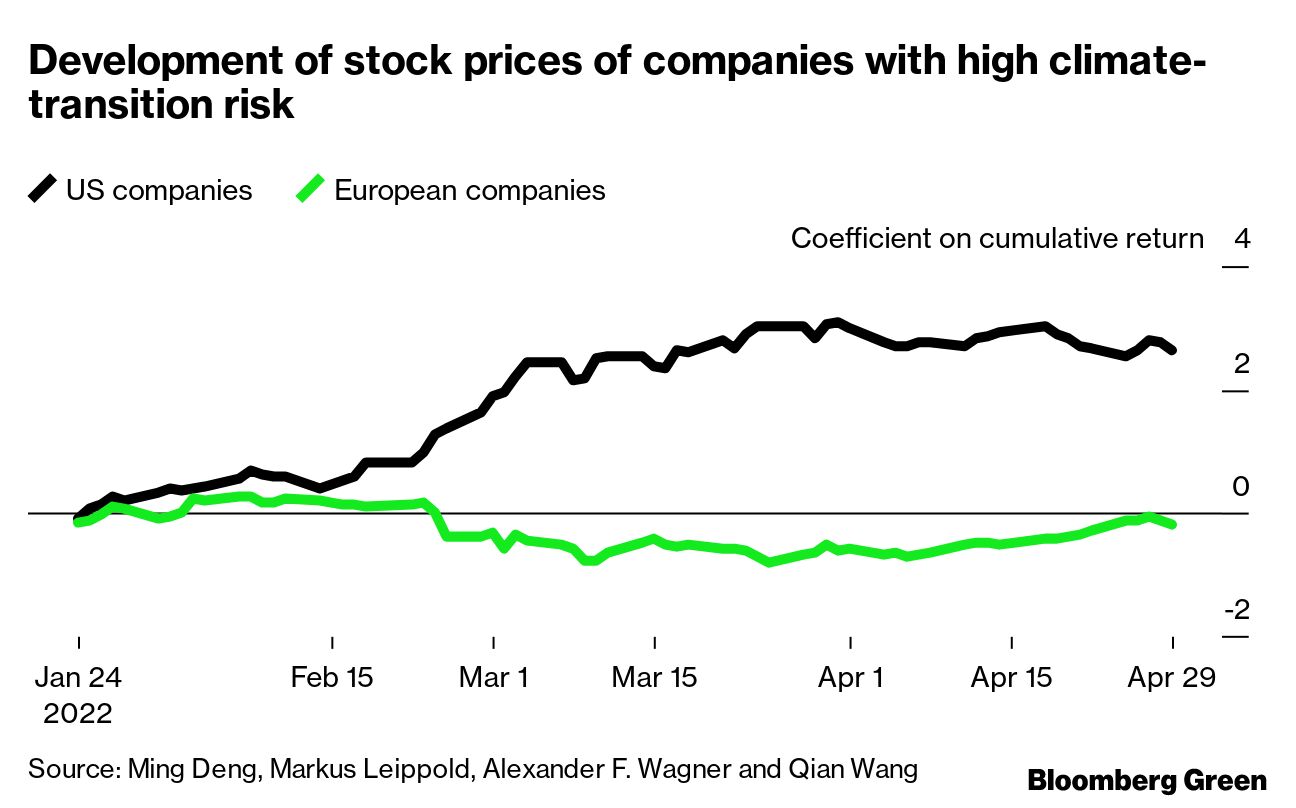 A team of researchers at the University of Zurich and the Swiss Finance Institute tackled the question by looking at companies' stock prices. The results are striking. Stocks of U.S. companies deemed to be most affected by what the researchers call "climate transition risk" soared after Putin's invasion, while those of European companies did not — or, if anything, fell slightly.