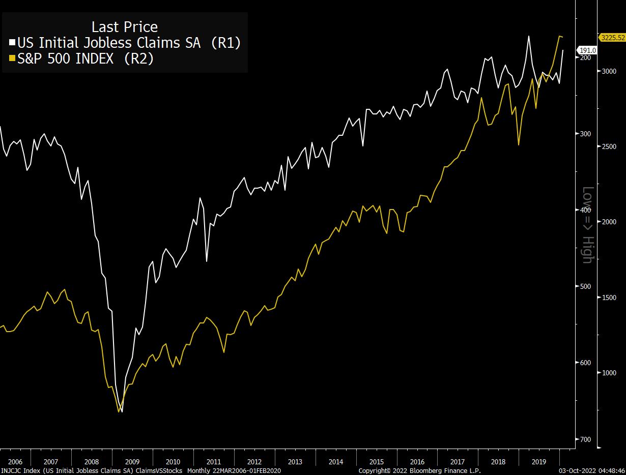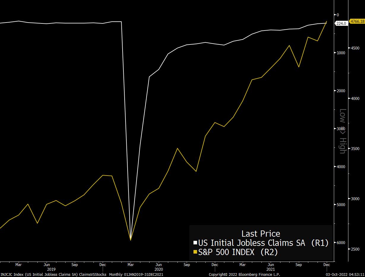 | Credit Suisse woes deepen, the UK makes a u-turn and stocks are upbeat to start the week. Credit Suisse's five-year credit default swaps — a gauge of credit risk — rose to a record while its stock hit a fresh low after the bank's attempts to reassure markets on its financial stability backfired. Chief Executive Officer Ulrich Koerner had sought to calm employees and the markets over the weekend only to see his carefully-worded memo have the opposite effect. While touting the bank's capital levels and liquidity, he acknowledged that the firm was facing a "critical moment" as it worked toward its latest overhaul. The bank sent around talking points to executives dealing with clients who brought up the swaps, according to people with knowledge of the matter. Credit Suisse declined to comment via a company spokesman. Prime Minister Liz Truss dropped a plan to cut taxes for the UK's highest earners just 10 days after it formed a key part of the mini-budget that sent markets into a tailspin. Investors initially welcomed the news, with the pound and government bonds climbing, but those moves quickly unwound. The future is looking uncertain too --options markets are still showing bearish bets, and "the market continues to view the government having something of a fiscal credibility deficit," according to CIBC's Jeremy Stretch. | The incessant rise in the dollar has increased speculation that there will be a global coordinated effort to weaken it. Almost half of respondents in the MLIV Pulse survey believe central banks around the world will conjoin to curtail a rally that has taken the dollar 13.9% higher this year. Meanwhile, two-thirds of respondents believe the Bloomberg Dollar Spot Index will climb to yet new highs over the next month. Japan has already intervened to try to stem the fall in its currency versus the dollar, with 42% of survey respondents expecting the country to intensify its unilateral intervention efforts. The dollar's ascent is also expected to squeeze US earnings, with almost 90% expecting this to become apparent in third quarter results. European stocks and US futures have bounced off session lows yet soured sentiment dominates as the fourth quarter begins. S&P 500 futures trade about 0.1% higher while tech-heavy Nasdaq 100 contracts slip about 0.3% as of 6:15 a.m. New York time. In Europe, Stoxx 600 declined about 0.8% as tech, industrial goods and financial services lagged while energy outperformed. Treasuries across the curve rallied, led by the short-end. The Bloomberg Dollar Spot Index is 0.1% firmer. Oil rallied on prospects of an OPEC+ oil production cut. Manufacturing data is in focus today, with the S&P Global print at 9:45 a.m. and ISM at 10 a.m. The ISM data include prices paid and new orders. Canada also has S&P Global manufacturing PMI. The Fed's Raphael Bostic and John Williams speak. There's also light vehicle sales. Here's what caught our eye over the weekend: Hello, and welcome to Jobs Week. This Friday we get the September Non-Farm Payrolls report, where 250K jobs are expected to have been added. And also this week we'll get a JOLTS number and initial jobless claims. So a big week for labor data all around. But let's talk about initial claims for a second. For years after the Great Financial Crisis, this was one of my favorite charts. It shows the S&P 500 vs. weekly initial jobless claims (reversed, so that up is fewer). And while no two lines are ever perfect, they broadly moved in the same direction at the same time. As claims improved, stocks improved. And both had some rough patches at the same time. 2011 there was a significant weakening of jobless claims (lots of double dip recession talk that year) and a selloff in the stock market. Similar story with 2018 and 2019. Some hiccoughs at the same time in the same direction. The relationship even held during the 2020/2021 craziness, with the S&P 500 bottoming the same week as initial claims hit their worst point. But now the relationship is gone. Initial jobless claims have been improving ever since the middle of the summer, and yet the market has been tanking. In fact last Thursday was a particularly brutal day for the market, right after initial jobless claims came in sub-200K, stocks fell by roughly 2%. In the post-GFC environment, good news was good news. As the labor market continued to heal, stocks went up in a fairly straightforward manner. In 2022, labor market strength is simply seen by the market (in part because of Fed messaging) as simply worsening the inflation picture. And so "good news" (on the jobs front) is no longer a welcome development for investors. Follow Bloomberg's Joe Weisenthal on Twitter @TheStalwart |