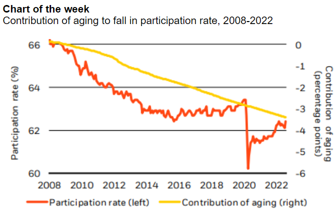 The US economy is going to struggle to beat back inflation because some older workers are never returning to the labor market, according to a BlackRock analysis. As of October, 1.3 million people have left the workforce after turning 64. Another 630,000 people didn't wait to hit that age before quitting. "The effect of this demographic shift on participation won't reverse without massive structural changes in workforce behavior over time," BlackRocks's analysts said in a report. "That implies the workforce will keep shrinking relative to the population. Economic activity will need to run at a lower level to avoid persistent wage and price inflation, especially in the labor-heavy services sector."