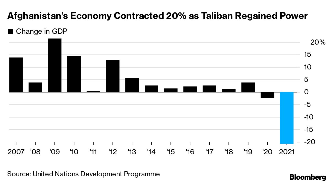 —Simon Kennedy Afghanistan's economy faces little chance of aid given the Taliban's failure to break its international isolation since seizing power last year. The UN Development Program says the economy will shrink 5% in 2022 after contracting 20% last year, while the country's per capita income is projected to decline by 30% to $360 in 2022. At the same time, the cost of essential items such as food and fuel have climbed by about 40%, it says. "An isolated Taliban regime has a direct impact on the country's economy," said Madiha Afzal, a fellow in the foreign policy program at Brookings. "Beyond its frozen foreign reserves, it also finds itself unable to get development aid, something the previous Afghan government was heavily reliant on."