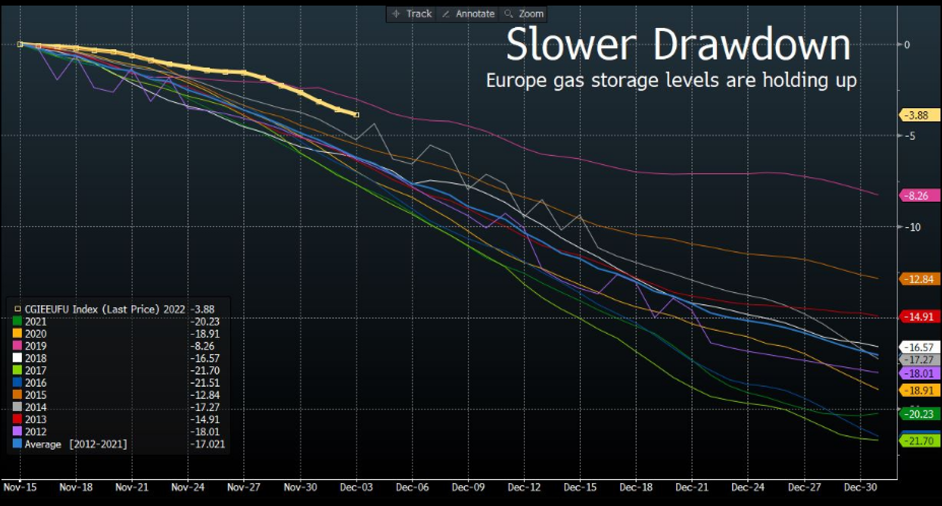 | Good morning. Metals tariffs to help fight carbon emissions, Covid cases falling in China, Deutsche Bank mulls jumping back into residential mortgage-backed securities and coming to grips with debt among European landlords. Here's what people are talking about. The European Union and the US are considering using new tariffs on Chinese steel and aluminum as part of a bid to fight carbon emissions and global overcapacity, according to people familiar with the matter. The idea, generated within President Joe Biden's administration, is still in an initial phase and hasn't been formally proposed, according to the people. US aluminum and steel producers climbed in extended trading, while in Hong Kong, Aluminum Corp. of China and China Hongqiao Group Ltd. slipped. China is reporting fewer Covid-19 cases as a wave that started to accelerate last month appears to be tailing off amid a pullback in the sweeping testing regime that saw a negative result needed to even enter a public park. Beijing no longer requires negative tests from people wanting enter a range of public venues, following cities from financial center Shanghai to tech hub Shenzhen in dialing back testing requirements. | Deutsche Bank is considering a return to trading residential mortgage-based securities as part of a strategy to expand the markets business that has driven much of its recent growth. Trading head Ram Nayak has floated the idea internally as another potential step in his plan to build out the fixed income and currencies unit without the need for many additional resources, people familiar with the matter said. Chief Executive Officer Christian Sewing is looking for ways to keep the momentum at the fixed-income unit as the favorable market conditions of the past years are expected to normalize. The sudden end to the cheap money era is drawing fresh scrutiny to how European landlords account for their debt loads. At issue is more than $21 billion of hybrid bonds that are treated as equity, not debt, under international accounting rules. The debate around those securities intensified last week after one of Europe's largest landlords, Aroundtown SA, declined an early redemption option on one of its hybrids and said it will review whether to defer coupon payments. European stocks are tipped to follow global shares lower after surprisingly strong US services data supported bets for a higher Fed terminal rate. The first ever EU-Western Balkans summit takes place in Tirana, Albania. ECB Vice President Luis de Guindos speaks. Commodities giant Glencore hosts an investor day. Expected data include German factory orders for October. Ashtead, Ferguson and AutoZone report earnings. This is what's caught our eye over the past 24 hours. With winter now truly making itself felt in Europe, and temperatures dropping below early-December averages in parts of the region, storage levels in natural gas reservoirs remain a key issue. We already looked at inventories rising above seasonal averages in this column last week. What's impressive, though is how well they're holding up, falling only 3.9 percentage points since mid-November as seen in the chart, the second-slowest pace in the last decade (bar 2019). High gas prices, with the benchmark first-January TTF contract trading 850% above where it was two years ago, providing a possible explanation. Gas demand has fallen on a weather-adjusted basis as consumers wrap up in snug blankets rather than turn up the heating, and companies opt for alternative energy sources. All of which suggests the worst case will be averted. It's worth bearing in mind, though, that gas prices probably won't come back down to their pre-Ukraine-invasion averages. If that were to happen, the price incentive attracting additional flows to Europe via LNG terminals would be erased, and consumers would turn on the heating again. So while the outlook is good, we might as well accept the new normal of higher energy prices for the foreseeable future. Eddie van der Walt is Deputy Managing Editor of Markets Live in London. @EdVanDerWalt Who is right about the outlook for the US economy, JPMorgan, Morgan Stanley or Dr. Doom? And which investor has the best tweets? Let us know, fill out our latest MLIV Pulse survey. |