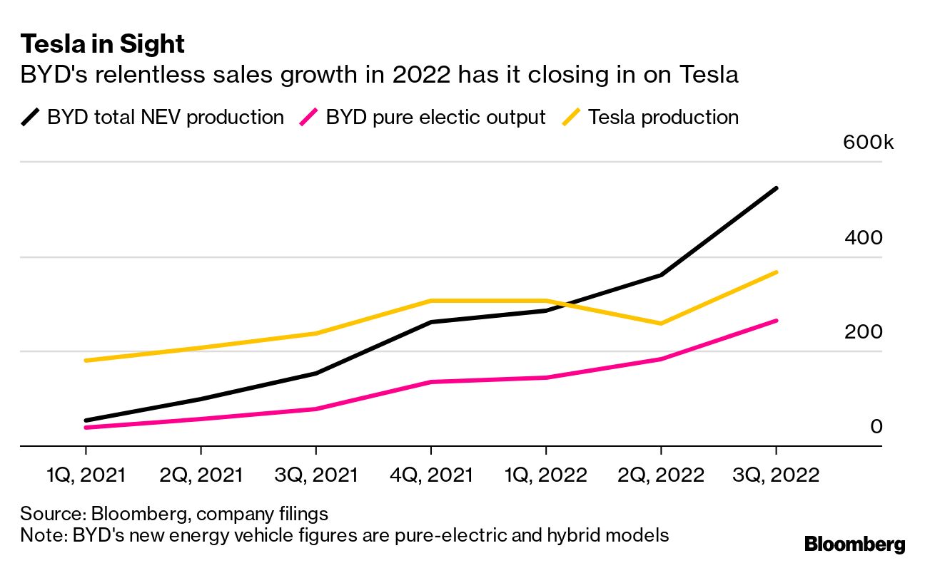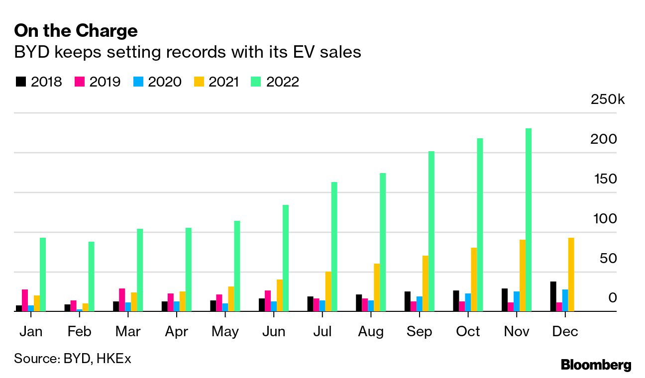 Hello, it's Danny Lee bringing you today's newsletter from Hong Kong. Covid lockdowns, supply chain woes and power shortages hampering China's auto industry haven't been enough to halt BYD's relentless advance to dominate the world's biggest electric-vehicle market. Now, it has Elon Musk's Tesla in its sights. The Berkshire Hathaway-backed automaker will enter 2023 on a roll, with record vehicle sales, revenue and profitability, driven by the appeal of its affordable cars in China's mass market. It's now making a play for cashed-up buyers in the premium end of the market with two luxury brands, pitting itself against Tesla's pricier cars. "The two segments BYD doesn't have exposure to are the luxury SUV and sports car markets, which we expect BYD will expand into in 2023," says Bridget McCarthy, head of China operations for green tech-focused US hedge fund Snow Bull Capital. "These are the two most profitable vehicle segments, so bottom-line growth in 2023 will excite investors." The first of the two new brands, Yangwang, will launch in the first quarter, targeting affluent professionals with promises of high performance and disruptive technologies. More intriguingly, BYD also is touting a new brand that it says will be "grounded in highly professional and personalized identities" to cater to the "diversified demands" of customers. It's said little more about the brand beyond that. After ceasing production of combustion engine-only cars earlier this year, BYD "has now established itself unequivocally as the market leader in the race to electrification, and I believe it will parlay that into a multi-brand strategy," says Bill Russo, founder and CEO of Shanghai-based advisory firm Automobility. "They'll be a pioneer if they do." BYD's Han sedan. Photographer: Nathan Laine/Bloomberg The new brands also happen to be the kind of EVs fit for the US, a market BYD has yet to enter with its ever-growing electric lineup. Russo also expects the hardware-driven BYD to embrace software in a big way, as it's an area seen as a shortcoming. "What BYD lacks that others have is more of a digital DNA," he says. "BYD is still a hardware company. As good as it is assembling an EV profitably at scale, it hasn't proven itself to be a tech-driven software-defined technology company." The Chinese EV giant has managed to withstand most production disruptions, in part thanks to its vertically integrated supply chain. Production and deliveries hit another record in November, topping 230,000 vehicles. The rise and rise of BYD puts it on course to match and maybe even exceed Tesla in pure EV car sales by the first quarter of next year. With critics pointing to BYD's lower levels of revenue and profitability versus Tesla, the Shenzhen-based juggernaut may close that gap with by broadening its lineup with more top-end vehicles. "Can the Chinese in a hypercompetitive market establish a sustainable premium price position with Chinese consumers?" asks Russo. "It hasn't been done sustainably." A Volkswagen ID. Buzz electric van. Photographer: Krisztian Bocsi/Bloomberg The pivot to electric vehicles has spurred demand for a new breed of auto workers: software coders. Monica Raymunt reports that VW is considering funding coding schools in Mexico and Brazil, adding to similar institutions in the Czech Republic and Germany. Europe's biggest automaker is trying to get its tech push back on track after software development hiccups at its Cariad unit delayed several models, including an all-electric Porsche Macan. Cariad will be part of an autonomous-driving venture in China and has hired roughly 1,500 coders this year.