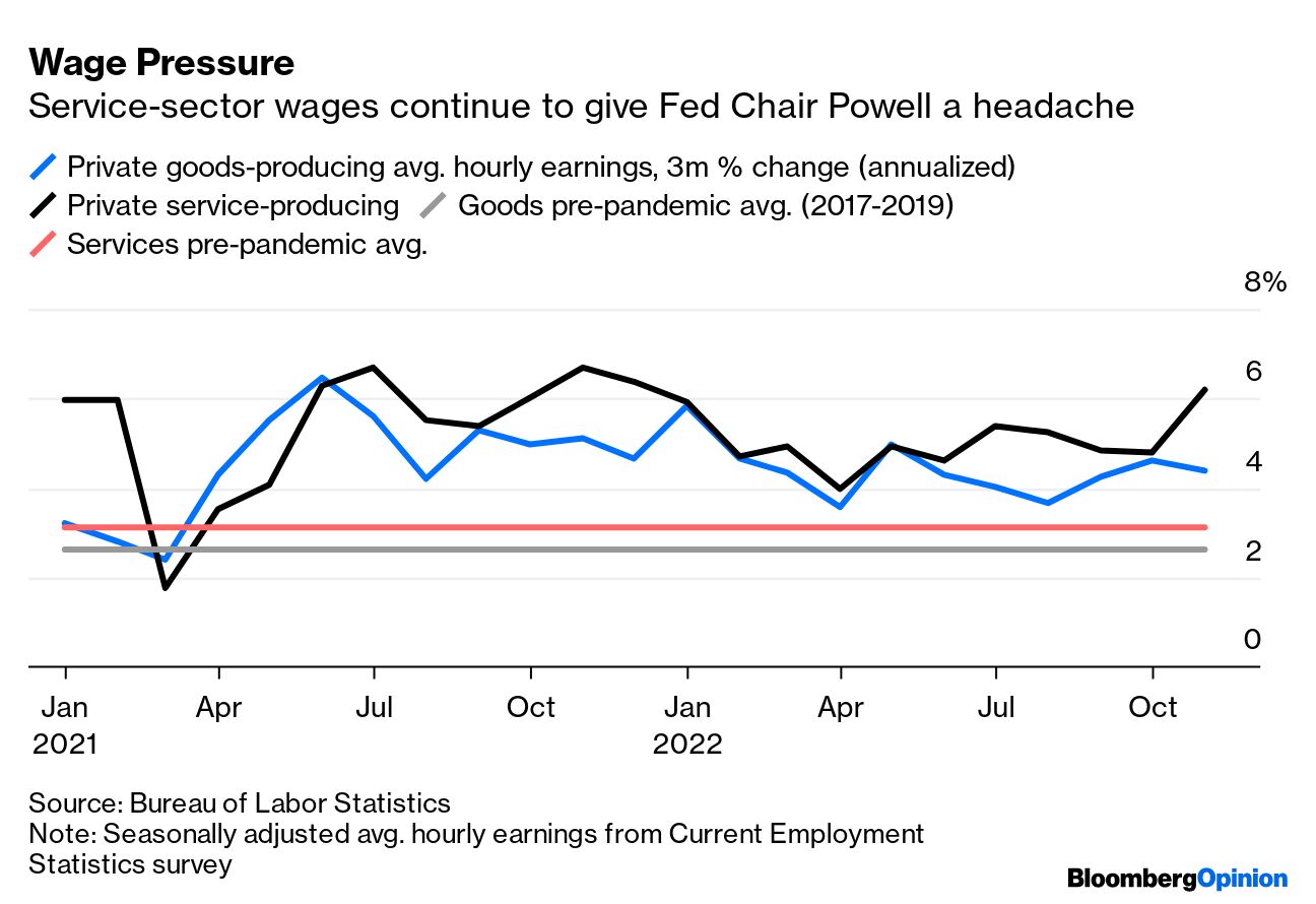 | 2022 has felt, in a multitude of ways, like a decade by itself. Economically, Americans are feeling bruised by inflation; a hot housing market was thrown into turmoil by a spike in interest rates (which are already falling again); and massive tech layoffs have other sectors worried about job cuts, too. Just in time, the monthly jobs numbers! What else but a robust November report showing nonfarm payrolls increased 263,000, paired with rising wages? Such a jobs landscape paired with the Federal Reserve's rate increases has markets in fits. But as Jonathan Levin writes, "the service sector is probably the most vexing piece in the US inflationary puzzle." How will the Fed will react to Friday's jobs data — particularly service-wage inflation? Here's what else Bloomberg Opinion writers have had to say this week on recession worries, lingering inflation and managing economic expectations. This is the Theme of the Week edition of Bloomberg Opinion Today, a digest of our top commentary published every Sunday. |