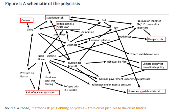 | Hello. Today we look at inflation at times of economic stress, how movie stars react to taxes, and what's happening in the world economy this week. December marks the moment when "words of the year" are declared. According to a recent report from Merriam-Webster, the choice of 2022 is "gaslighting." However, among the economics community there would be a good case to be made for "polycrisis." Mentioned by Jean-Claude Juncker during the euro crisis of the last decade, it's since been popularized by Columbia University's Adam Tooze, a prolific commentator on the recent swirl of global economic turmoil. The term refers to when the world faces multiple overlapping crises which, when combined, are more dangerous than the sum of the parts. So a pandemic or war, both of which we've witnessed lately, has many knock-on effects. Here's a chart Tooze used earlier in year to illustrate the thinking: Now, fresh from the printers and already proving popular on social media is an attempt to explain what happens to inflation in a world of "overlapping emergencies." Written by economists including Isabel Weber of the University of Massachusetts Amherst, the paper looks at how sector-specific shocks relate to overall price stability and so can be labeled systemically significant. A review of how prices performed over 71 sectors amid the pandemic and Russian war, finds these to be the most sensitive: - Energy