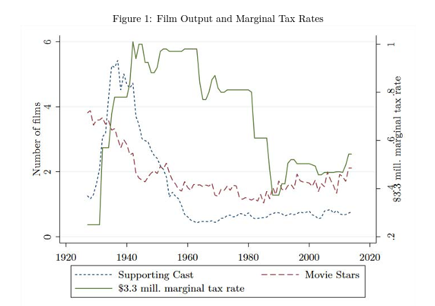When Ronald Reagan was a movie star he claimed he stopped making films at some point each year to avoid the top tax bracket. In a bid to see if gradually higher tax rates do impact the supply of labor, economists Daniel Keniston and Abigail Allison M. Peralta looked at Hollywood, home to consistently high-earning groups of workers. Contrary to Reagan's claim, they found no relationship between high-income taxes and the amount of movies shot by the stars. However, they did find that when taxes are high, actors make more "prestige" films, namely high-rated ones which involve collaborating with award-winning directors. "This pattern suggests that high taxes cause high-earning performers to value quality over more remunerative 'blockbuster' films," the authors said in the study circulated by the National Bureau of Economic Research.