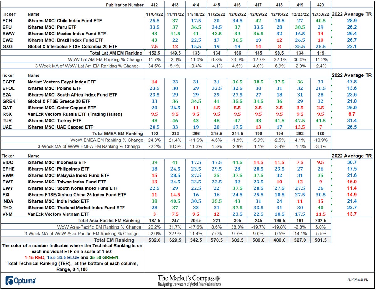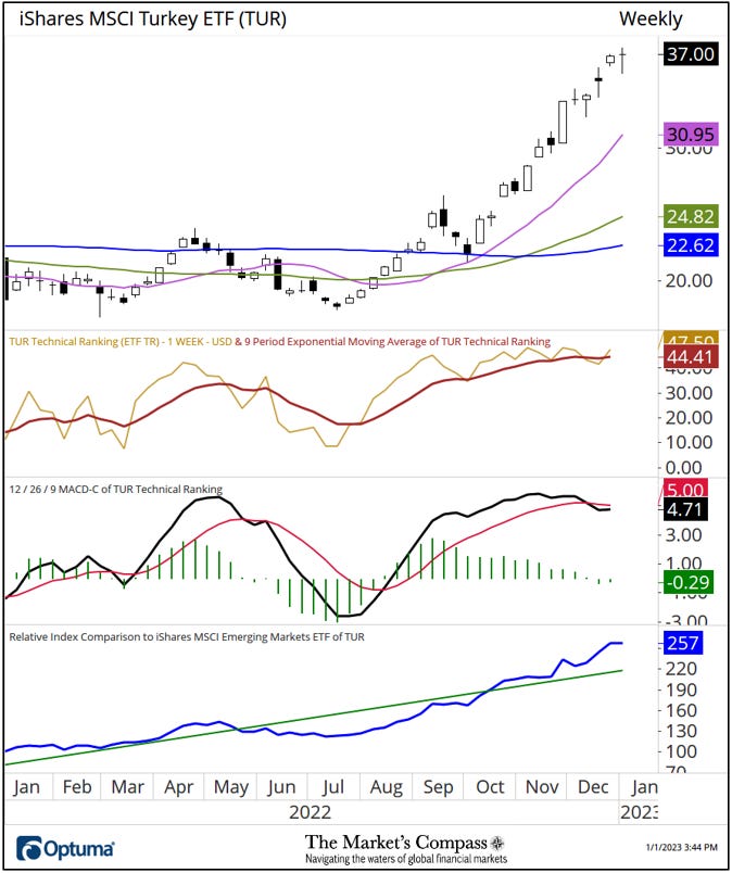 Welcome to the first ETF Study Excerpt of 2023, The Market’s Compass Emerging Market’s Country ETF Study, Week #420. It will highlight the technical changes of the 22 EM Country ETFs that I track on a weekly basis and publish every third week. Paid subscribers will receive this week’s unabridged Emerging Market’s Country ETF Study sent to their registered e-mail. Consider becoming a paid subscriber at $10 a month or $100 per year. Free subscribers will continue to receive an excerpt of the full version. Past publications can be accessed by paid subscribers via The Market’s Compass Substack Blog. Next week we will be publishing the The Market’s Compass US Index and Sector ETF Study. Last Week’s and 8 Week Trailing Technical Rankings of the Individual EM ETFs The Excel spreadsheet below indicates the weekly change in the Technical Ranking (“TR”) of each individual ETF. The technical ranking or scoring system is an entirely quantitative approach that utilizes multiple technical considerations that include but are not limited to trend, momentum, measurements of accumulation/distribution and relative strength. If an individual ETFs technical condition improves the Technical Ranking TR rises and conversely if the technical condition continues to deteriorate the TR falls. The TR of each individual ETF ranges from 0 to 50. The primary take away from this spread sheet should be the trend of the individual TRs either the continued improvement or deterioration, as well as a change in direction. Secondarily, a very low ranking can signal an oversold condition and conversely a continued very high number can be viewed as an overbought condition, but with due warning, over sold conditions can continue at apace and overbought securities that have exhibited extraordinary momentum can easily become more overbought. A sustained trend change needs to unfold in the TR for it to be actionable. The TR of each individual ETF in each of the three geographic regions can also reveal comparative relative strength or weakness of the technical condition of the select ETFs in the same region. The largest drop in the three EM Region Total Rankings since the week ending December 9th was in the Lat-AM region which fell -17.93% to 119 from 145. That is followed by a slightly lesser loss of -17.35% in the Asia-Pacific Region Total Technical Ranking which fell to 202.5 from 245. The EMEA Region Total Technical Ranking lost ground over the same period but dropped less, -9.55% to 180 from 199. The Total EM ETF Technical Ranking fell -14.86 to 501.5 from 589 over the same period. Regular readers will notice that we have added a new column to the spread sheet posted above. That column shows the average TR reading of each of the 22 EM ETFs since the start of last year. The best TR average reading over the 12 month period was registered by the iShares MSCI Turkey ETF (TUR) at 30.7. We have highlighted the positive technical condition of the TUR several times over last year. As can be seen in the chart below and in panels that follow, the TUR has far outpaced the other 21 ETFs we track in these pages in 2022 and has been a relative outperformer vs. the EEM (note the linear regression line in green in the lower chart panel). We do note, there are early signs that there has been a slowing of upside momentum as witnessed by MACD. To receive a 30-day trial of Optuma charting software go to… Data is courtesy of Bloomberg. I invite readers to contact me with any questions, comments, or suggestions at… tbrackett@themarketscompass.com |