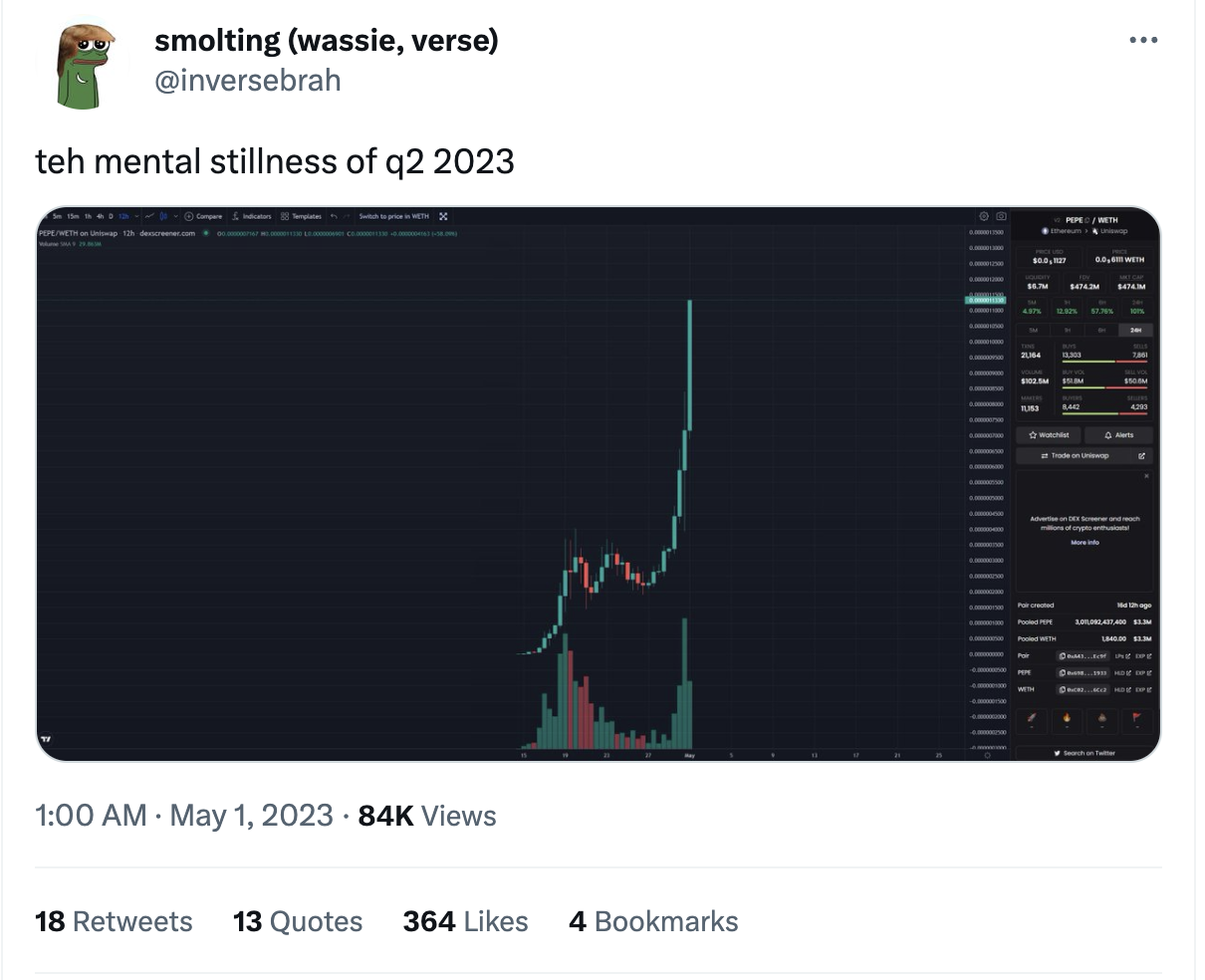 BTC and ETH have retraced over the past 24 hours but remain in the same range as the past month. Traders making plays on majors over the past few weeks have been getting chopped to death when all they really had to do was long PEPE.