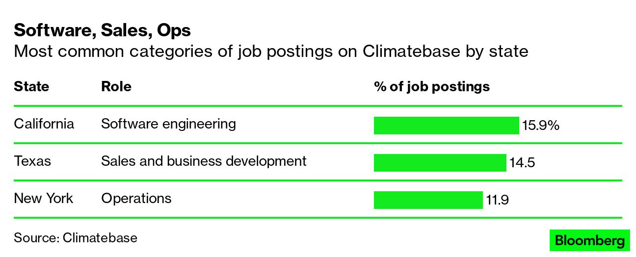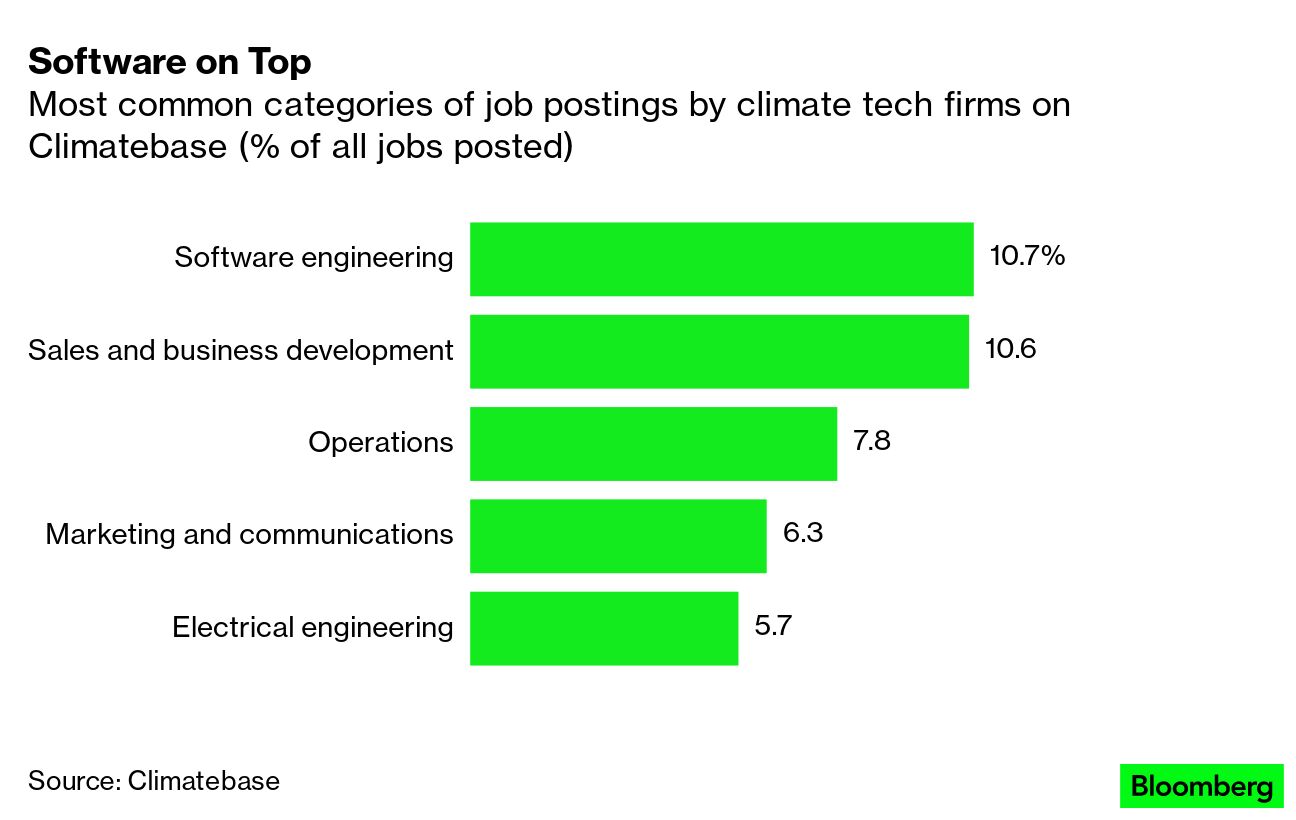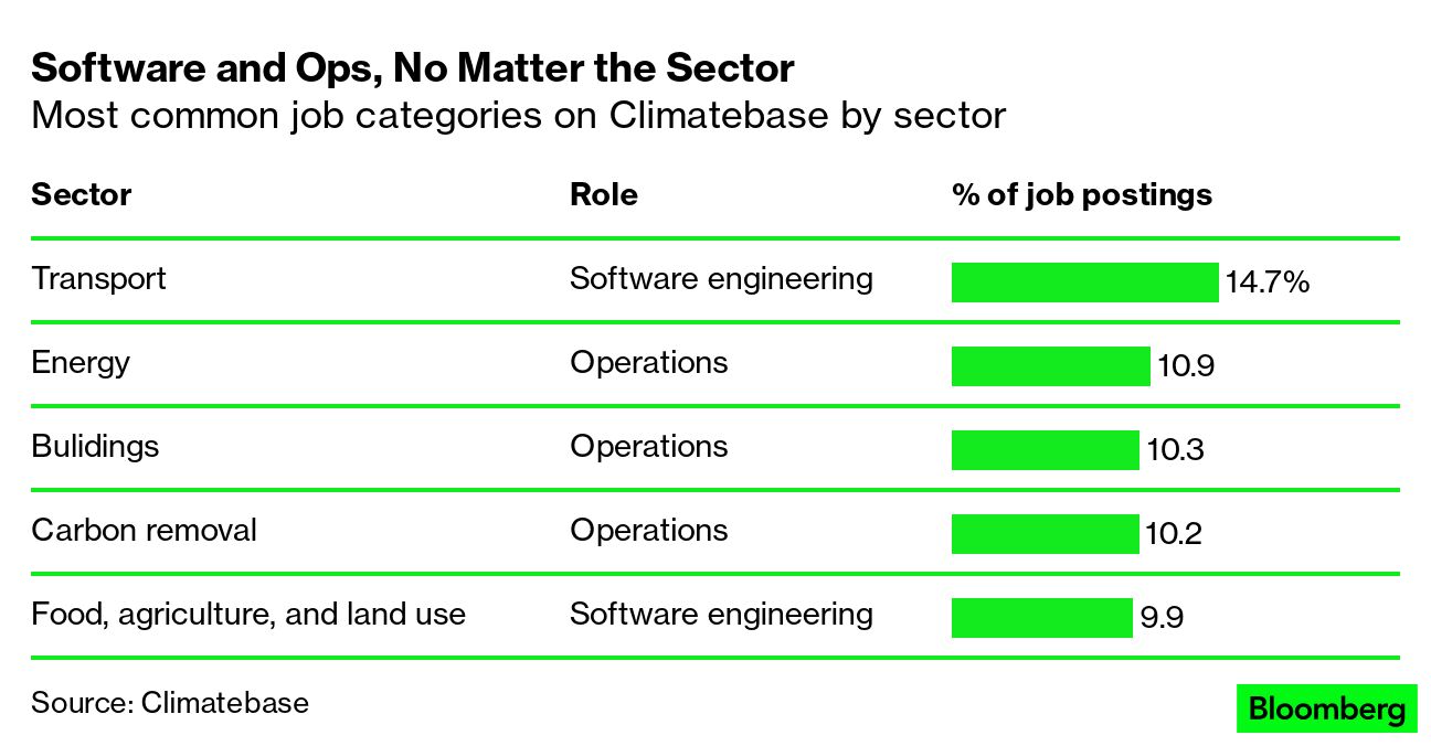 | By Nathaniel Bullard Since the start of 2023, more than 700 tech companies around the world have laid off a total of almost 200,000 employees. Tech employment in the US, however, was as of late March still about 7% above its level before the pandemic. And for tech workers who want to put their skills to use outside their traditional fields, climate companies are hiring across the board. Global hiring and networking site Climatebase has posted more than 46,000 jobs from over 1,500 organizations (both for- and not-for-profit) over the past two years. Certainly, highly technical jobs related to the science of climate mitigation and adaptation are in high demand. But so too are roles familiar from any global business. It is mostly these roles that climate tech firms seek to fill, according to data that Climatebase shared with Bloomberg Green. Across all the job postings shared on the site from Jan. 1, 2021 through May 14, 2023, the single most in-demand category was software engineering. But the next three were more general in nature: sales and business development, operations and marketing and communications. The fifth was electrical engineering. If we consider the fact that software and electrical engineering are both quite general as technical roles are concerned, then none of the job roles that are in highest demand in climate tech are necessarily climate-specific. At least a quarter of all job ads on the site have been for roles that are highly interchangeable not only across companies, but across sectors. However, there are still important distinctions among key hiring regions in the US. In California, software engineering is the most in-demand kind of role. In Texas, it's sales and business development, while in New York it's operations. California stands out as an engineering-heavy jobs market, with mechanical and electrical engineering also making the state's top five. There are also sector-specific distinctions within climate tech. Transport-related businesses, and those specializing in food and agriculture, seek software engineers above all. But in the energy, buildings and carbon removal sectors, operations talent is most in demand. Distinct categories pop out in some sectors' listings: Human resources ranks fifth for food and agriculture, while for buildings, design comes fifth. Key jobs may be in demand across climate companies, but that doesn't mean they're easy to fill. Hiring for engineering roles, whether software, mechanical or electrical, takes at least three months, according to Climatebase. Human resources jobs take 100 days to fill on average. The hardest roles to fill? Data science and analytics, which take an average of nearly four months. The picture this data paints is nuanced. Different sectors have some key in-demand skills, as do specific regions of the US. Analytics and software roles are hard to fill, universally — and so for that matter are human resources jobs. But more important than the differences in what climate tech firms are looking for in their hiring pool are the similarities. Software engineering experience is needed everywhere; so too is operational expertise. This should be heartening news to those hoping to break into climate tech. Deeply technical skills are essential for founding deeply technical companies. But growing those companies demands the same general business roles, and skills, that any successful enterprise does. Nat Bullard is a senior contributor to BloombergNEF and writes the Sparklines column for Bloomberg Green. He advises early-stage climate technology companies and climate investors. |
