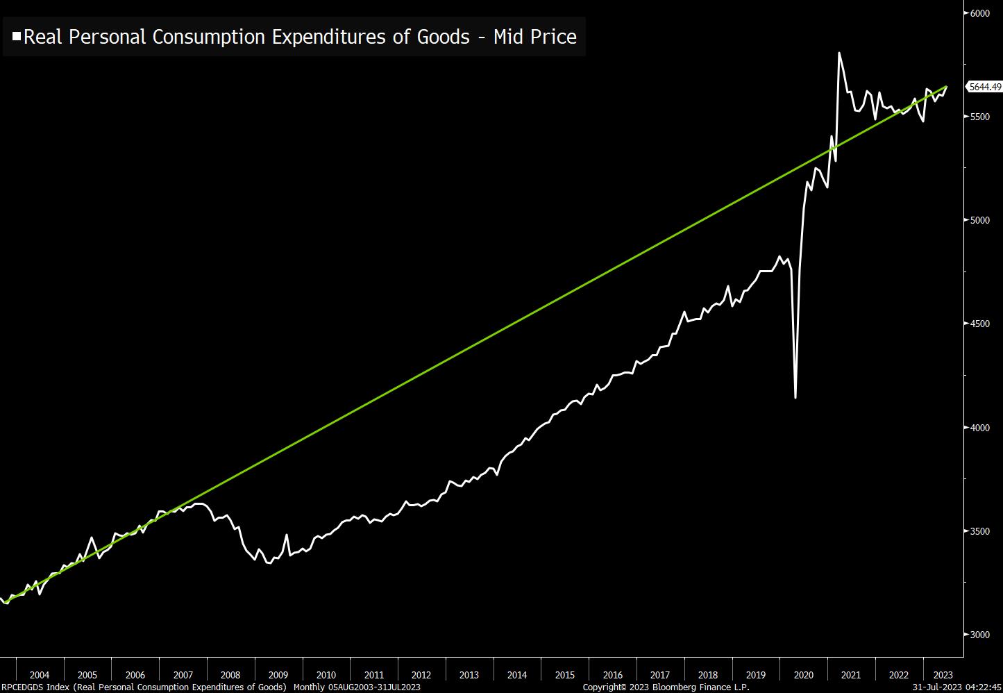 | US equities follow the 2019 playbook, China stops short of direct consumer support and investors are skeptical of the artificial intelligence hype. — Kristine Aquino US equities are tracking the same path they did in 2019, when investors saw a 29% return in one of the best years for the S&P 500 over the past decade. That's according to Morgan Stanley's staunch bear, Michael Wilson, who noted the rally a few years ago was "driven almost exclusively by multiple and not earnings." Wilson correctly predicted the selloff in stocks in 2022, though his bearish outlook is yet to materialize this year. He said his team is open to the view that the economy could eventually enter a new upturn cycle. Still, "we'd like to see a broader swath of business cycle indicators inflect higher, breadth improve and front-end rates come down before adjusting our stance in this regard," Wilson added. China is seeking to boost consumption to spur the economy's recovery, although the government has stopped short of providing direct fiscal support to consumers and companies to increase spending. The nation's top economic planning agency released a wide-ranging policy document Monday, which focuses on removing government restrictions on consumption, such as car purchase limits, improving infrastructure and holding promotional events like food festivals. Latest figures showed consumption-related growth is waning in China. Survey data showed weaker services activity in July than in June, while separate data from China Beige Book indicated consumers cut back on spending on everything but travel and restaurants last month. Investors are betting the great tech rally of 2023 has staying power, with 77% of the 514 respondents in a Bloomberg survey saying they plan to either increase their exposure to technology stocks or keep it steady over the next six months. Yet they're not going all in on artificial intelligence — half are disinclined to pay out of their own pocket for AI tools to aid their personal or business life, while a majority of firms aren't planning on using them for trading or investing ahead. "Right now, the near-term hype is over its skis," said Ted Mortonson, a technology strategist at Robert W. Baird & Co. US equity futures were little changed as of 5:49 a.m. in New York. The Bloomberg Dollar Spot Index pulled back from earlier highs, boosting most Group-of-10 currencies. Treasury yields edged higher, mirroring moves in UK and European bond markets. Gold drifted lower, while oil climbed and Bitcoin rose 0.3% Chicago Federal Reserve President Austan Goolsbee speaks in an interview on Yahoo! Finance Live at 9:20 a.m., while Dallas Fed will publish its manufacturing gauge at 10:30 a.m. and the Fed will release senior loan officer opinion survey at 2 p.m. Earnings include ON Semiconductor, Arista Networks. Here's what caught our eye over the past 24 hours: When the Global Financial Crisis hit, there was a huge negative shock to economic output. Numerous charts started to look like this one, where the whole growth trend shifted down onto a lower trajectory. It was popular in those years to accept that this loss of output, or potential output, was inevitable or justified. After all, 2004, 2005, 2006, 2007... those were housing bubble years right? Surely that growth rate must've been unsustainable. Obviously you can't just go back to the old trendline right? But if you think about it for more than 5 minutes, the acceptance of lower output never made much sense. All the labor and raw materials that existed in 2006.... it still existed in 2010. Yes, there were certain aspects of housing finance that created a run on the banking system. But from a production standpoint, whatever capabilities we had pre-crash still existed post-crash. There's a great line from Keynes "Anything we can actually do, we can afford." Perhaps it sounds tautological, but it's not. We had the real resources to keep building, we just stopped doing it. And then of course over the following decade, the whole idea of what was "unsustainable" got turned on its head. It wasn't all of the housing construction of the mid-aughts that was unsustainable. It was the lack of housing production in the 2010s that turned out to be unsustainable. That lack of production still haunts would-be homebuyers and the broader economy right now. Bringing things forward to today. We've been on a pretty nice run of economic data lately. And the world has woken up to a new type of chart. Alex Williams of Employ America has deemed it The Frying Pan Chart. The charts look like this. And it's such a good name, it is certainly going to stick and be a defining chart of this moment. Old trends from pre-crisis are beginning to re-assert themselves. Here's another Frying Pan Chart that was surfaced by Joel Wertheimer on Twitter. Real Goods Consumption has been gathering steam again and seems to be meaningfully above the 2010s trajectory. Sitting here today in the middle of 2023, looking at charts like these, it seems at least possible, that the money cannon originally fired by Trump and Mnuchin and then followed up by Biden and Yellen, not only knocked cold the Covid recession, but has begun to erase the costly lost output of the post-GFC period. Recessions may be inevitable, but that doesn't mean we have to accept that each downturn permanently curtails our economic capacity. Follow Bloomberg's Joe Weisenthal on Twitter @TheStalwart. |