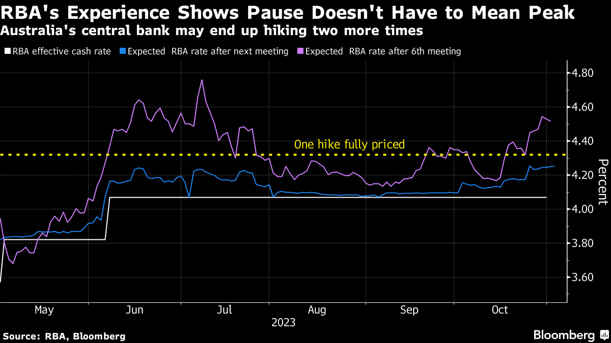 Investors are busy cheering the Federal Reserve's more cautious stance, which looks to be cementing the perception that the US central bank's cash rate has reached its peak. That may be a step too far, given how much concern policymakers expressed in their statement about the need to be vigilant on inflation amid still-strong economic indicators. Australia's example on this front offers a cautionary tale. The Reserve Bank has been among the more dovish among developed-nation peers, outside Japan, and yet it's strongly expected to raise interest rates next week to end a four-meeting pause — and then the building consensus is it will hike again in 2024. The central bank Down Under interrupted its tightening cycle amid signs of softer consumer demand and concerns about surging mortgage rates, and the potential for a delayed impact from 400 basis points of hikes. But with elevated inflation and a strong jobs market, the RBA is seen as having no choice but to act. The Fed's situation is different, but similar. It cited concerns about soaring yields and policy lags as it held rates on Wednesday. The market looks to be underpricing the potential that it too will end up being pushed into fresh hikes. |