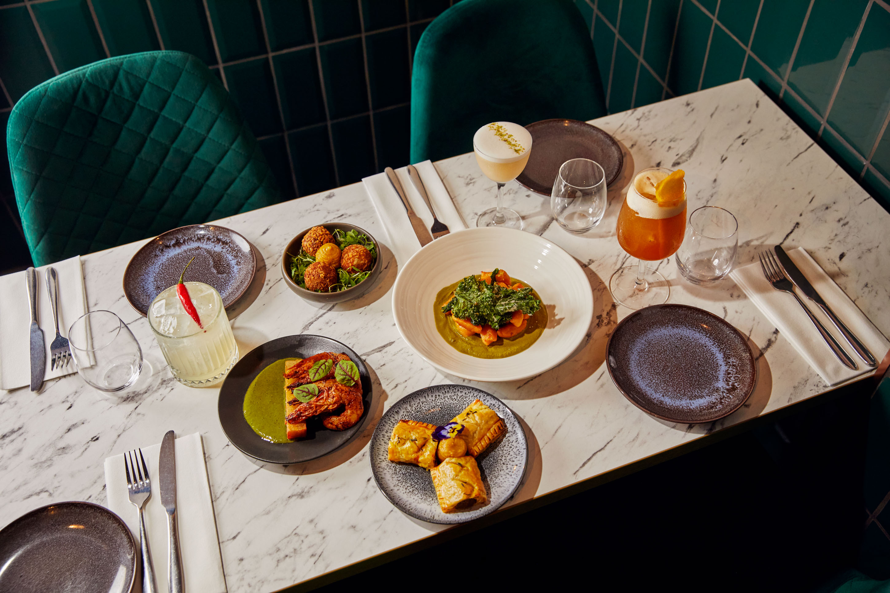 A range of dishes, including curry goat sausage rolls, prawns and sweet potato gnocchi at Wood & Water. Photographer: Emli Bendixen for Bloomberg Pursuits