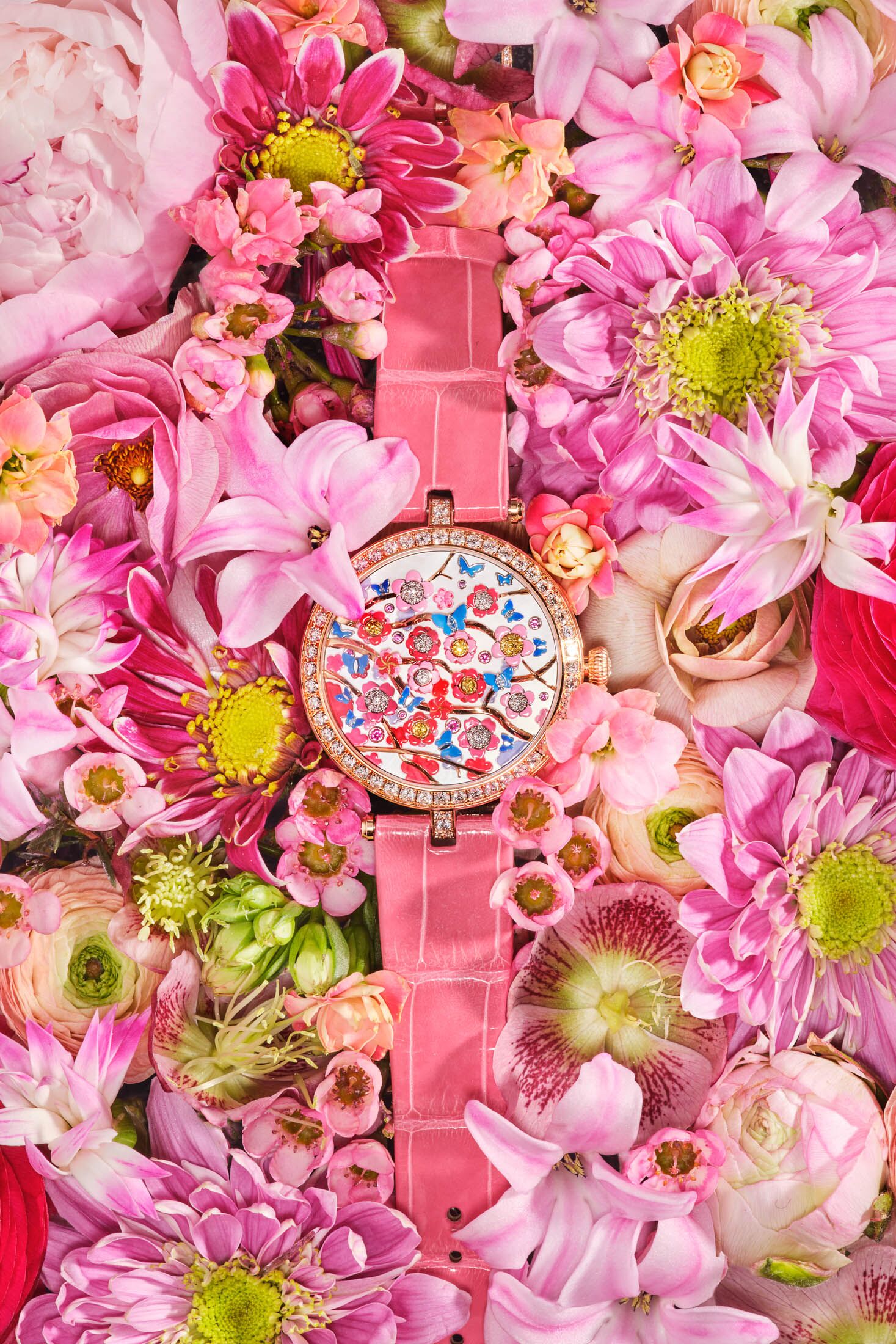 With the Lady Arpels Heures Florales Cerisier, one tells the time by counting the number of flowers that open, revealing the gemstones inside. Photographer: Hannah Whitaker for Bloomberg Businessweek