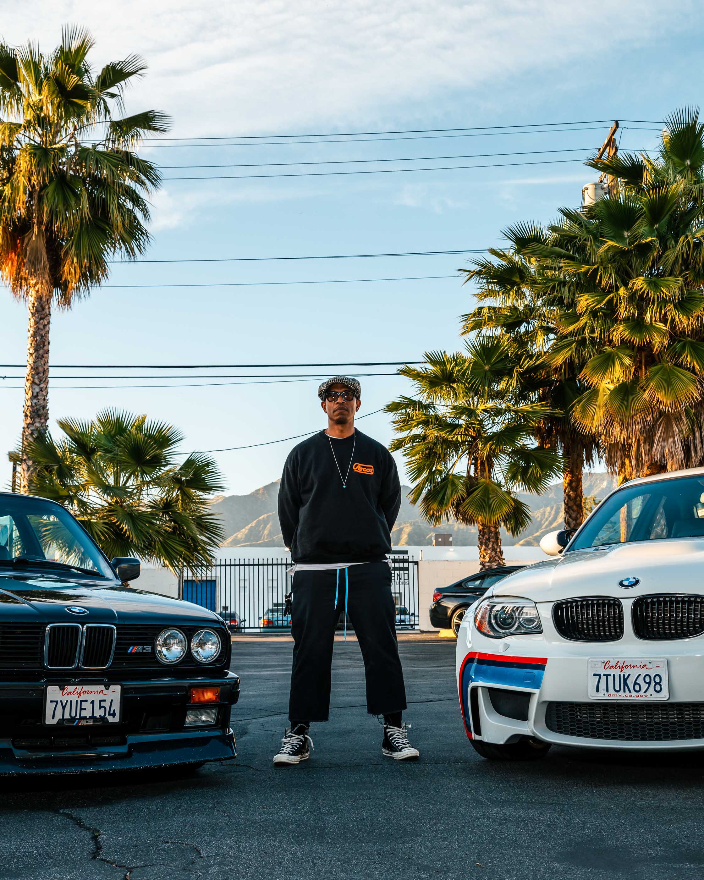 Adrian Miles with his two BMW's — the Diamond Sports E30 M3 1989-90 and the White E82 1M — in Glendale.  Photographer: Clara Mokri