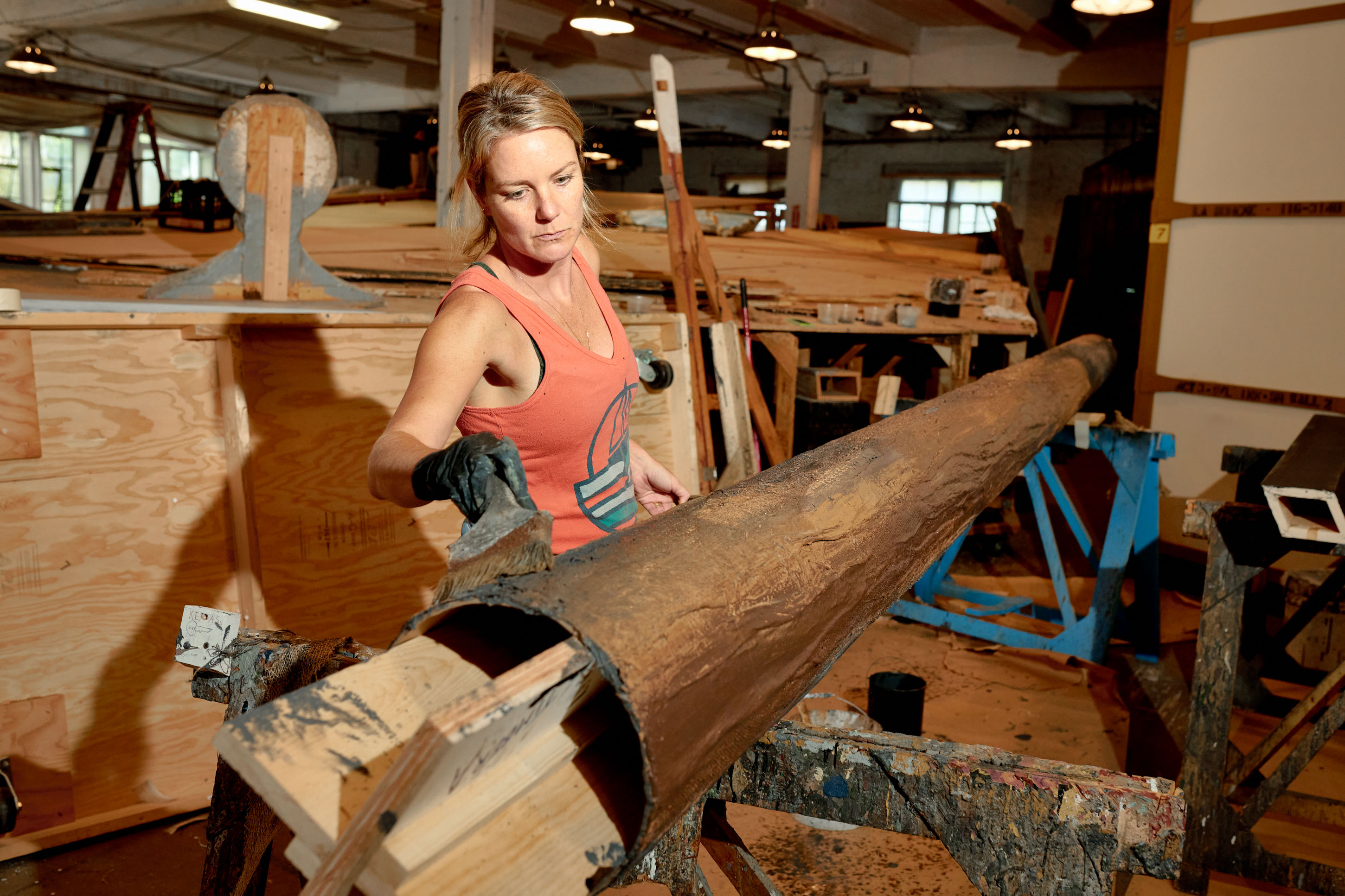 Scenic artist Dana Wilson works on Act 3's timber at the Bronx workshop of New York's Metropolitan Opera. Photographer: Gabby Jones/Bloomberg