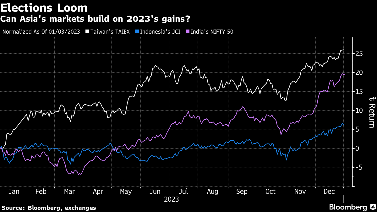 And finally, here's what else Paul is interested in for the year ahead: A series of elections throughout 2024 will dominate the local and global newsflow and investors will need to be on their toes to keep up. Implied volatility in currency markets has already started to flicker to life around key election dates in APAC — and the temperature is starting to rise ahead of the US Presidential election later in the year. First up is Taiwan. Voters in the democracy of more than 23 million people will choose their next president and lawmakers on Jan. 13 in an election that may also help shape US-China relations for years. Investors in Taiwan's assets would likely favor a China-friendly outcome and worry about a potential deterioration in cross-strait relations should Vice President Lai Ching-te of the ruling Democratic Progressive Party win. Taiwan's ties with China dominated a three-way debate between the island's presidential candidates on Saturday. Next up will be a vote in Indonesia in February, where investors will watch to see who will succeed President Joko Widodo and whether they will uphold his policies. And then there's India. Last year, foreign investors turned bullish on the outlook for the nation's stocks after victories in key state elections by Prime Minister Narendra Modi's party. Success for Modi in upcoming general elections, which would help confirm political stability, would probably encourage global funds to keep investing in the nation. Finally, later in the year the US vote will be an election in which a potential overhaul of trade policy — and the threat of protectionist tariffs — will dominate headlines and drive currency movements, according to JPMorgan strategists. That could mean more volatility for the Taiwan dollar and Chinese yuan, they say. Paul Dobson is the Markets Executive Editor for Bloomberg News in Asia, based in Singapore. |