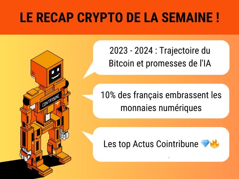 La news tribune Weekly !Alors que nous ouvrons le chapitre de 2024, permettez-moi de vous présenter mes vœux les plus sincères pour une année empreinte de bonheur, de santé et de succès. Que ces douze mois à venir soient pour vous une période de réalisations et de joies. Dans cet esprit d'optimisme et de renouveau, nous sommes ravis de vous accueillir dans la première édition de l'année de notre newsletter hebdomadaire. Ensemble, nous continuerons à plonger au cœur des sujets les plus captivants et essentiels qui façonnent notre paysage économique et numérique. Au programme : Bilan 2023 et Horizon 2024 : La trajectoire du Bitcoin et les promesses de l'IA, L’adoption des monnaies numériques qui flambe en France et le récapitulatif des actualités les plus marquantes de la semaine. Bilan 2023 et Horizon 2024 : La trajectoire du Bitcoin et les promesses de l'IADans un monde en constante évolution, où la technologie redéfinit les frontières de l'imaginable, les cryptomonnaies et l'intelligence artificielle (IA) se sont imposées comme des acteurs incontournables du changement. L'année 2023 a été un véritable carrefour pour le Bitcoin, montrant à la fois sa résilience face aux turbulences du marché et sa vulnérabilité face à des scandales retentissants. Tandis que nous nous tournons vers 2024, l'horizon semble promettre une ère nouvelle où la synergie entre la crypto et l'IA pourrait redéfinir les règles du jeu. Rétrospective de 2023 : Une année de contrastes pour le BitcoinL'année 2023 a été marquée par une ascension spectaculaire du Bitcoin, qui a confirmé sa position de leader incontesté dans l'univers des cryptos. Malgré un contexte macroéconomique incertain et des marchés financiers fluctuants, le Bitcoin a démontré une résilience remarquable. Selon une étude de Kaiko Research, la cryptomonnaie a enregistré une hausse impressionnante de plus de 160 %, surpassant ainsi la plupart des actifs traditionnels tels que l'or et les indices boursiers majeurs. Cette performance est d'autant plus notable qu'elle s'est déroulée dans un environnement marqué par des taux d'intérêt en hausse et une incertitude géopolitique croissante. L'année a été ponctuée de moments clés qui ont défini la trajectoire du Bitcoin. Le premier trimestre a vu un "rallye précoce" où le Bitcoin a rapidement rebondi des creux cycliques, stimulé par des annonces optimistes et une adoption croissante par des institutions financières de renom. Cependant, le milieu de l'année a été moins clément, avec un "décrochage" où la valeur du Bitcoin a chuté, reflétant les inquiétudes autour de la régulation et de la viabilité à long terme des cryptomonnaies. Malgré cela, le Bitcoin a réussi à inverser la tendance avec un "rallye de fin d'année", regagnant une grande partie de sa valeur perdue et clôturant l'année sur une note positive. Cependant, 2023 n'a pas été exempte de défis et de scandales qui ont ébranlé la confiance dans l'écosystème crypto. L'un des événements les plus retentissants a été le procès de Sam Bankman-Fried, fondateur de la plateforme d'échange FTX. Accusé de fraude et de manipulation de marché, son procès a mis en lumière les risques associés à une régulation insuffisante et à une gouvernance opaque dans l'industrie des cryptomonnaies. En Turquie, le PDG de la plateforme d'échange Thodex a été condamné à une peine record de 11 000 ans de prison pour détournement de fonds. De même, l'arrestation du fondateur de Terra, Do Kwon, a mis en évidence les dangers liés à des projets crypto non régulés et potentiellement instables. L'année a également été marquée par la chute spectaculaire de Changpeng Zhao, le PDG de Binance, la principale plateforme d’échange de cryptomonnaies. Accusé de violations des lois antiblanchiment américaines et du Bank Secrecy Act, CZ a plaidé coupable et a démissionné de ses fonctions, acceptant de payer une amende pénale de 50 millions de dollars. Binance elle-même a plaidé coupable et s'est vue infliger des amendes totalisant 4,3 milliards de dollars, l'une des plus lourdes sanctions jamais imposées dans l'industrie. 2024 : L'ère de la synergie crypto-IAAlors que nous nous projetons vers 2024, l'horizon est marqué par l'émergence d'une alliance prometteuse entre les cryptomonnaies et l'intelligence artificielle (IA). Cette synergie, encore à ses balbutiements, promet de redéfinir les paradigmes existants dans les domaines de la finance, de la technologie et au-delà. Les analystes, tels que Sandra Leow de Nansen, anticipent une maturation rapide de cette alliance, où l'IA et les cryptomonnaies pourraient non seulement coexister mais aussi se renforcer mutuellement, ouvrant la voie à des innovations sans précédent. L'un des exemples les plus parlants de cette convergence est l'émergence de chain bots et d'agents d'IA capables d'effectuer des transactions en cryptomonnaies, optimisant ainsi les stratégies de trading et la gestion d'actifs pour les traders humains. Ces agents d'IA pourraient devenir des utilisateurs primaires sur la blockchain, exploitant sa transparence, sa sécurité et sa décentralisation pour effectuer des opérations complexes et améliorer l'efficacité du marché. Cependant, cette convergence n'est pas sans défis. Sur le plan technique, l'intégration de l'IA dans les systèmes blockchain pose des questions complexes en termes de compatibilité, de performance et de sécurité. Sur le plan éthique et réglementaire, l'augmentation de l'autonomie des agents d'IA dans les transactions financières soulève des questions sur la responsabilité, la transparence et le contrôle. Malgré ces défis, les avantages potentiels de la synergie crypto-IA sont immenses. Le rapport "Crypto Trend Report 2024" de Gemini souligne que les faiblesses de l'IA centralisée pourraient être atténuées par la décentralisation offerte par la blo