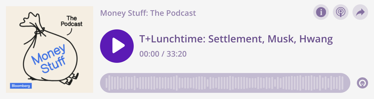 | This week's episode of the Money Stuff Podcast is out now, and in it, Katie and I discuss the move to T+1 settlement, recalling stock borrow | |||||