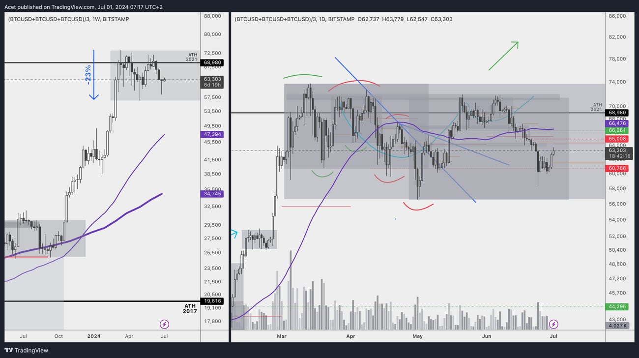 BTCUSD a finalement clôturé sa semaine précédente d'une belle bougie d'impulsion : une grande mèche, mais un petit corps, signe que le prix est descendu fortement avant de remonter tout aussi fortement. On remarque en journalier que cela ne fut pas aussi soudain. Le prix a consolidé et a finalement délivré une impulsion dimanche dernier. Nous continuons d'évoluer sous la MM50, dans une immense consolidation de 4 mois.