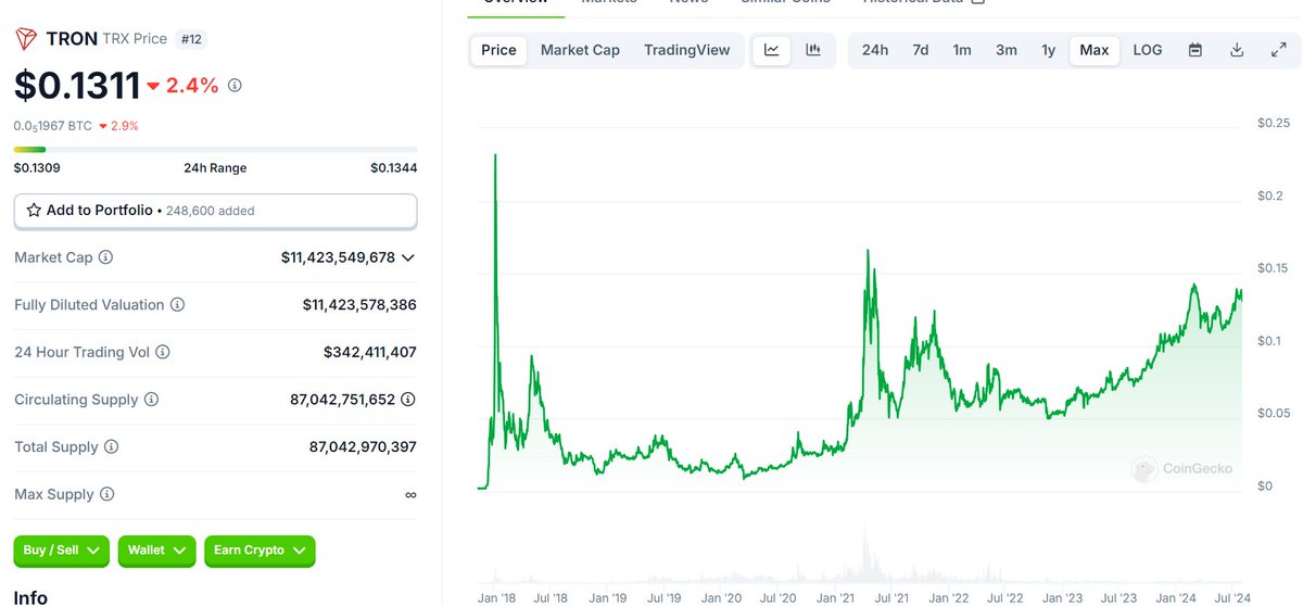 Okay, OTHER than @justinsuntron... Who is steering the helm of the Tron ship? I have questions about the whole thing. $11.4b market cap. Who are the large holders of TRX? Hedge funds? Why is this thing going up in price? Who's the marginal buyer of TRX? |  | | | 2:13 PM • Jul 31, 2024 | | | | | | 11 Likes 0 Retweets | 12 Replies |