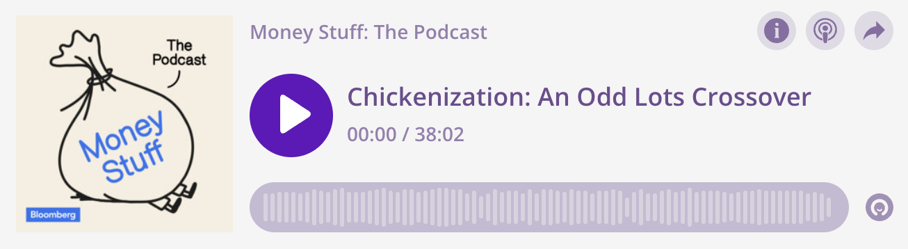 | This week's episode of the Money Stuff podcast is out now. It's a special crossover episode in which Katie and I talk to Tracy Alloway and Joe Weisenthal of the Odd Lots podcast about their miniseries on chicken. We discuss how chicken explains the US economy, how Ray Dalio invented Chicken McNuggets, how the Victorian chicken bubble inspired Charles Darwin and how to manipulate chicken Libor. You can listen to this week's episode here: You can get Money Stuff: The Podcast at Apple, Spotify or wherever you get your podcasts. We'd love your feedback. You can email us at moneypod@bloomberg.net. |