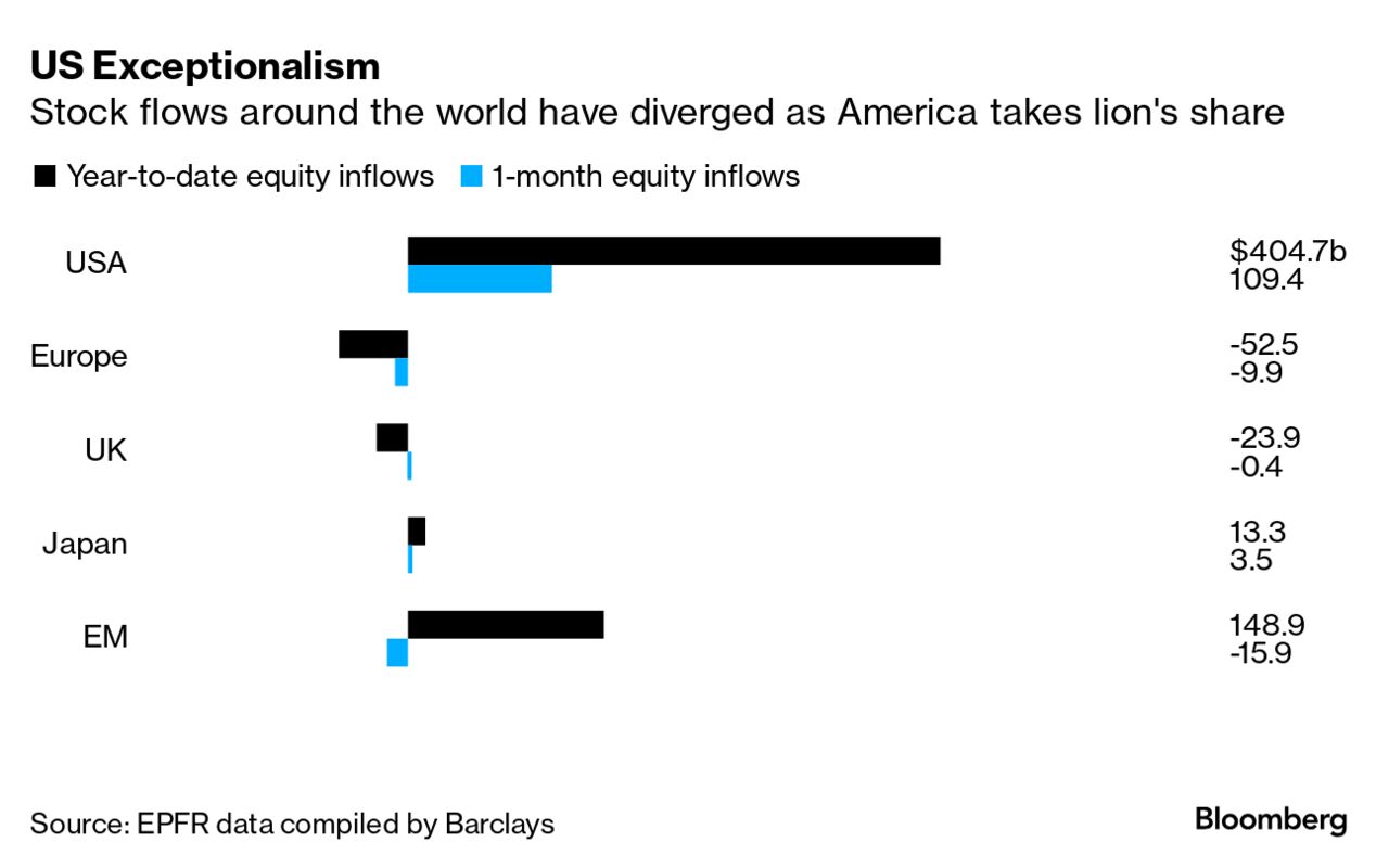 | It's almost a month since Donald Trump secured another term in the White House and the trades that greeted his victory are largely intact. Stock investors have celebrated the most, with the S&P 500 up 4.3% since the election as investors cheer the president-elect's plans to cut taxes and deregulate. Other indicators back up the "American Exceptionalism" vibe. Inflows into US equities have risen over the past month, while Europe and emerging markets went the other way, according to EPFR data compiled by Barclays. Such gains are all the more remarkable given US equities are already set to beat the rest of the world by the most since 1997, according to MSCI indexes — just as it has in all but two of the last 15 years. That has pushed up their relative valuations, while their weightings in global indexes have reached a record high. Wall Street pundits from JPMorgan to UBS see the outperformance continuing. To a lesser degree, other assets also reflect Trump's return. While the dollar has reversed some of its recent climb, Robin Brooks of the Brookings Institution notes it also rose following Trump's 2016 win and then gave back some of its gains, only to rise again "as markets realized what was coming." Brooks predicts the same will happen now. Bond yields have climbed, although the 10-year Treasury has failed to convincingly break above 4.5%.
