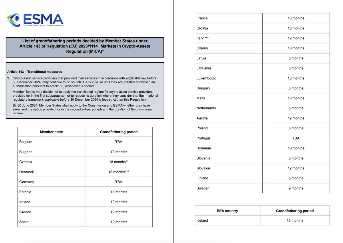 πͺπΊ MiCA is live, but CASPs (e.g. exchanges) that were licensed/registered in an EEA country before can benefit from additional national transition periods. These range from -5 months in π±πΉ -6 months in π³π± -12 months in π©πͺ -to up to 18 months in π«π· More belowπ | Patrick Hansen @paddi_hansen