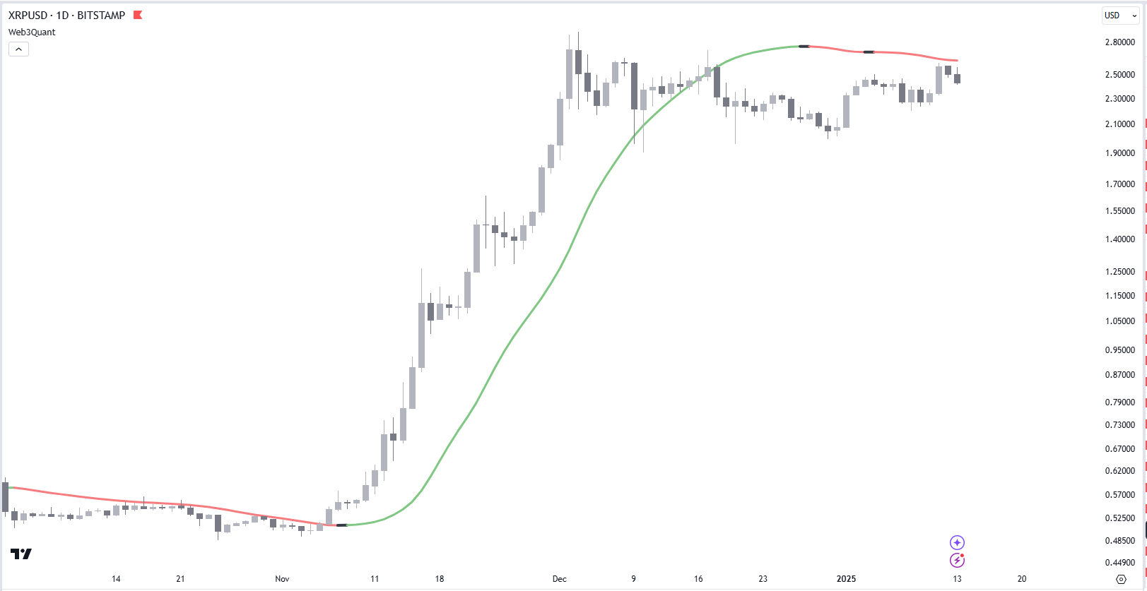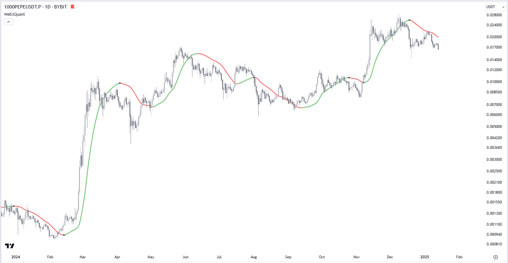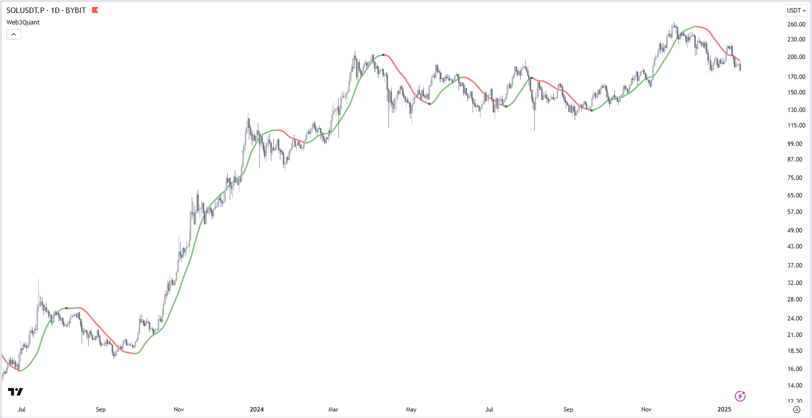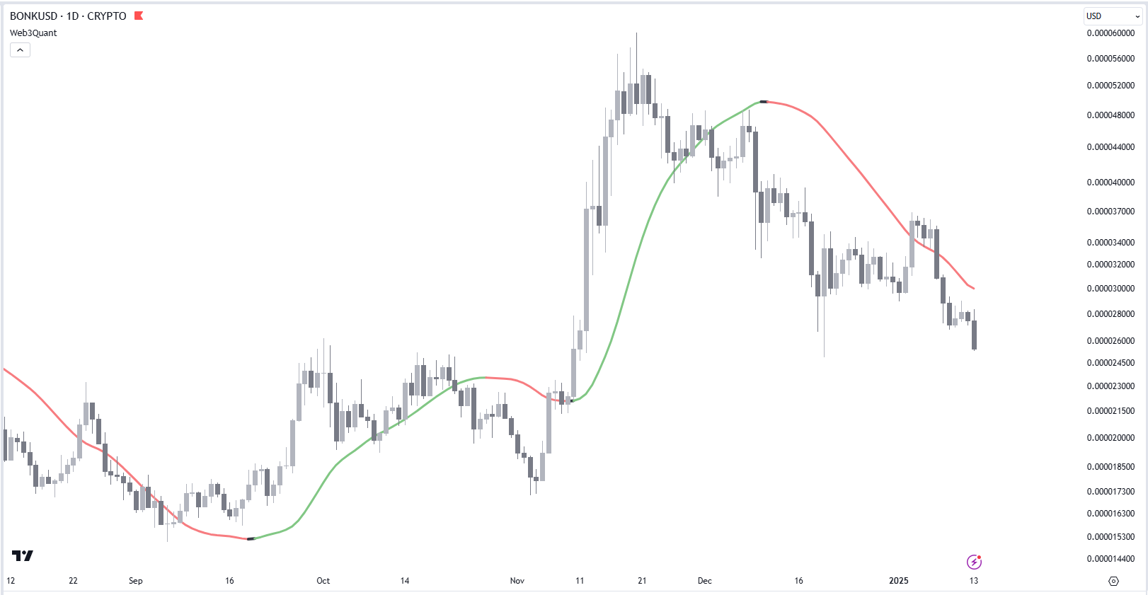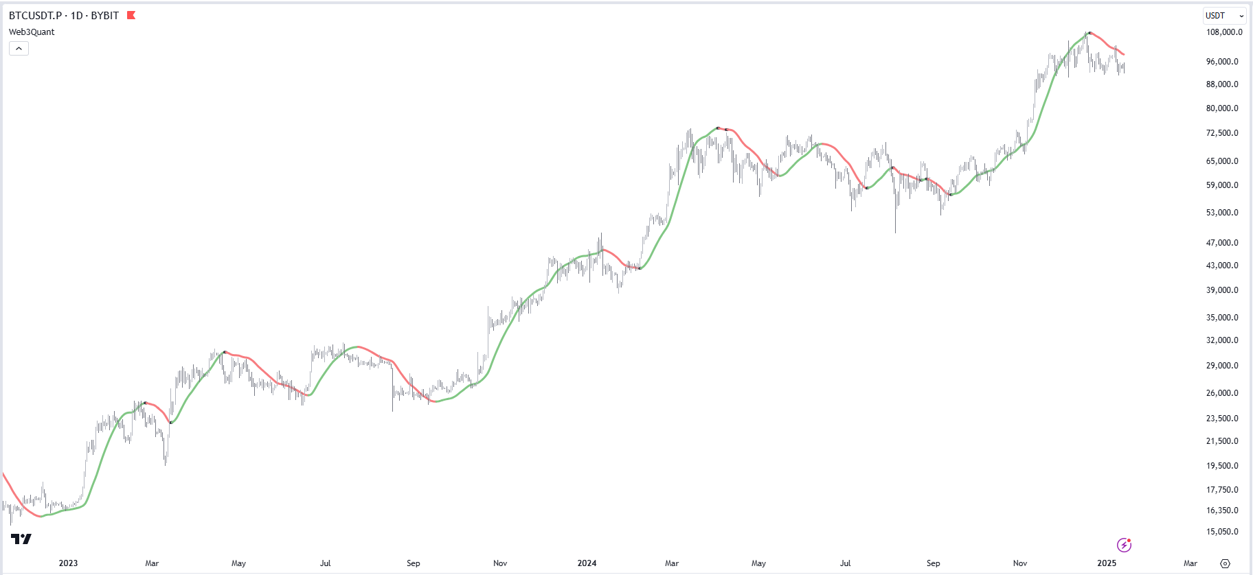 lets do the Web3Quant line indicator first. its perfect for HTF.  NOTE: showing you the 1D chart but its optimized for 4hours by default.  btc  btc since 2023 its captured all the major swings well since this whole bull run started in 2023. including the latest one which we are currently experiencing.