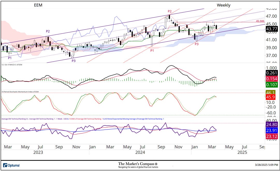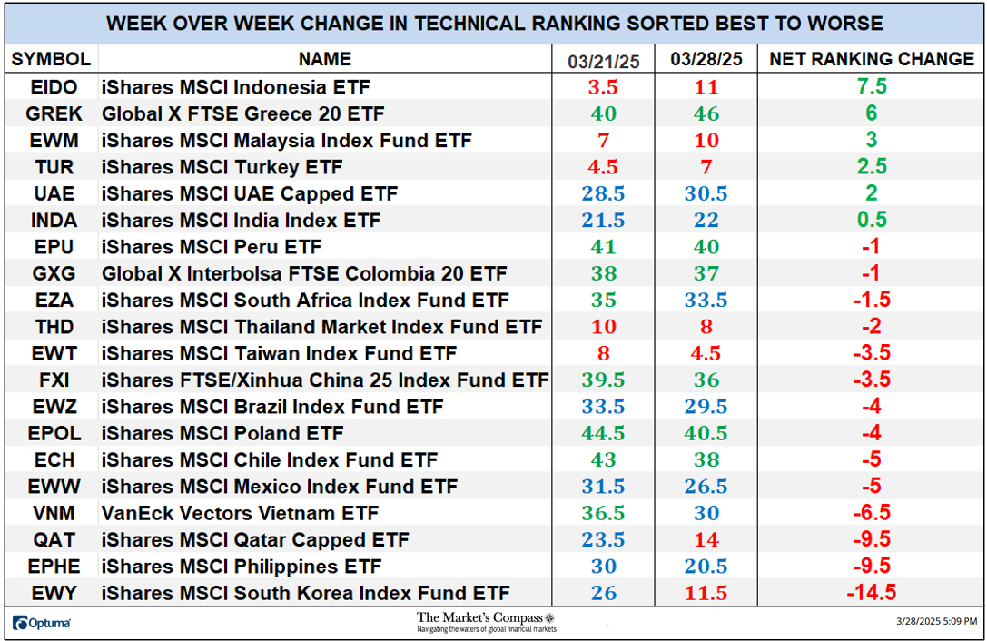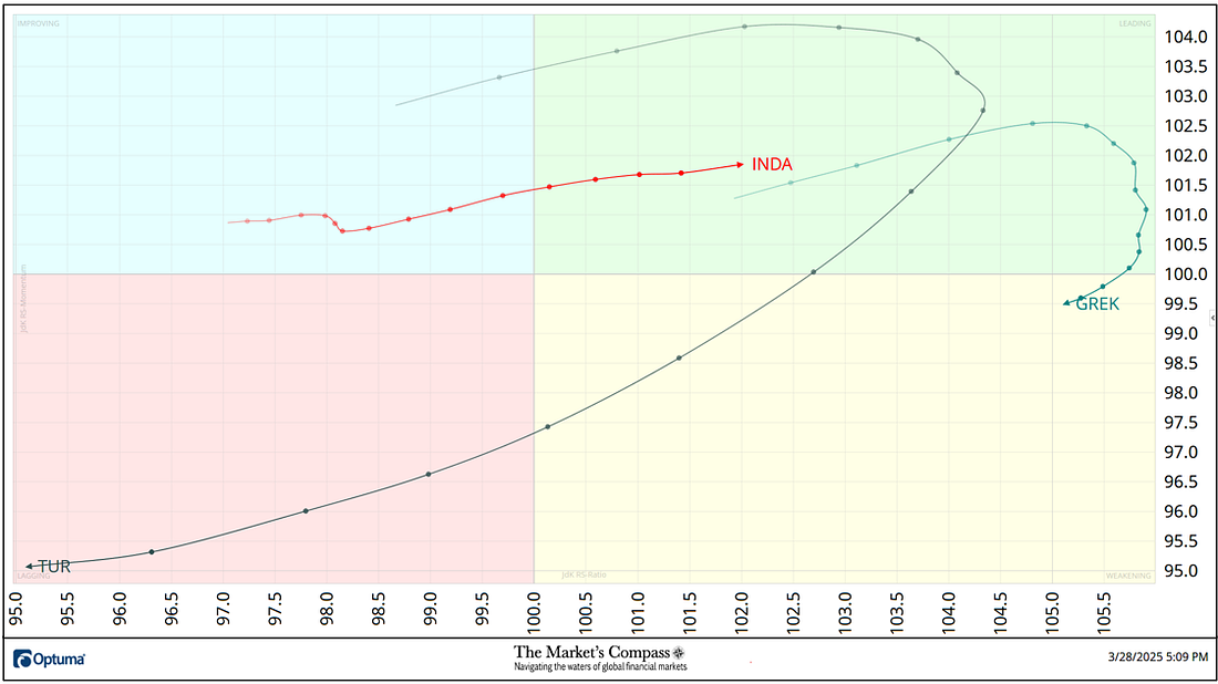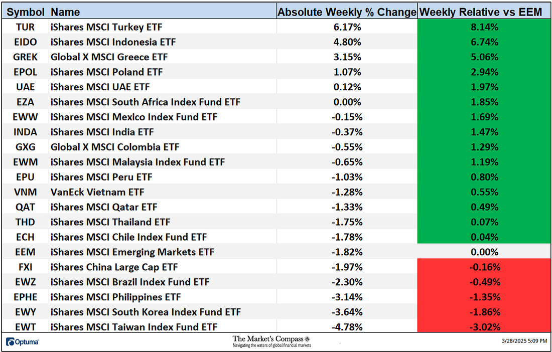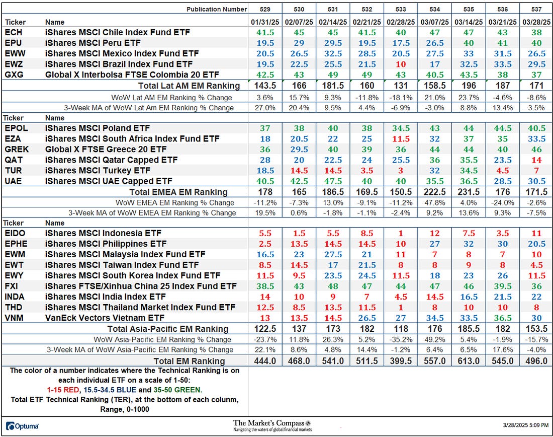 Welcome to The Market’s Compass Emerging Market’s Country ETF Study, Week #537. As always, it highlights the technical changes of the 20 EM Country ETFs that I track on a weekly basis and publish every third week. Paid subscribers will receive this week’s unabridged Emerging Market’s Country ETF Study sent to their registered e-mail. Free subscribers will receive, on occasion, an excerpt of the full version. Past publications can be accessed by paid subscribers via The Market’s Compass Substack Blog. Next week we will be publishing the The Market’s Compass Developed Markets Country ETF Study. On Sunday I published the latest edition of The Market’s Compass Crypto Sweet Sixteen Study which I publish on a weekly basis and tracks the technical changes of sixteen of the larger capitalized Cryptocurrencies. This Week’s and 8 Week Trailing Technical Rankings of the 20 Individual EM Country ETFsTo understand the methodology used in constructing the objective EM Country ETF Individual Technical Rankings visit the mc’s technical indicators page at www.themarketscompass.com and select “em country etfs”. This past week The Total EM Technical Ranking, “TEMTR” fell by -8.99% to 496 from 545 adding to the -11.09% loss the week before from 613 three weeks ago. The Total Asia-Pacific EM Ranking fell the most of the three, down -15.7% to 153.5 from 182 the previous week. The Total Lat AM EM Ranking fell -8.6% to 171 from 187. The EMEA EM Total Technical Ranking fell the least, down -2.6% to 171.5 from 176 the previous week. It should be noted that the iShares MSCI Turkey ETF (TUR) TR has lately been on a nasty price and TR “roller coaster ride”. After rising to 34.5 three weeks ago, it fell by 30 “handles” to 4.5 two weeks ago before last week’s small recovery to 7. Posted below is the daily candle stick chart of the TUR with MACD in the lower panel. Six of the twenty EM Country ETFs I track in these pages registered improvement in their TRs on a WoW basis, and fourteen ETF TRs fell. The average TR loss was -2.45 vs. the previous week’s average TR loss of -3.40 when thirteen out of twenty fell. Six of the EM Country ETF TRs ended the week in the “green zone” (TRs between 34.5 and 50), seven were in the “blue zone” (TRs between 15.5 and 34) and seven were in the “red zone” (TRs between 0 and 15). That was a slight deterioration from the previous week when eight were in the “green zone”, seven were in the “blue zone” and five were in the “red zone”. The Technical Condition Factor* changes over the past week and previous 8 weeks*To understand the construction the of The Technical Condition Factors visit the mc’s technical indicators page at www.themarketscompass.com and select “em country etfs”. This past week a 32.86% reading was registered in the Daily Momentum Technical Condition Factor (”DMTCF”) or 46 out of a possible total of 140 positive points. That was a drop from the week before reading of 50.71% or 71 which was a continued drop from 75.71% or 106 three weeks ago. As a confirmation tool, if all eight TCFs improve on a week-over-week basis, more of the 20 ETFs are improving internally on a technical basis, confirming a broader market move higher (think of an advance/decline calculation). Conversely if all eight TCFs fall on a week-over-week basis it confirms a broader market move lower. Last week all two TCFs rose, and six fell. Relative Strength and Weakness in the Emerging Markets Country ETFs vs. the EEM utilizing a Relative Rotation Graph**A brief explanation of how to interpret RRG charts visit the mc’s technical indicators page at www.themarketscompass.com and select “em country etfs”. To learn more detailed interpretations, see the postscripts and links at the end of this Blog. The chart below has three weeks, or 15 days, of Relative data points vs. the benchmark, the CCi30 Index, at the center, deliniated by the dots or nodes. Not all 20 ETFs are plotted in this RRG Chart. I have done this for clarity purposes. Those which I believe are of higher technical interest remain. After viewing the daily chart of the iShares MSCI Turkey ETF (TUR) earlier in this week’s blog the sharp reversal in Relative Strength and Relative Strength Momentum is hardly a surprise. A week ago, last Monday the TUR began to roll over in the Leading Quadrant and began to rapidly lose Relative Strength Momentum as it accelerated lower in the Weakening Quadrant (note the distance between the nodes or dots that mark the day-to-day change). Last Tuesday it gathered a pace and entered the Lagging Quadrant. Diametrically opposed over the past two weeks has been the iShares MSCI India Index ETF (INDA) which has exhibited a controlled advance out of the Improving Quadrant into the Leading Quadrant. The Global X FTSE Greece 20 ETF (REK) had been rising at a good “clip” in the Leading Quadrant three weeks ago until it stalled and rolled over and entered the Weakening Quadrant at the end of last week. The EEM with the Total EM ETF Ranking “TER” OverlaidAn explanation of the The Total EM Technical Ranking Indicator and its interpretation visit the mc’s technical indicators page at www.themarketscompass.com and select “em country etfs”. The EEM has been trading sideways since the middle of February. The TER did mark mark a higher high three weeks ago but has since rolled over,, but the 13-week exponential moving average continues to track higher (aside from a brief blip lower) since the January 10th turn when the TER bottomed. More on the long-term technical condition of the EEM in the Candlestick chart that follows. The Weekly Cloud Chart of the EEM and the Average EM ETF Technical Ranking (“ATR”) of the 20 EM ETFsThe Average Weekly Technical Ranking (“ATR”) is the average Technical Ranking (“TR”) of the 20 Emerging Markets Country ETFs we track weekly and is plotted in the lower panel on the Weekly Candle Chart of the EEM pr