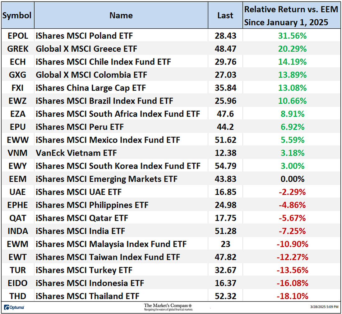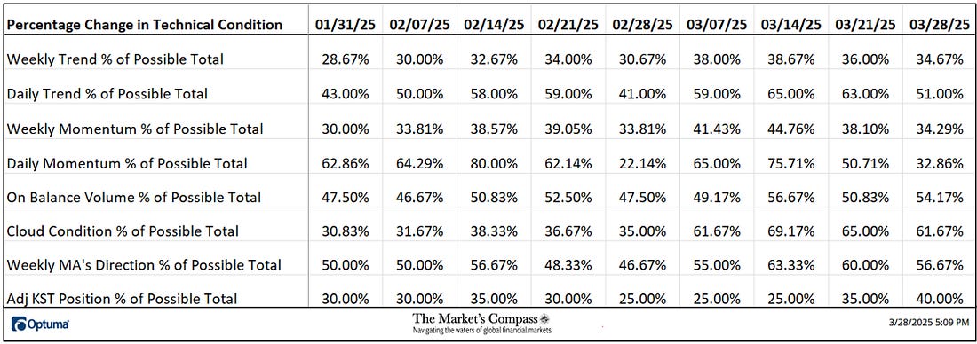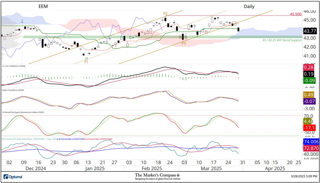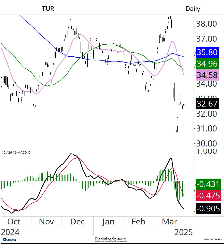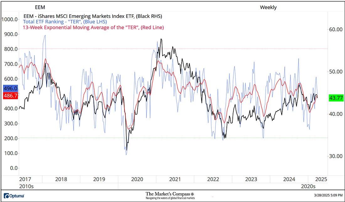 Welcome to The Market’s Compass Emerging Market’s Country ETF Study, Week #537. As always, it highlights the technical changes of the 20 EM Country ETFs that I track on a weekly basis and publish every third week. Paid subscribers will receive this week’s unabridged Emerging Market’s Country ETF Study sent to their registered e-mail. Free subscribers will receive, on occasion, an excerpt of the full version. Past publications can be accessed by paid subscribers via The Market’s Compass Substack Blog. Next week we will be publishing the The Market’s Compass Developed Markets Country ETF Study. On Sunday I published the latest edition of The Market’s Compass Crypto Sweet Sixteen Study which I publish on a weekly basis and tracks the technical changes of sixteen of the larger capitalized Cryptocurrencies. This Week’s and 8 Week Trailing Technical Rankings of the 20 Individual EM Country ETFsTo understand the methodology used in constructing the objective EM Country ETF Individual Technical Rankings visit the mc’s technical indicators page at www.themarketscompass.com and select “em country etfs”. This past week The Total EM Technical Ranking, “TEMTR” fell by -8.99% to 496 from 545 adding to the -11.09% loss the week before from 613 three weeks ago. The Total Asia-Pacific EM Ranking fell the most of the three, down -15.7% to 153.5 from 182 the previous week. The Total Lat AM EM Ranking fell -8.6% to 171 from 187. The EMEA EM Total Technical Ranking fell the least, down -2.6% to 171.5 from 176 the previous week. It should be noted that the iShares MSCI Turkey ETF (TUR) TR has lately been on a nasty price and TR “roller coaster ride”. After rising to 34.5 three weeks ago, it fell by 30 “handles” to 4.5 two weeks ago before last week’s small recovery to 7. Posted below is the daily candle stick chart of the TUR with MACD in the lower panel. Six of the twenty EM Country ETFs I track in these pages registered improvement in their TRs on a WoW basis, and fourteen ETF TRs fell. The average TR loss was -2.45 vs. the previous week’s average TR loss of -3.40 when thirteen out of twenty fell. Six of the EM Country ETF TRs ended the week in the “green zone” (TRs between 34.5 and 50), seven were in the “blue zone” (TRs between 15.5 and 34) and seven were in the “red zone” (TRs between 0 and 15). That was a slight deterioration from the previous week when eight were in the “green zone”, seven were in the “blue zone” and five were in the “red zone”. The Technical Condition Factor* changes over the past week and previous 8 weeks*To understand the construction the of The Technical Condition Factors visit the mc’s technical indicators page at www.themarketscompass.com and select “em country etfs”. This past week a 32.86% reading was registered in the Daily Momentum Technical Condition Factor (”DMTCF”) or 46 out of a possible total of 140 positive points. That was a drop from the week before reading of 50.71% or 71 which was a continued drop from 75.71% or 106 three weeks ago. As a confirmation tool, if all eight TCFs improve on a week-over-week basis, more of the 20 ETFs are improving internally on a technical basis, confirming a broader market move higher (think of an advance/decline calculation). Conversely if all eight TCFs fall on a week-over-week basis it confirms a broader market move lower. Last week all two TCFs rose, and six fell. Relative Strength and Weakness in the Emerging Markets Country ETFs vs. the EEM utilizing a Relative Rotation Graph**A brief explanation of how to interpret RRG charts visit the mc’s technical indicators page at www.themarketscompass.com and select “em country etfs”. To learn more detailed interpretations, see the postscripts and links at the end of this Blog. The chart below has three weeks, or 15 days, of Relative data points vs. the benchmark, the CCi30 Index, at the center, deliniated by the dots or nodes. Not all 20 ETFs are plotted in this RRG Chart. I have done this for clarity purposes. Those which I believe are of higher technical interest remain. After viewing the daily chart of the iShares MSCI Turkey ETF (TUR) earlier in this week’s blog the sharp reversal in Relative Strength and Relative Strength Momentum is hardly a surprise. A week ago, last Monday the TUR began to roll over in the Leading Quadrant and began to rapidly lose Relative Strength Momentum as it accelerated lower in the Weakening Quadrant (note the distance between the nodes or dots that mark the day-to-day change). Last Tuesday it gathered a pace and entered the Lagging Quadrant. Diametrically opposed over the past two weeks has been the iShares MSCI India Index ETF (INDA) which has exhibited a controlled advance out of the Improving Quadrant into the Leading Quadrant. The Global X FTSE Greece 20 ETF (REK) had been rising at a good “clip” in the Leading Quadrant three weeks ago until it stalled and rolled over and entered the Weakening Quadrant at the end of last week. The EEM with the Total EM ETF Ranking “TER” OverlaidAn explanation of the The Total EM Technical Ranking Indicator and its interpretation visit the mc’s technical indicators page at www.themarketscompass.com and select “em country etfs”. The EEM has been trading sideways since the middle of February. The TER did mark mark a higher high three weeks ago but has since rolled over,, but the 13-week exponential moving average continues to track higher (aside from a brief blip lower) since the January 10th turn when the TER bottomed. More on the long-term technical condition of the EEM in the Candlestick chart that follows. The Weekly Cloud Chart of the EEM and the Average EM ETF Technical Ranking (“ATR”) of the 20 EM ETFsThe Average Weekly Technical Ranking (“ATR”) is the average Technical Ranking (“TR”) of the 20 Emerging Markets Country ETFs we track weekly and is plotted in the lower panel on the Weekly Candle Chart of the EEM pr