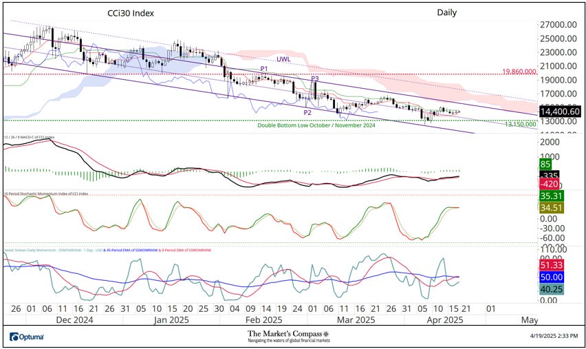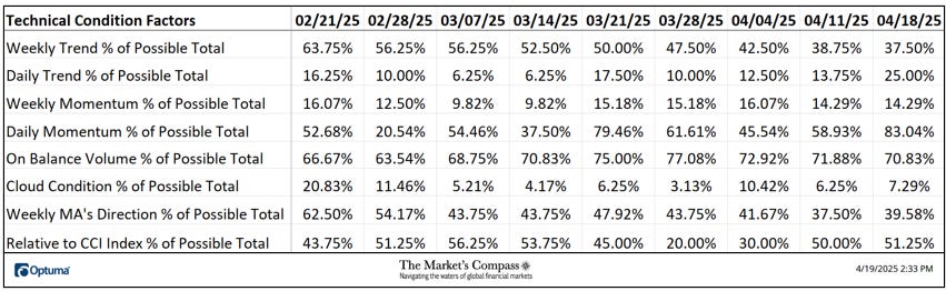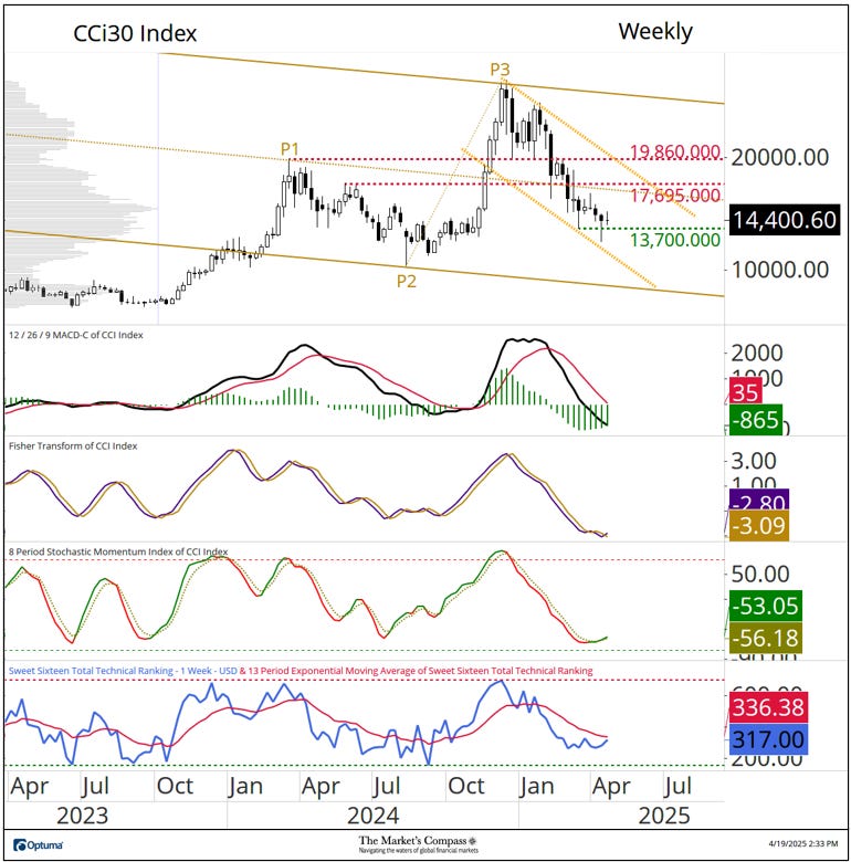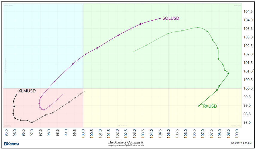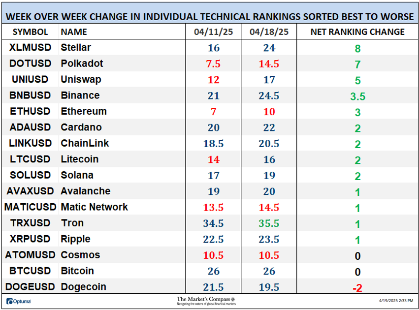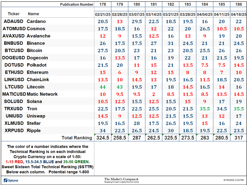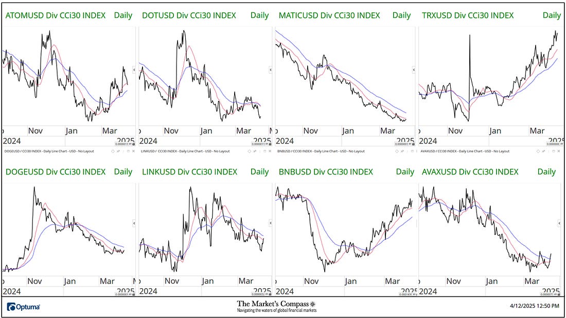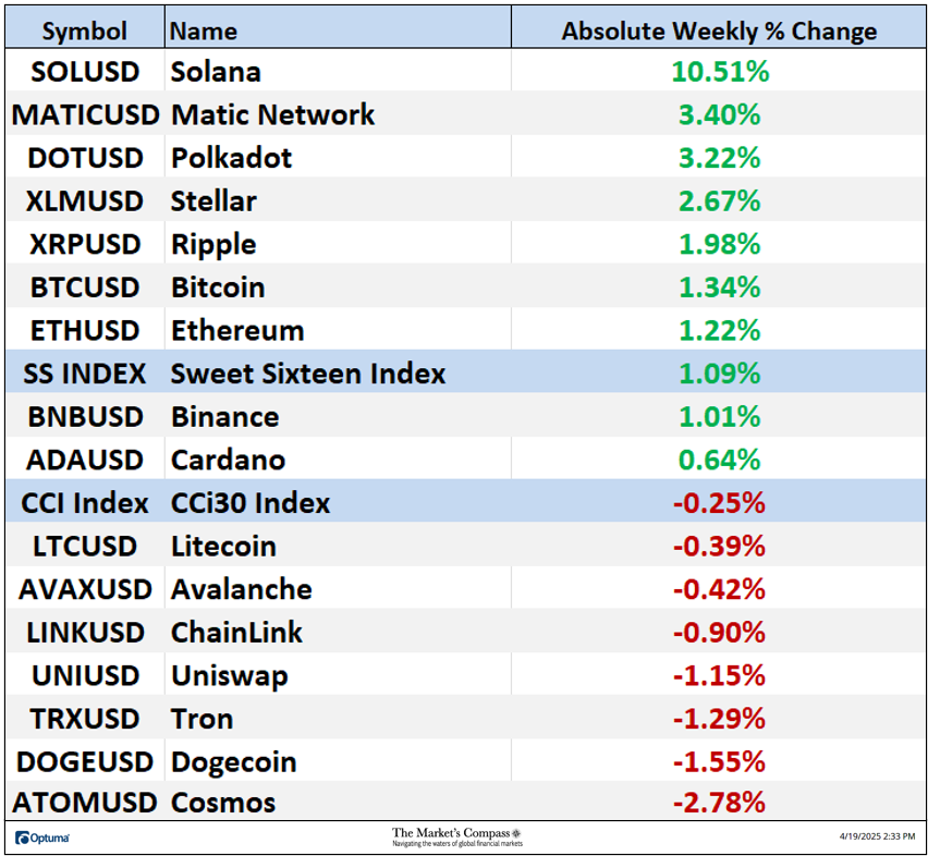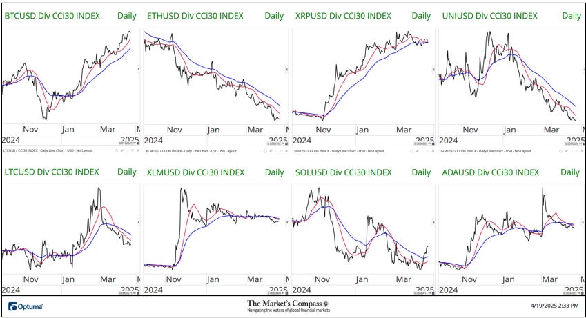 Welcome to this week’s publication of the Market’s Compass Crypto Sweet Sixteen Study #186. The Study tracks the technical condition of sixteen of the larger market cap cryptocurrencies. Every week the Studies will highlight the technical changes of the 16 cryptocurrencies that I track as well as highlights on noteworthy moves in individual Cryptocurrencies and Indexes. As always, paid subscribers will receive this week’s unabridged Market’s Compass Crypto Sweet Sixteen Study sent to their registered email. In celebration of the Easter Holiday, free subscribers will also receive the full version (in a thinly veiled attempt to lure them into becoming paid subscribers). Past publications including the Weekly ETF Studies can be accessed by paid subscribers via The Market’s Compass Substack Blog. This Week’s and 8 Week Trailing Technical Rankings of the Sixteen Individual CryptocurrenciesAn explanation of my objective Individual Technical Rankings go to www.themarketscompass.com. Then go to the MC’s Technical Indicators and select “crypto sweet 16”. What follows is a Cliff Notes version of the full explanation… ”The technical ranking system is a quantitative approach that utilizes multiple technical considerations that include but are not limited to trend, momentum, measurements of accumulation/distribution and relative strength. The TR of each individual Cryptocurrency can range from 0 to 50”. The Excel spreadsheet below indicates the weekly change in the objective Technical Ranking (“TR”) of each individual Cryptocurrency and the Sweet Sixteen Total Technical Ranking (“SSTTR”). *Rankings are calculated up to the week ending Friday April 18th The Sweet Sixteen Total Technical Ranking or “SSTTR” rose +13.01% to 317 from the previous week’s reading of 280.5 which was up 6.63% from the week before reading of 263. For the past ten weeks the SSTTR has ranged between 258 and 330 as it continues to track sideways. The long period of stasis in the SSTTR that I referred to above is mirrored by the de minimis WoW change in Individual TRs aside from Stellar (XLM) and Polkadot (DOT). Last week, thirteen of the Crypto Sweet Sixteen TRs rose, two were unchanged, and one fell. The average Crypto TR gain last week was +2.28, vs. the previous week’s average TR gain of +1.09. Only one of the sixteen crypto currencies TRs I track ended the week in the “green zone” (TRs between 35 and 50) and that was Tron (TRX), eleven TRs were in the “blue zone” (TRs between 15.5 and 34.5), and four were in the “red zone”. That was a slight improvement versus the previous week when, ten were in the “blue zone”, and six were in the “red zone”. Relative Strength and Weakness in the Sweet Sixteen vs. The CCi30 Index* utilizing a Relative Rotation Graph*The CCi30 Index is a registered trademark and was created and is maintained by an independent team of mathematicians, quants and fund managers lead by Igor Rivin. It is a rules-based index designed to objectively measure the overall growth, daily and long-term movement of the blockchain sector. It does so by indexing the 30 largest cryptocurrencies by market capitalization, excluding stable coins (more details can be found at CCi30.com). A brief explanation of how to interpret RRG charts can be found at The Market’s Compass website www.themarketscompass.com Then go to MC’s Technical Indicators and select Crypto Sweet 16. To learn more detailed interpretations, see the postscripts and links at the end of this Blog. The chart below has two weeks, or 14 days, of data points deliniated by the dots or nodes. Not all 16 Crypto Currencies are plotted in this RRG Chart. I have done this for clarity purposes. Those which I believe are of higher technical interest remain. In last week’s discussion of the Relative Strength and Relative Strength Momentum (or lack of it) I brought attention to Tron which was rolling over and was losing Relative Strength Momentum in the Leading Quadrant. That continued into the latter half of last week, losing Relative Strength as well vs. the CCi30 Index. as it dropped into the Weakening Quadrant. Solana (SOL) hooked higher two weeks ago and gathered a pace higher through the Improving Quadrant and into the Leading Quadrant last week displaying superior Relative Strength Momentum and Relative Strength. Stellar continues to struggle in the Lagging Quadrant but it turned high last week and is on course to enter the Improving Quadrant. What’s in Your Wallet?The two panels below contain longer term line charts of the Relative Strength or Weakness of the Sweet Sixteen Crypto Currencies vs. the CCi30 Index that are charted with a 55-Day Exponential Moving Average in blue and a 21-Day Simple Moving Average in red. Trend direction and crossovers, above or below the longer-term moving average, reveals potential continuation of trend or reversals in Relative Strength or Weakness. Seven Day Absolute % Price Change**Friday April 11th to Friday April 18th. Nine of the Sweet Sixteen gained absolute ground over the seven-day period ending Friday and seven fell. The seven-day average absolute price gain was 1.09%, reversing the previous week’s average absolute loss of -5.75% when only two gained absolute ground over the seven-day period ending the previous Friday and fourteen fell on an absolute basis. If it was not for Solana’s (SOL) outsized absolute gain last week, the average absolute gain would have been +0.47% The Technical Condition Factor* changes for the week ending March 28th with the trailing eight weeks added.*An explanation of my Technical Condition Factors go to www.themarketscompass.com. Then go to the MC’s Technical Indicators and select Crypto Sweet 16. The DMTCF rose last week from a reading of 58.93% or 66 the week before to 83.04% or 93 out of a possible 112. As a confirmation tool, if all eight TCFs improve on a week over week basis, more of the 16 Cryptocurrencies are improving in