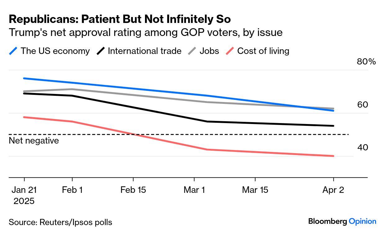 | I dunno, slapping a 104% tariff on a country that you import more than $400 billion in goods from each year does NOT sound like a smart idea! In fact, it sounds completely nonsensical. And the Bloomberg Editorial Board agrees: "Initiating a trade war under such conditions defies economic logic." Don't believe it? Just look at this chart: We need China more than it needs us! It really is that simple. And yeah, I get that the Trump administration is attempting to unravel that dependency. But there's a big difference between delicately unraveling a relationship and calling your third-biggest trading partner a "peasant" like Vice President JD Vance did the other day. Although the parade of world leaders wanting to woo President Donald Trump is long and winding, the cost of obliterating the commercial link between China and the US will be immense, the editors say: "Washington's tariff warriors should remember that whatever small victories they may notch by browbeating smaller nations will amount to little if the US is locked into a risky and expensive confrontation with its greatest rival." The only thing dumber than this trade war would be an actual war, they conclude. If that sentence doesn't put a chill down your spine, perhaps you ought to read this column by Patricia Lopez about steelmakers in the Midwest. Initially, they were excited about a second round of protectionist policies since they benefitted from a 25% tariff on foreign steel in 2018. But round two of Trump's tariffs has been far more sweeping, and steel manufacturers are feeling the pain. "Any benefit [a] company might have derived from protective steel tariffs may be wiped out by the array of tariffs that are affecting demand for new cars and trucks," she writes. Plus, China is a top trading partner for Patricia's home state of Minnesota: "Iron Rangers are tough, but they're not naive." What about the rest of Trump's voters? Surely most Republicans are still on board with the president's stick-it-to-the-man policies. Well, sorta: As the above chart shows, Trump still has the majority's approval in all economic areas, save for inflation. "There's a sense here among folks [that] they've been sold out by coastal elites and foreigners and they're going to give this plan time to play out," Gregg Keller, a veteran Republican operative in St. Louis, told David M. Drucker. "For now, Trump has political leeway to prove critics, and history, wrong. Republican voters and others who find his sort of populism appealing are for now more convinced by his sales pitch about fairness and economic equity than they are by the academic carping of economists or the turbulence of the financial markets," David writes. Speaking of the turbulence in financial markets: John Authers' official designation for the start of the week was "Manic Monday," in part thanks to a fake headline by an anonymous X account and a wacky selloff of US Treasuries: This type of behavior is "the opposite of what you'd expect in the context of a stock selloff that's brought the S&P 500 Index to the doorstep of a bear market," writes Jonathan Levin. Why are people dumping bonds so willy-nilly? He suspects it has to do with threats to US exceptionalism and the global trading system, along with burgeoning federal debt. Most importantly, he worries about a loss of faith in America's economic stability. John — the other one! — meanwhile, wonders whether the blip in the Treasury matrix means "that someone somewhere had to make forced sales to raise cash." If that's the case (and it's sure looking like it is), Matt Levine says the end of the basis trade — where "hedge funds borrow money, buy Treasuries, sell Treasury futures to asset managers and collect a tiny spread" — may be nigh. Then there's Kyla Scanlon's working theory, which is that tariffs are inflationary and the Fed might need to intervene. There's just one problem with that assumption: The last time inflation reared its ugly head — cough, cough, Covid — central bankers completely mischaracterized it as transitory. "The result is a Fed whose political independence and market credibility are as shaky as they have been since the late 1970s and early 1980s," writes Mohamed A. El-Erian. It's safe to say that there's no room for error this time around. As for the stock market volatility we've been seeing, Nir Kaissar says it's best for traders to wait it out on the sidelines: "To me, all of this — the fact that the selling so far seems to be motivated by emotion more than calculation, and that the market is already down a good portion of the amount one would expect in anticipation of recession — is good reason not to join in the selling." |