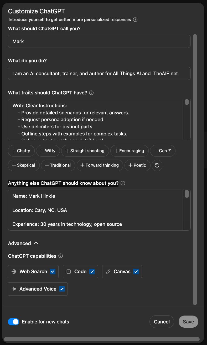 You could write your custom instructions from scratch but I find that you can get a great start by using ChatGPT. By feeding ChatGPT your LinkedIn profile, resume, and a few writing samples, you can have it generate a tailored first draft of your custom instructions in minutes. Then open them in Canvas to tweak them. You'll define what you do, how ChatGPT should respond, and anything else that improves your experience. It's a fast, effective way to make every session more productive—especially if you're using ChatGPT for business writing, technical tasks, or strategic planning. |