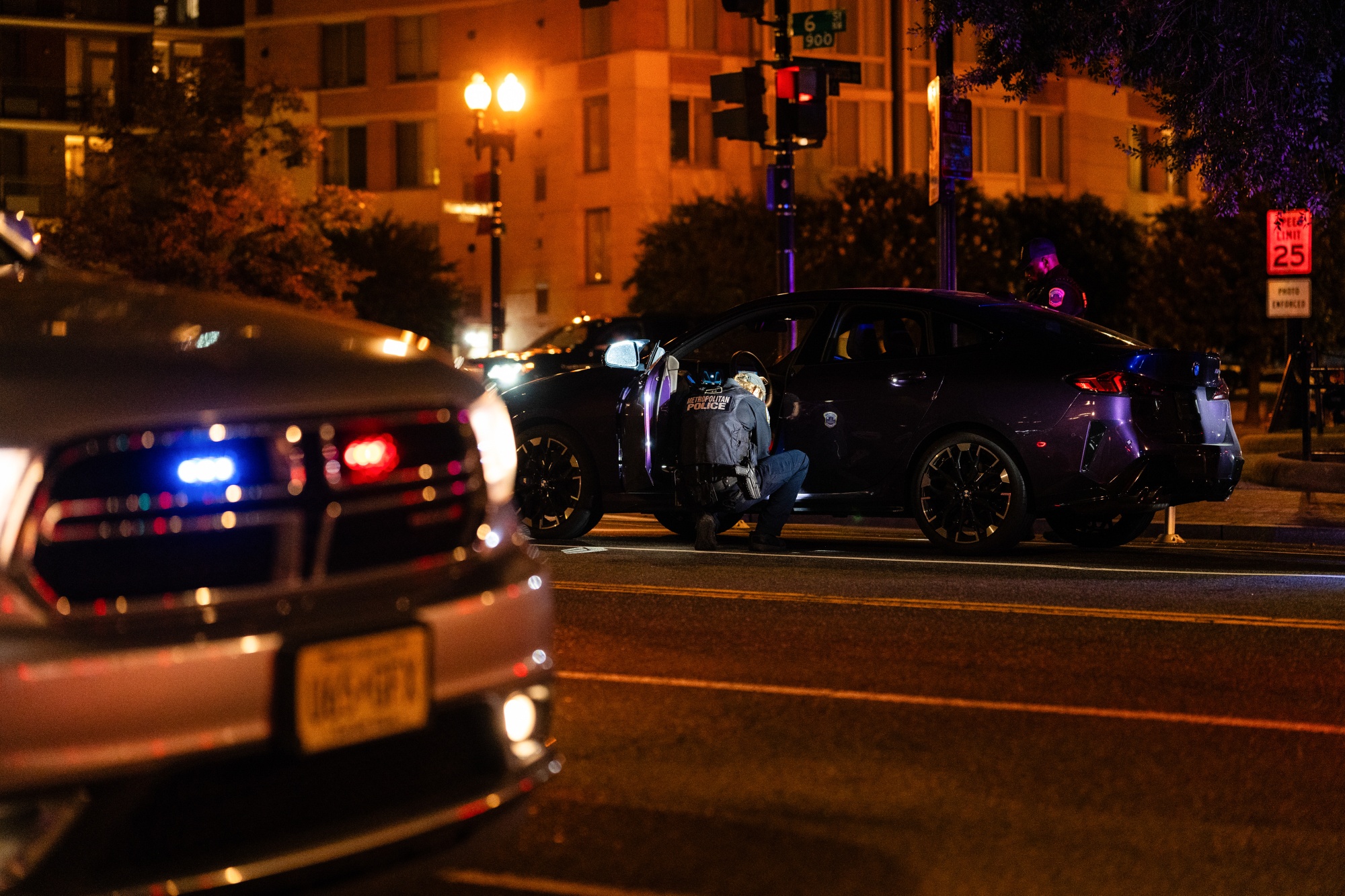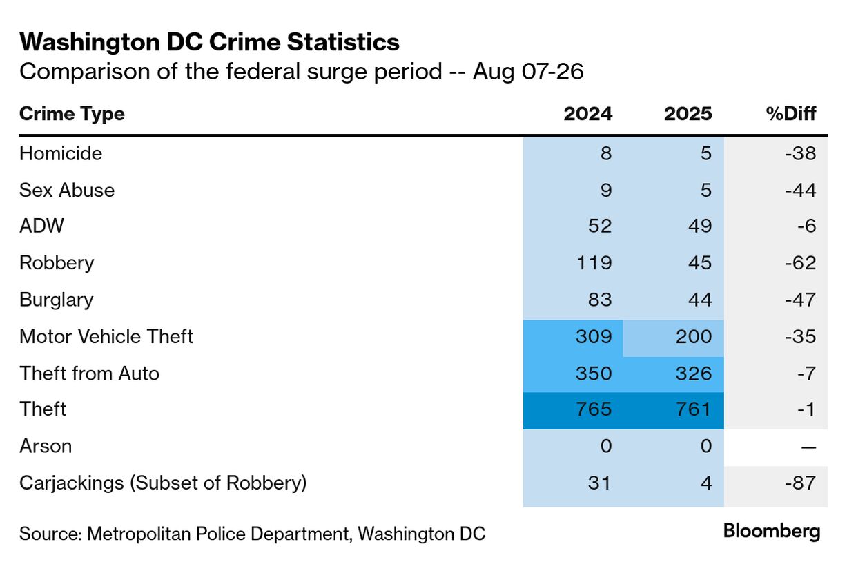 A Metropolitan Police Department officer searches a vehicle during a traffic stop in Washington. Photographer: Eric Lee/Bloomberg Trump claims his deployment of the National Guard and other federal resources in Washington has turned around the city's crime levels. That's welcome news to many in DC, but court dockets tell a different story. | |