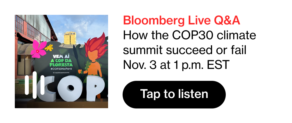 | The Brazilian Amazon will be in the spotlight next week as the first batch of COP30-related events kicks off. Today's newsletter takes you to the host city, Belém, which is hoping the influx of attention and cash will help revamp its economy. Plus, the US finally sends back its answer to the conference's RSVP and satellites survey Melissa's damage. For unlimited access to news about the energy transition, please subscribe to Bloomberg News. Belém Builds its Hopes on COP | By Fabiano Maisonnave Belém, the gateway to the Amazon rainforest, is alive with anticipation. Just days before COP30, the world's largest climate summit, new venues are opening almost daily, roads are being widened, and parks, cultural centers, restaurants and bars are springing up as construction crews race to prepare the Brazilian city for more than 50,000 visitors expected for the event. Yet, many Belenenses are missing the buzz. Leia também em português.