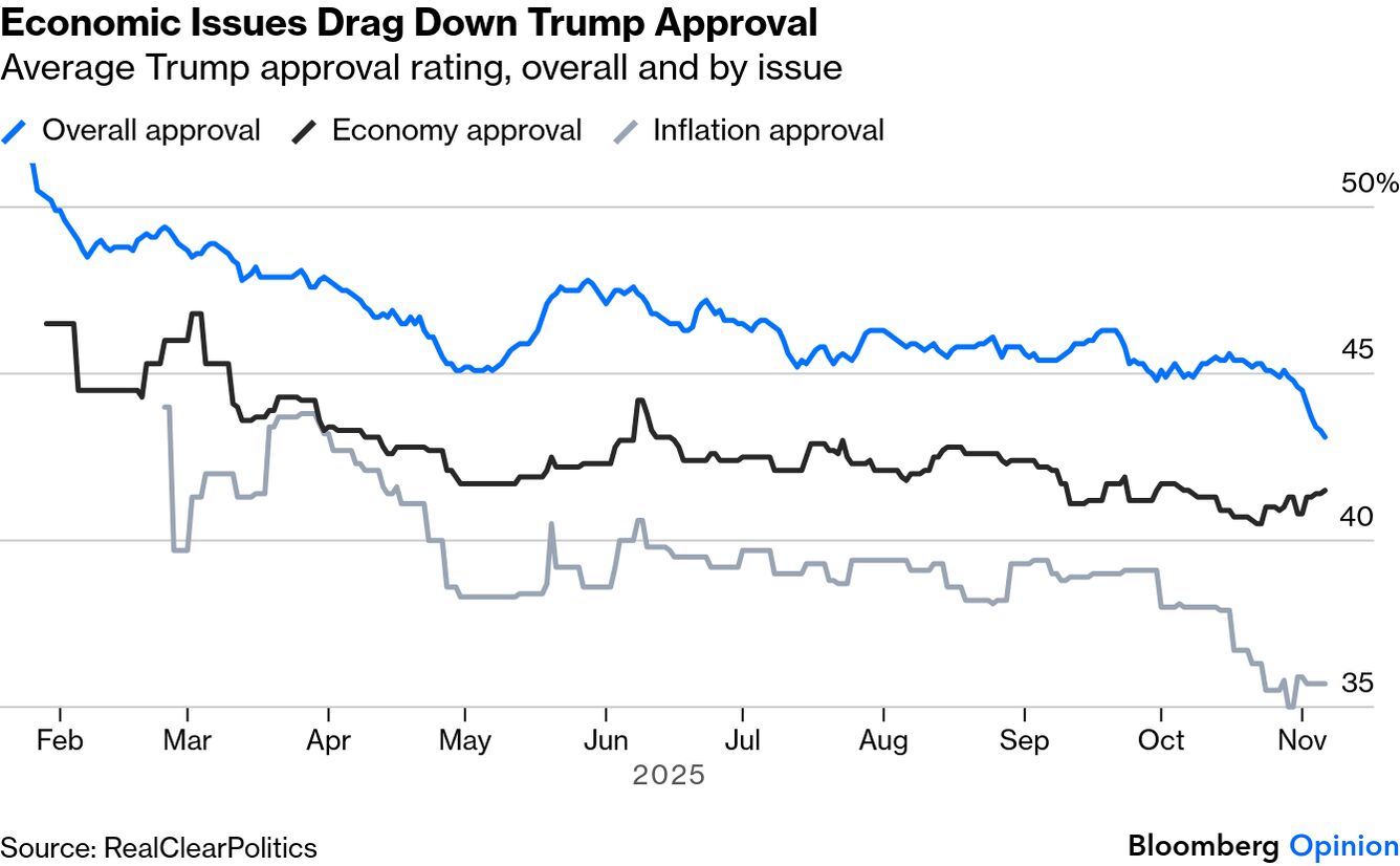 | This is Bloomberg Opinion Today, the biblical flood of Bloomberg Opinion's opinions. On Sundays, we look at the major themes of the week past and how they will define the week ahead. Sign up for the daily newsletter here. I spent my Turkey Day thinking about ducks. The lame kind. It's considered a truism that presidents make their mark during the first two years in office, before the midterm elections almost invariably weaken his party in Congress. (President Joe Biden was an exception that proves the rule.) But what of those who serve a second term? In my years on the planet, almost all of them have been afflicted by scandal or major missteps the second time around: Richard Nixon for crimes that seem almost quaint today; Ronald Reagan for Iran-Contra; Bill Clinton for a blue dress; George W. Bush for the Forever Wars. Only Barack Obama avoided a calamity but, really, what's left of his accomplishments between 2013 and 2015? The Iran nuclear deal (now defunct), the Climate Action Plan (ditto), DACA (ditto). Diplomatic relations with Cuba is hardly something to hang your hat on. But the idea that second terms are inevitably goose eggs ignores some history. Nixon ended the war in Vietnam and created the Environmental Protection Agency. Reagan took a walk in the woods that put a the biggest nail in the USSR's coffin. George W. Bush, well, activated Medicare Part D. Which brings up the enigma of Donald Trump. His nonconsecutive second term began like a firestorm: 215 executive orders (Gulf of 'Merica, brah!); letting the richest man in the world cosplay as a modern-day doge; appointing a parasitic worm-man to dismantle America's public health system; bombing Venezuelan drug runners while preparing his Department of War to invade Greenland; solving the mystery of exploding straws — the list is almost endless. Hardly the record of a lame duck, right? All of a sudden, maybe it is. "For Republicans, November was bookended by two ominous developments: Representative Marjorie Taylor Greene's resignation and the party's resounding defeats in the New Jersey and Virginia gubernatorial races," writes Ronald Brownstein. "With Trump's standing now so diminished in so many places, his best chance of holding on to his congressional majority may be to let more Republicans test the limits of his tolerance for dissent." Failing in gubernatorial races isn't great, but it is the loss of MTG that's really going to hurt. "Republicans in her district told me they are worried her departure exposes cracks in the MAGA movement and leaves the GOP with a shrinking congressional margin," writes Mary Ellen Klas. "Greene used her resignation to bring home to her fellow MAGA Republicans the destabilizing consequences of the president's intolerance for any dissent. She had the courage to leave her 'abuser.' The question now is whether anyone else will follow her lead." A broader rebellion may already be brewing. "Trump built the MAGA movement on a heterodox, us-versus-them ideology and on his blue-collar billionaire brand. This populist-nationalist coalition powered Trump to the White House, twice. Now, the relationship between MAGA and Trump is showing signs of strain," writes Nia-Malika Henderson. "The rift has exposed a factionalized MAGA, with softening enthusiasm among many of Trump's biggest boosters, who had been bound together by their singular belief in the president … this fracturing complicates Trump's agenda and poses a new challenge as he navigates the lame-duck era of his presidency." While MTG was jumping ship, a true loyalist was proving that excess is not a political virtue. Homeland Security Secretary Kristi Noem put herself at the center of $200 million PSA campaign that's a bizarre mix of Yellowstone, Sicario, North by Northwest and Wojnarowicz. Man oh man, grab the popcorn and give it a watch! Giddyup! Source: Instagram "Some GOP lawmakers are also dismayed at Noem's broader financial management of DHS, and criticized her agency this summer for moving money from other accounts to fund ICE's expensive mass deportation program," writes Patricia Lopez. "One committee report noted that 'allowing operations to significantly exceed available resources is wholly irresponsible and perpetuates fiscal mismanagement.'" One obvious way Team Trump can get back on track is to improve healthcare. That's why the president unveiled his new Affordable Care Act reforms to great fanfare on Monday. Just kidding! After all the hoo-ha, it was cancelled at the last minute, under pressure from "Republicans who were caught off guard," reported Politico. The Editorial Board is not impressed. "Republicans must deliver on a health-care compromise, lest millions of Americans get stuck with big bills come January. At issue is the expiration of Covid-era benefits for Affordable Care Act enrollees," write the editors. "Paramount should be giving consumers more choice, including those in the much larger employer-sponsored market. Gradually allowing more flexibility to pick a health plan — be it short-term coverage or a public option — should increase competition and improve care without destabilizing the market." A MAGA meltdown seems like a gift to a trio of potential 2028 Democratic frontrunners: California Governor Gavin Newsom, Illinois Governor JB Pritzker and Pennsylvania Governor Josh Shapiro. But history can be unkind to their sort. "There's a reason George W. Bush was the last governor to win the White House: In the 25-plus years since, governors have proven incapable of weathering the intense public scrutiny and navigating the media barrage of gotcha questions that accompany running for president." writes David M. Drucker. "Governors might enjoy the freedom to maneuver, politically and legislatively, without the biblical flood of questions from reporters. But it's cost them valuable experience dealing with pressure from an often-hostile media that picks apart every nook and cranny of a candidate's personal life ... 