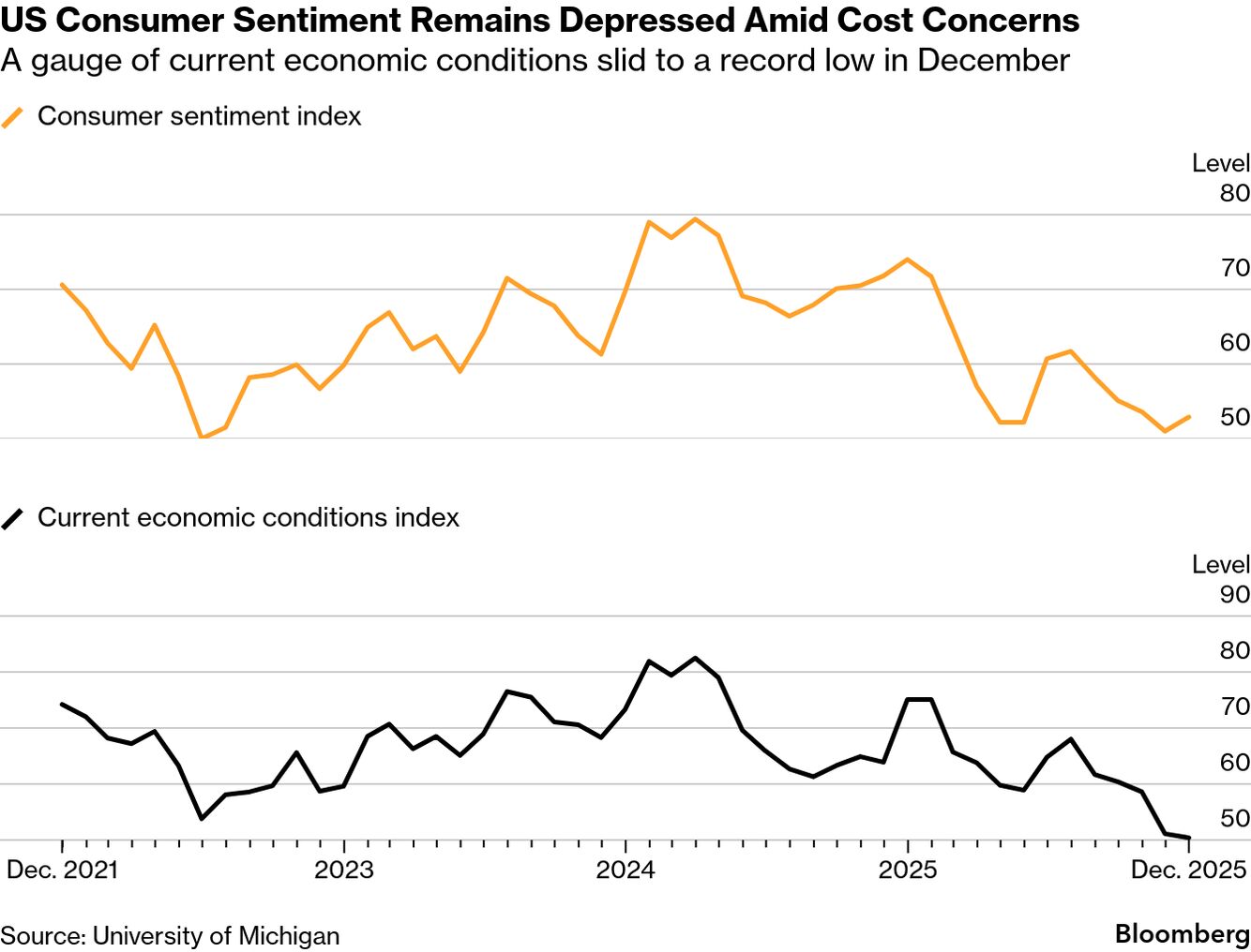 | The good news for the US economy is that consumer sentiment rose in December. The bad news is it rose by less than expected, with Americans remaining depressed over affordability concerns (despite a certain someone's claim it's all a "hoax"). The University of Michigan's final December sentiment index climbed 1.9 points to 52.9, while the median estimate in a Bloomberg survey of economists called for a reading of 53.5. Then there's the worse news: "Sentiment remains nearly 30% below December 2024, as pocketbook issues continue to dominate consumer views of the economy," Joanne Hsu, director of the survey, said in a statement. Markets however didn't seem bothered, with stocks rising while traders faced the expiration of a record pile of options that threatened to trigger sudden price swings. A rally in several tech names that have been under scrutiny over their artificial-intelligence spending lifted equities. The back-to-back advance in the S&P 500 wiped out its loss for the week. Nvidia led gains in megacaps and even Oracle surged 7%. Here's your markets wrap. —David E. Rovella | |