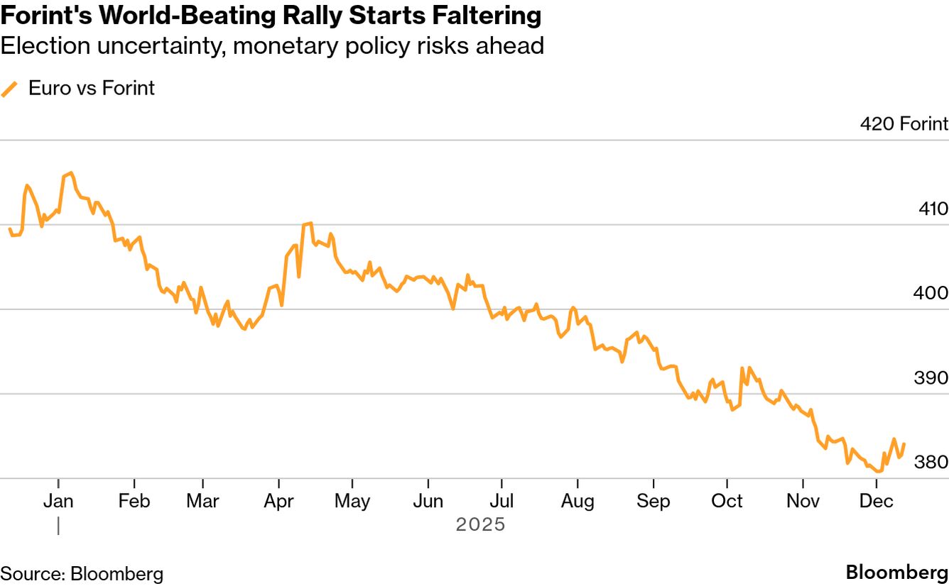 Seen and Heard on Bloomberg![]() The surge in artificial intelligence investment that has buoyed world growth is set to continue and deliver longer-term gains, OECD Secretary General Mathias Cormann said. "We do expect that the level of investment in relation to AI will continue to increase for some time," Cormann said in an interview with Bloomberg Television. "Over the medium-to-long term we do expect a significant beneficial impact when it comes to productivity growth from the accelerating diffusion and adoption of AI across the economy." Chart of the Day![]() The standout developing-nation currency in the year of emerging markets — Hungary's forint — is looking increasingly vulnerable as 2026 nears. While the market is heavily positioned for a political shakeup and hawkish interest-rate policy has underpinned the forint's strength, both factors appear increasingly at risk. Coming up