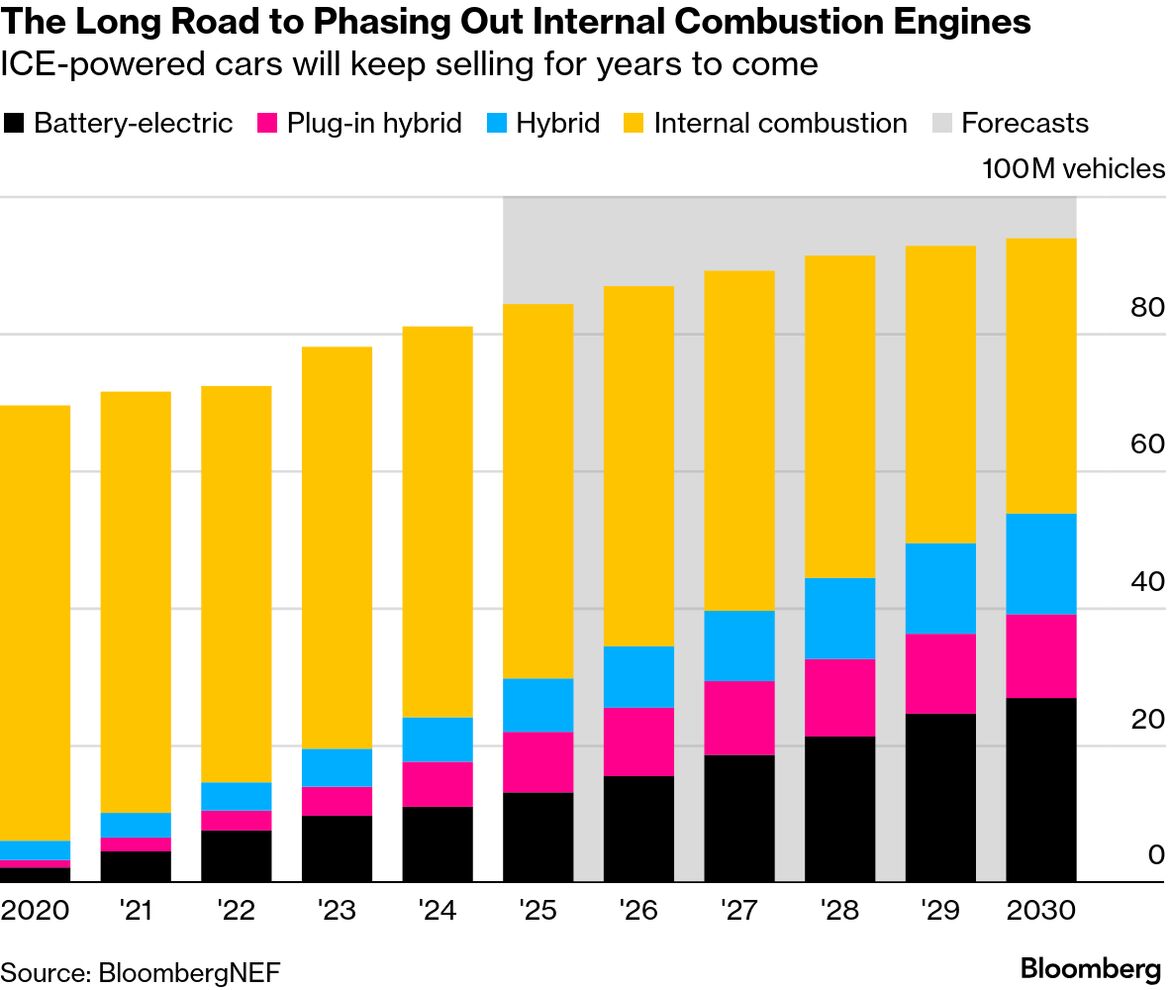 | Just because global warming is accelerating doesn't mean efforts to combat it will. In fact, the news is getting grim for those hoping to avoid the worst climate change has to offer, as this week brought new signs the electric vehicle era is sputtering. The European Commission backed away from what had been the world's most aggressive timeline for phasing out internal-combustion engines, granting manufacturers and consumers more time to move off gasoline. And a day earlier, Ford Motor announced $19.5 billion in charges tied to its retreat from an electric strategy it vowed to go all in on eight years ago. | |