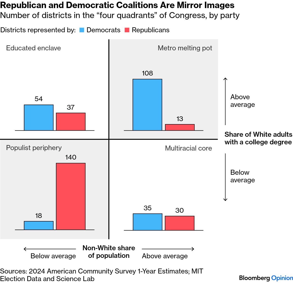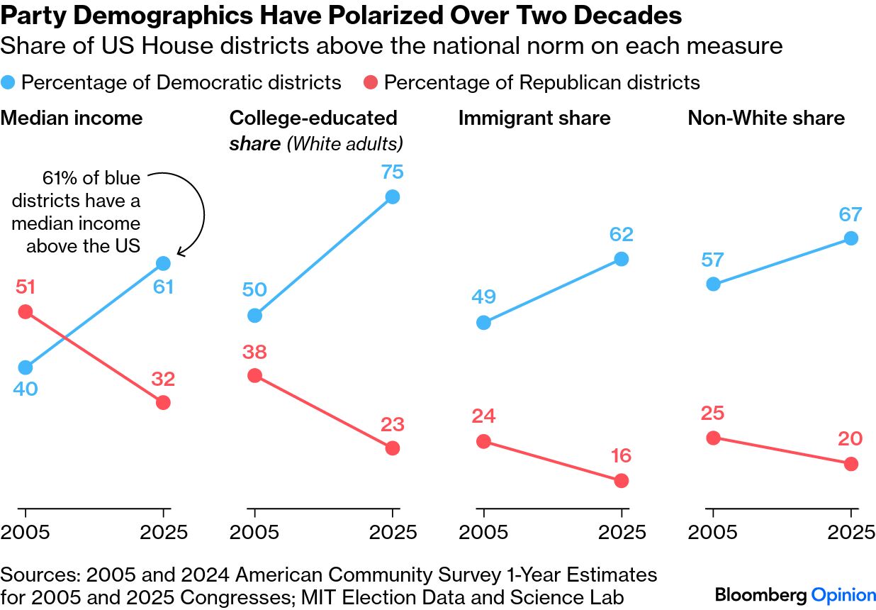 America's Two-Party Doom Loop | While you were busy staring into the depths of Marco Rubio's pores in the Vanity Fair exposé of the White House's inner circle that Nia-Malika Henderson calls a "portrait of chaos," Ronald Brownstein and Carolyn Silverman were preoccupied with a different display of dysfunction just up the road on Capitol Hill. "The House of Representatives is divided closely, bitterly and precariously," they write. Due to what they call a "profound demographic transformation" over the past 20 years, control over the House now rests "on a knife's edge," widening the gap between the parties' legislative priorities and motivations. Democrats and Republicans are so divided that former Representative Steve Israel says "members of the House are living two completely separate lives." How can anything be "bipartisan" with this kind of setup? In their analysis, Ronald and Carolyn "found that the parties not only sharply diverge from each other in the educational, racial and economic characteristics of the House seats they represent today, but also differ radically from their own composition back in the early 1990s." Using a simple 2×2 matrix, they broke House districts into four categories: the "metro melting pot" (higher than average racial diversity and White college attainment), the "multiracial core" (high diversity but below-average White education), the "educated enclave" (fewer minorities and higher White college attainment), and the "populist periphery" (below-average shares of minorities and Whites with college degrees). "Though Republicans hold the overall House majority, Democrats now lead the GOP in three of these four quadrants," they write. Gerrymandering certainly plays a role here, but they point to a series of "hinge-point elections" — the Republican landslide in 1994, the Tea Party election of 2010 and the 2018 blue wave — that dismantled old alliances and rearranged the balance of power. Could 2026 provide a similar seismic shift? Don't hold your breath. Ronald and Carolyn say "the odds that either party can establish a sizable or lasting House majority across this starkly divided electoral landscape appear small." Bonus US Politics Reading: The Trump Corollary exposes the caprice of a geopolitical bully who lacks a coherent strategy. — Andreas Kluth In 2017, a strange sartorial trend took New York City by storm: gorpcore. Suddenly, everyone was cosplaying a hiker hitting the Appalachian trail. Park Slope dads ditched their J.Crew chinos for Patagonia wind pants. NYU students started carrying their dorm room fobs on metal carabiners. Influencers began non-ironically sporting Birkenstocks during Fashion Week. And unlike most trends, gorpcore hasn't really died, no matter what GQ tells you. Just look at the fit Timothée Chalamet was rocking at the BAFTA screening of Marty Supreme: Photographer: Dia Dipasupil/Getty Images North America In China, Juliana Liu says the gorpcore aesthetic is surging, but not because of Chalamet's "Sweet Tea" fans. In the aftermath of Covid-19, "the country is in the midst of a wellness boom," she explains. "Even though China was late to embrace this phenomenon, it has adopted the concept and moved it firmly into the mainstream." The great outdoors may be free, but gorpcore ain't cheap. Juliana says Chinese customers (including President Xi Jinping himself!) are shelling out an eye-watering 8,000 yuan — or $1,100 — for waterproof Arc'teryx parkas. "That's only 2,000 less than the median monthly salary of a megacity like Shenzhen," she writes. Read the whole thing in all its gorp-y glory. |