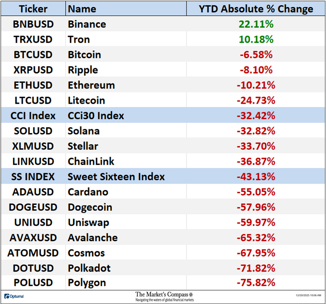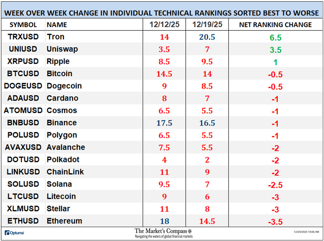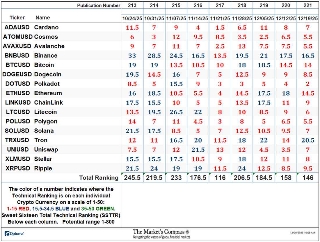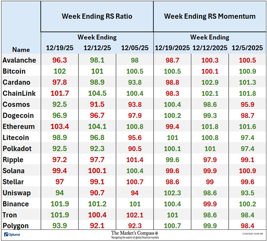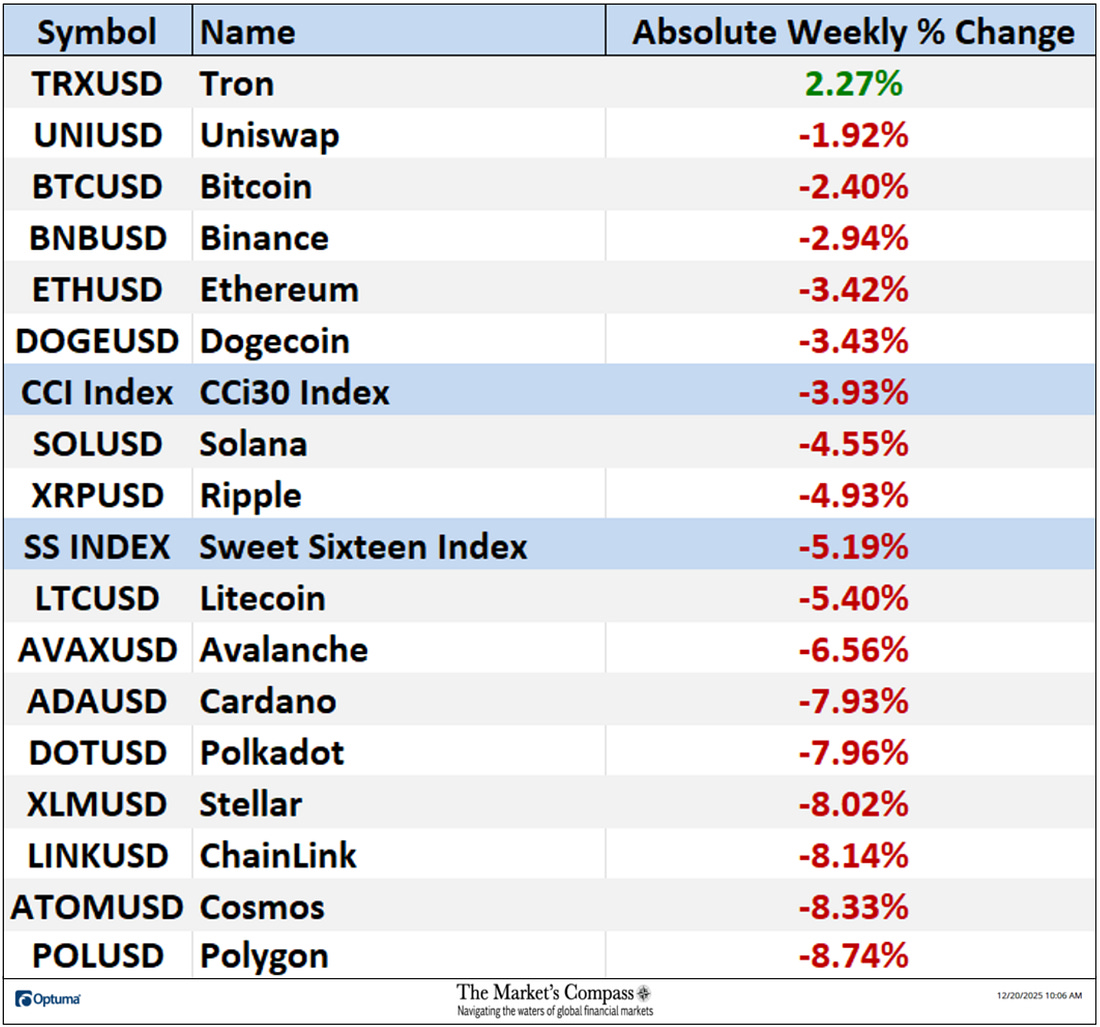 Welcome to this week’s publication of the Market’s Compass Crypto Sweet Sixteen Study #221. The Study tracks the technical condition of sixteen of the larger market cap cryptocurrencies. Every week the Studies will highlight the technical changes of the 16 cryptocurrencies that I track as well as highlights on noteworthy moves in individual Cryptocurrencies and Indexes. As always, paid subscribers will receive this week’s unabridged Market’s Compass Crypto Sweet Sixteen Study sent to their registered email Sundays*. Past publications including the Weekly ETF Studies can be accessed by paid subscribers via The Market’s Compass Substack Blog. *In celebration of the Hanukkah and Christmas Holidays it is also being sent to free subscribers. This Week’s and 8 Week Trailing Technical Rankings of the Sixteen Individual CryptocurrenciesAn explanation of my objective Individual Technical Rankings and Sweet Sixteen Total Technical Ranking go to www.themarketscompass.com. Then go to the MC’s Technical Indicators and select “crypto sweet 16”. What follows is a Cliff Notes version* of the full explanation… *The technical ranking system is a quantitative approach that utilizes multiple technical considerations that include but are not limited to trend, momentum, measurements of accumulation/distribution and relative strength. The TR of each individual Cryptocurrency can range from 0 to 50. The Excel spreadsheet below indicates the the objective Technical Ranking (“TR”) of each individual Cryptocurrency and the Sweet Sixteen Total Technical Ranking (“SSTTR”) as of last Friday*. The second Excel spreadsheet indicates the week over week change in the “TR” of each individual Cryptocurrency. The Sweet Sixteen Total Technical Ranking fell last week (for the fourth week in a row), down -7.59% to 146 from 158 the previous week but nonetheless that reading is still above the deeply oversold reading of 116 reading five weeks ago that marked an all-time low since I began calculating the “SSTTR” in September of 2022. Only three of the Sweet Sixteen marked gains in their TRs last week, and thirteen moved lower. The average Sweet Sixteen TR loss was -0.75, adding to the average TR loss of -1.66 the previous week and -13.8 three weeks ago. Once again for the tenth week in a row, none of the crypto currency TRs I track ended the week in the “green zone” (TRs between 35 and 50), two were in the “blue zone” (TRs between 15.5 and 34.5) and fourteen were in the “red zone” (TRs between 0 and 15). Tron (TRX) rose into the “blue zone” (TRs between 15.5 and 34.5) and Ethereum (ETH) fell into “red zone” with Binance (BNB) remaining in the “blue zone”. Relative Strength and Weakness in the Sweet Sixteen vs. The CCi30 Index* utilizing a Relative Rotation Graph*The CCi30 Index is a registered trademark and was created and is maintained by an independent team of mathematicians, quants and fund managers lead by Igor Rivin. It is a rules-based index designed to objectively measure the overall growth, daily and long-term movement of the blockchain sector. It does so by indexing the 30 largest cryptocurrencies by market capitalization, excluding stable coins (more details can be found at CCi30.com). The chart below has two weeks, or 14 days, of relative data points vs. the benchmark, (the CCi30 Index) at the center, deliniated by the dots or nodes. Not all of the Sweet Sixteen are plotted in this RRG Chart. I have done this for clarity purposes. Those which I believe are of higher technical interest remain. On the Friday before last, both Cardano (ADA) and ChainLink (LINK) had just started to roll over losing upside Relative Strength Momentum. Last week both strted to also lose Relative Strength and in the middle of last week ChainLink fell out of the Leading Quadrant and into the Weakening Quadrant. Cardano never made it into the Leading Quadrant and at the end of last week it fell out of the Improving Quadrant and dropped into the Lagging Quadrant. Despite improving Relative Strength momentum as it climbed out of the Lagging Quadrant and into the Improving Quadrant, Uniswap (UNI) still sports the lowest Relative Strength Ratio of the Sweet Sixteen at 94 last Friday (see the Tabulation Table below). I have further “tweaked” the added new feature the “Tabulation Table” that now marks the Relative Strength and Relative Strength Momentum readings vs. the CCi30 Index at the end of last week and I have now added the two preceding week when we last published the Crypto Sweet Sixteen Study on 12/12. If there has been an improvement in either the Relative Strength Ratio or the Relative Strength Momentum reading since the preceding week, I have highlighted it in green. If there has been a contraction in both it is highlighted in red and an unchanged reading in either will remain black. The color-coding system has served as a heat map over the past three weeks highlighting either the continued improvement, deterioration, or stasis vs. the benchmark CCi30 Index. Eight of the crypto currencies registered improvements in their Relative Strength Ratios last week and ten marked an improvement in their Relative Strength Momentum and nine showed improvement in both on a week-over-week basis. Ripple (XRP) and Stellar (XMR) have displayed declining Relative Strength Ratios over the past three weeks vs. the benchmark CCi30 Index. Seven Day Absolute % Price Change**Friday December 12th to Friday December 19th. Only one of Sweet Sixteen gained ground over the past seven days (that was Tron) and fifteen continued to lose absolute ground vs. the week before when four gained absolute ground and thirteen lost absolute ground. Last week the average absolute percentage loss was -5.15% vs. the week before when the average absolute loss was -1.66%. Both weekly average moves exclude the two Indexes. The Technical Condition FactorsThe Technical Condition Factors or TCFs are utilized in the calcula