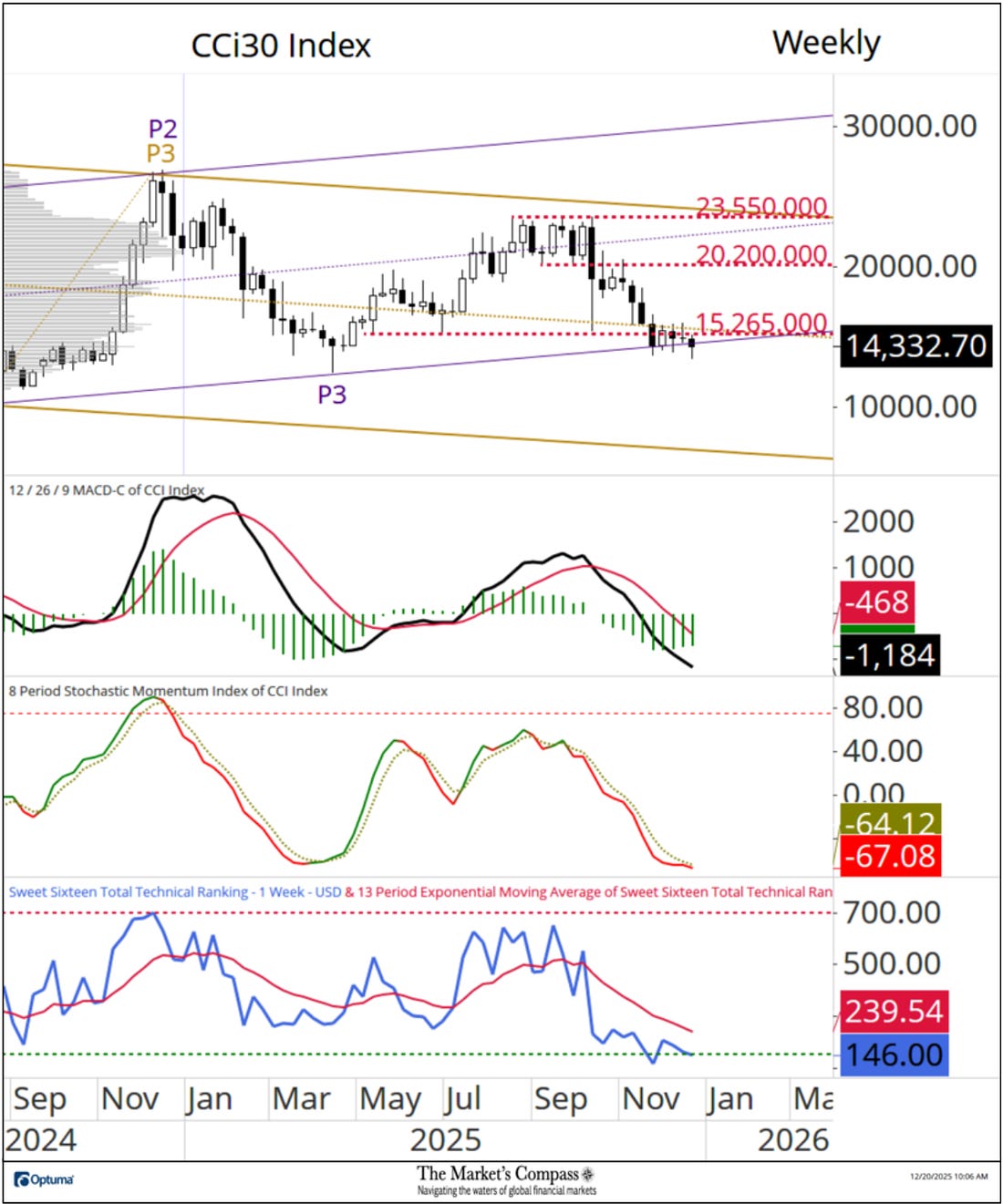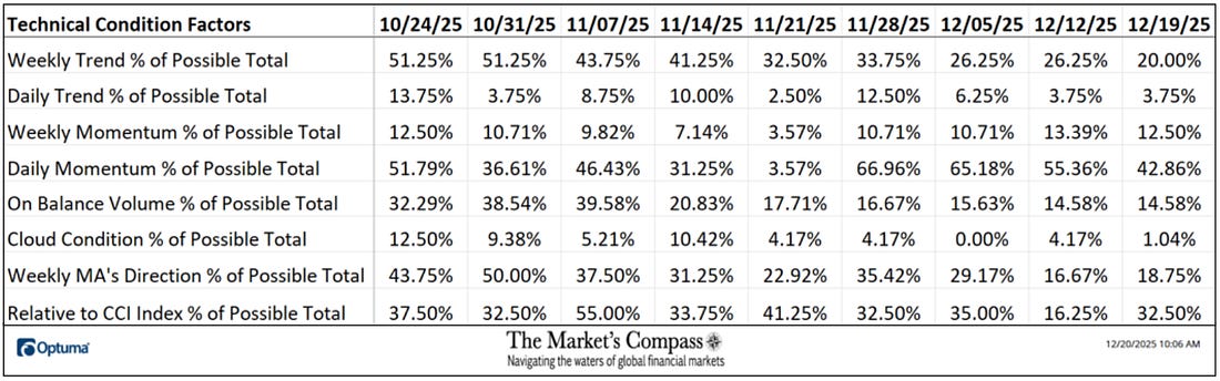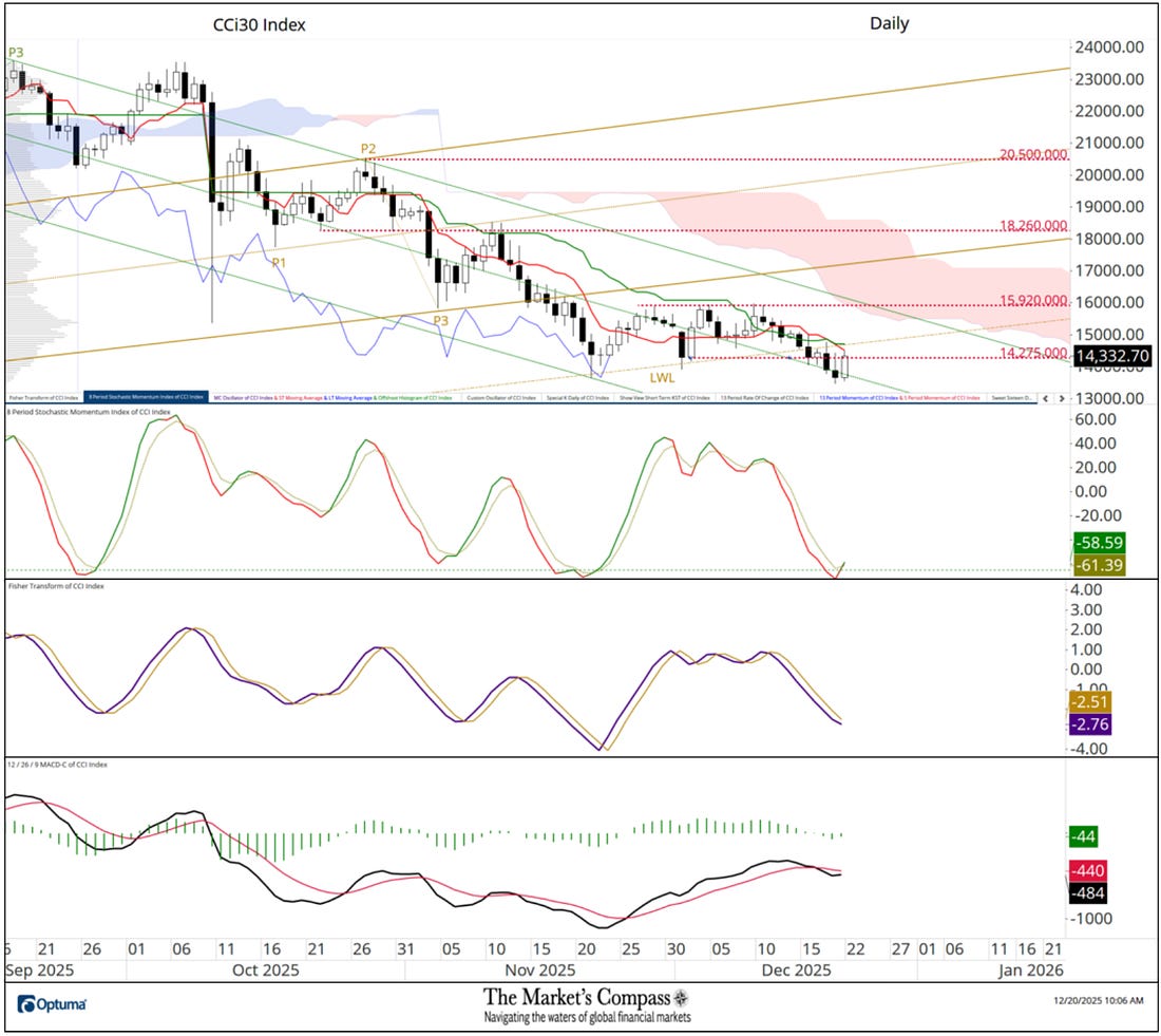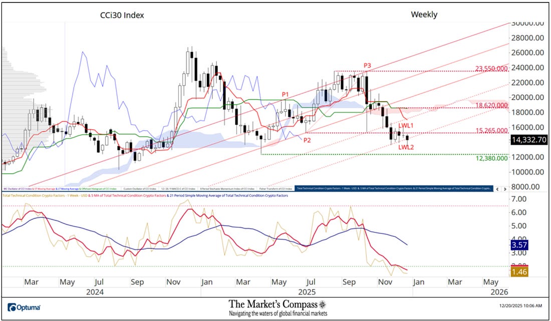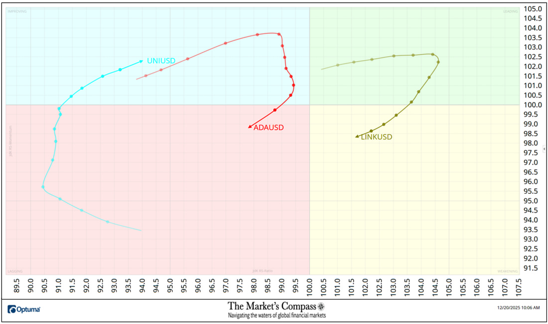 Welcome to this week’s publication of the Market’s Compass Crypto Sweet Sixteen Study #221. The Study tracks the technical condition of sixteen of the larger market cap cryptocurrencies. Every week the Studies will highlight the technical changes of the 16 cryptocurrencies that I track as well as highlights on noteworthy moves in individual Cryptocurrencies and Indexes. As always, paid subscribers will receive this week’s unabridged Market’s Compass Crypto Sweet Sixteen Study sent to their registered email Sundays*. Past publications including the Weekly ETF Studies can be accessed by paid subscribers via The Market’s Compass Substack Blog. *In celebration of the Hanukkah and Christmas Holidays it is also being sent to free subscribers. This Week’s and 8 Week Trailing Technical Rankings of the Sixteen Individual CryptocurrenciesAn explanation of my objective Individual Technical Rankings and Sweet Sixteen Total Technical Ranking go to www.themarketscompass.com. Then go to the MC’s Technical Indicators and select “crypto sweet 16”. What follows is a Cliff Notes version* of the full explanation… *The technical ranking system is a quantitative approach that utilizes multiple technical considerations that include but are not limited to trend, momentum, measurements of accumulation/distribution and relative strength. The TR of each individual Cryptocurrency can range from 0 to 50. The Excel spreadsheet below indicates the the objective Technical Ranking (“TR”) of each individual Cryptocurrency and the Sweet Sixteen Total Technical Ranking (“SSTTR”) as of last Friday*. The second Excel spreadsheet indicates the week over week change in the “TR” of each individual Cryptocurrency. The Sweet Sixteen Total Technical Ranking fell last week (for the fourth week in a row), down -7.59% to 146 from 158 the previous week but nonetheless that reading is still above the deeply oversold reading of 116 reading five weeks ago that marked an all-time low since I began calculating the “SSTTR” in September of 2022. Only three of the Sweet Sixteen marked gains in their TRs last week, and thirteen moved lower. The average Sweet Sixteen TR loss was -0.75, adding to the average TR loss of -1.66 the previous week and -13.8 three weeks ago. Once again for the tenth week in a row, none of the crypto currency TRs I track ended the week in the “green zone” (TRs between 35 and 50), two were in the “blue zone” (TRs between 15.5 and 34.5) and fourteen were in the “red zone” (TRs between 0 and 15). Tron (TRX) rose into the “blue zone” (TRs between 15.5 and 34.5) and Ethereum (ETH) fell into “red zone” with Binance (BNB) remaining in the “blue zone”. Relative Strength and Weakness in the Sweet Sixteen vs. The CCi30 Index* utilizing a Relative Rotation Graph*The CCi30 Index is a registered trademark and was created and is maintained by an independent team of mathematicians, quants and fund managers lead by Igor Rivin. It is a rules-based index designed to objectively measure the overall growth, daily and long-term movement of the blockchain sector. It does so by indexing the 30 largest cryptocurrencies by market capitalization, excluding stable coins (more details can be found at CCi30.com). The chart below has two weeks, or 14 days, of relative data points vs. the benchmark, (the CCi30 Index) at the center, deliniated by the dots or nodes. Not all of the Sweet Sixteen are plotted in this RRG Chart. I have done this for clarity purposes. Those which I believe are of higher technical interest remain. On the Friday before last, both Cardano (ADA) and ChainLink (LINK) had just started to roll over losing upside Relative Strength Momentum. Last week both strted to also lose Relative Strength and in the middle of last week ChainLink fell out of the Leading Quadrant and into the Weakening Quadrant. Cardano never made it into the Leading Quadrant and at the end of last week it fell out of the Improving Quadrant and dropped into the Lagging Quadrant. Despite improving Relative Strength momentum as it climbed out of the Lagging Quadrant and into the Improving Quadrant, Uniswap (UNI) still sports the lowest Relative Strength Ratio of the Sweet Sixteen at 94 last Friday (see the Tabulation Table below). I have further “tweaked” the added new feature the “Tabulation Table” that now marks the Relative Strength and Relative Strength Momentum readings vs. the CCi30 Index at the end of last week and I have now added the two preceding week when we last published the Crypto Sweet Sixteen Study on 12/12. If there has been an improvement in either the Relative Strength Ratio or the Relative Strength Momentum reading since the preceding week, I have highlighted it in green. If there has been a contraction in both it is highlighted in red and an unchanged reading in either will remain black. The color-coding system has served as a heat map over the past three weeks highlighting either the continued improvement, deterioration, or stasis vs. the benchmark CCi30 Index. Eight of the crypto currencies registered improvements in their Relative Strength Ratios last week and ten marked an improvement in their Relative Strength Momentum and nine showed improvement in both on a week-over-week basis. Ripple (XRP) and Stellar (XMR) have displayed declining Relative Strength Ratios over the past three weeks vs. the benchmark CCi30 Index. Seven Day Absolute % Price Change**Friday December 12th to Friday December 19th. Only one of Sweet Sixteen gained ground over the past seven days (that was Tron) and fifteen continued to lose absolute ground vs. the week before when four gained absolute ground and thirteen lost absolute ground. Last week the average absolute percentage loss was -5.15% vs. the week before when the average absolute loss was -1.66%. Both weekly average moves exclude the two Indexes. The Technical Condition FactorsThe Technical Condition Factors or TCFs are utilized in the calcula