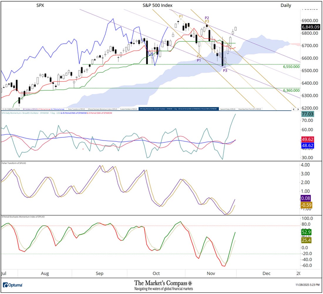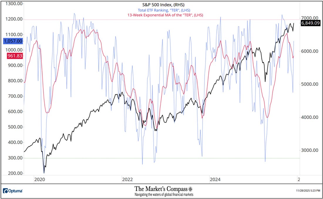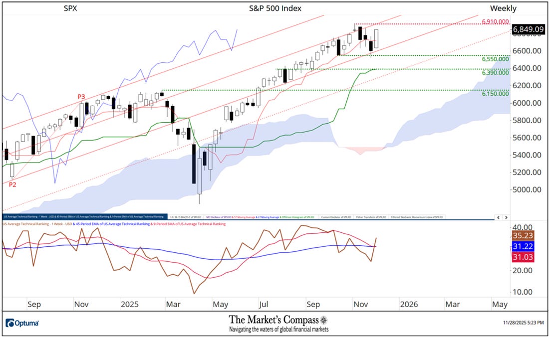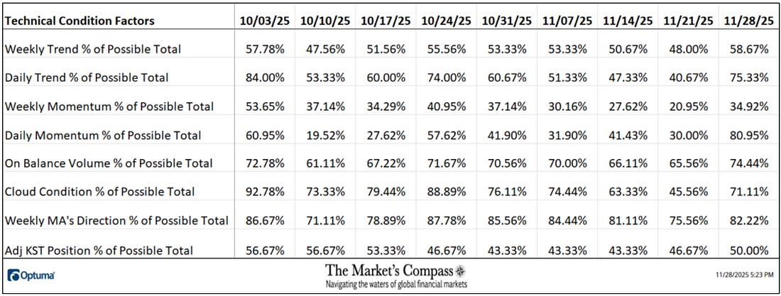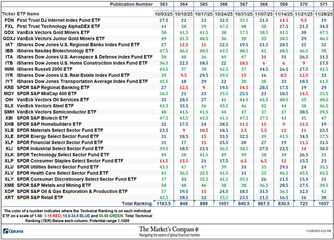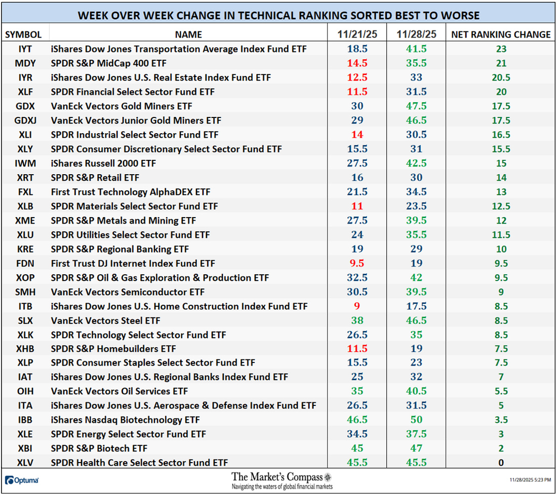 Welcome to The Market’s Compass US Index and Sector ETF Study, Week #571. As always it highlights the technical changes of the 30 US Index and Sector ETFs that I track on a weekly basis and normally publish every third week. Past publications can be accessed by paid subscribers via The Market’s Compass Substack Blog. This week, in celebration of Thanksgiving, free subscribers will also receive this week’s entire Study in a not so veiled attempt to lure them to become paid subscribers. This Week’s and 8 Week Trailing Technical Rankings of the 30 Individual U.S. Index and Sector ETFsTo understand the methodology used in constructing the objective U.S. Index and Sector ETF Individual Technical Rankings visit the MC’s Technical Indicators page at www.themarketscompass.com and go to “us etfs”. What follows is a Cliff Notes version* of the full explanation… *The technical ranking system is a quantitative approach that utilizes multiple technical considerations that include but are not limited to trend, momentum, measurements of accumulation/distribution and relative strength of each individual 30 U.S Index and Sector ETFs that can range between 0 and 50. Total US ETF Ranking or “TER” rose sharply last week, rising +46.20% to 1057 from 723 which was the fifth week of declines in the “TER”. In a broad-based technical improvement of the thirty US ETFs we track twenty-nine showed gains in their Technical Rankings or “TR”, and one was unchanged. That was the SPDR Health Care Select Sector Fund ETF (XLV), but it should noted, despite being unchanged, its TR was nonetheless only just 4.5 points of near perfect. Fourteen ETFs made double-digit gains in their TRs. Sixteen ETF TRs ended the week in the “green zone” (TRs from 35 to 50) and fourteen ended in the “blue zone” (TRs from 15.5 to 34.5) vs. the previous week when there were only five in the “green zone”, seventeen in the “blue zone”, and eight were in the “red zone” (TRs between 0 and 15). Last week was the first time in four weeks when there wasn’t at least one TR in the “red zone”. The average TR gain on the week was +11.19 (the largest average TR gain in recent memory) vs. the week before average TR loss of -3.53. The Technical Condition Factor* Changes over the past week and previous 8 weeks*The Technical Condition Factors are derived from a calculation of the total Individual US Index and Sector ETF Technical Rankings. What is shown in the excel panel below is the total TCFs of all thirty TRs. A few TCFs carry more weight than the others, such as the Weekly Trend Factor and the Weekly Momentum Factor in compiling each individual TR of each of the 30 ETFs. Because of that, the excel sheet below calculates each factor’s weekly reading as a percentage of the possible total. To fully understand the construction the of The Technical Condition Factors visit the MC’s Technical Indicators page at www.themarketscompass.com and go to “us etfs”. One technical takeaway would be for example, if the DMC Factor or DMCTF rises to an extreme between 85% and 100%, it would suggest a short-term overbought condition. Conversely, a reading in the range of 0% to 15% would suggest an oversold condition was developing. This past week a reading of 80.95% was registered in the DMCTF or 170 out of a total of 210 positive points, which was up from 30.00% the previous week. As a confirmation tool, if all eight TCFs improve on a week over week basis, more of the 30 ETFs are improving internally on a technical basis confirming a broader market move higher (think of an advance/decline calculation). Conversely if all eight TCFs fell over the week it confirms a move lower in the broader market. Last week all eight TCFs gained ground confirming the broad-based rally in the S&P 500 Index. The SPX Index with the Total US ETF Technical Ranking, “TER”, OverlaidThe Total US ETF Technical Ranking (“TER”) Indicator is a total of all 30 ETF rankings and can be looked at as a confirmation/divergence indicator as well as an overbought oversold indicator. The S&P 500 Index rallied 3.73% last week to close at a new weekly closing high, thus avoiding a lower low and keeping the series of higher lows and higher highs on a weekly closing basis since April low intact. The Total US ETF Technical Ranking or “TER” rose sharply to a higher high to end the week at 1,057 confirming last week’s rally in the large cap index. The Weekly Candlestick and Cloud Chart with The Average Technical Ranking of the 30 US Index and Sector ETFsThe Weekly Average Technical Ranking (“ATR”) is the average Technical Ranking of the 30 US Index and Sector ETFs we track. Like the TER, it is a confirmation/divergence as well as an overbought/oversold indicator. When I last published the US Index and Sector ETF Study on November 10th for the week ending November 7th, the SPX had pulled back at the Median Line (red dotted line) of the Standard Pitchfork* (red P1-P3). Two weeks ago the index fell and closed below the Tenkan Plot (red line) which had cradled prices on an weekly closing basis since early May but by the end of that week the Lower Parallel (solid line) held a further selloff and last week the SPX rallied impulsively, suggesting that short term correction from the record intra-week high at 6,910 had run its course. Like the Total Technical Ranking the “ATR” by rising from a lower low to a higher high in concert with the 9-Week SMA (red line in lower panel) avoiding a violation of the 45-Week EMA (blue line). These technical features point to a challenge of the Median Line and the all-time intra-week high at 6,910 in the weeks and perhaps days to come. *An in-depth comprehensive lesson on Pitchforks is available on my website… The Weekly Absolute and Relative Price % Change**Does not include potential dividends if any All thirty US Index and Sector ETFs we track in this Study gained ground on an absolute basis at the end of t