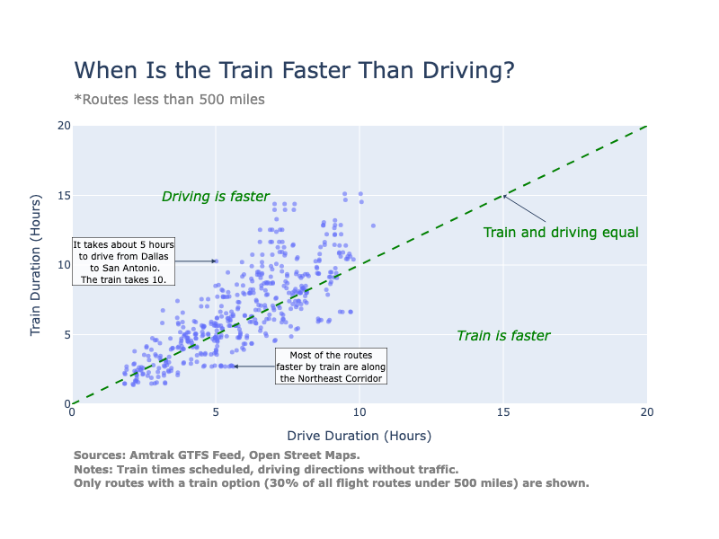 | Today we're bringing you a special edition of MapLab from Aaron Gordon, our colleague on Bloomberg's data journalism team. It's no secret America's rail options outside the Northeast Corridor leave a lot to be desired, with limited routes and frequent delays that often make it less appealing than flying or driving. But when the government shutdown in November resulted in thousands of canceled flights across the country, it got me wondering: How many travelers even have the train available as backup? There is no one answer to this question. What constitutes a viable travel option to one person — say, a 19-hour train trip from Chicago to New York — is a one-way ticket to insanity for another. It also depends on one's circumstances, such as how badly you want to get to where you're going. But for those who want to know just how inflexible the US transportation system is in the event of another shutdown, say, next month, I crunched the numbers on the types of routes where a train could be a good option, if only the US invested in them. About 1,500 routes across the US are 500 miles or less, a distance that could be replaced with a train trip for roughly the same travel time when factoring in the airport rigamarole. Some 70% of those flights have no train option at all. Out of those that do, 65% would likely be faster by car. And it's usually not close. On average, driving is three times faster than the train, although some extreme examples skew the average, like Salt Lake City to Palm Springs — 11 hours by car, versus a very circuitous 95 hours by train via San Francisco and LA. There are, however, three regions where the train is competitive with driving. In addition to the well-known Northeast Corridor from Boston to Washington, DC, which includes the Acela not-quite-high-speed train, there's the Pacific Northwest route from Portland to Seattle. Recent investments have also added some short routes out of Chicago back to the list, after years of neglect in what was once a flourishing rail hub. The US had one of the world's best rail systems through the middle of the 20th century. It collapsed under competitive pressure from cars, trucks and airplanes. As the number of travelers has exploded, more and more people are relying on an increasingly brittle system. But the good bones of the train networks of yore are still there. Of course, comparisons with Europe or China put even these fastest regions to shame. Whether considering a transportation landscape in a large metro area, a region, or a country, the most successful ones offer multiple options and flexibility. Subway down? Walk to another subway line. Or take the bus. Or use bikeshare. Flight disruptions? Consider the train. Or a bus (speaking of, the less said about American intercity buses the better). The US does the opposite. The vast majority of Americans have one choice for short trips — the car — and another for long trips — the plane. There is no Plan B. The Secret Formula for Faster Trains A report shows how Amtrak and commuter railroads can reduce "dead time" and increase speeds for less than it would cost to build new high-speed rail lines. European Commission Sets Goal to Slash Train Times Across the Continent The high-speed rail plan would more than halve travel time between cities like Madrid and Lisbon by 2040. But executing the vision will take €345 billion. Where Train Dreams Meet Reality in Texas Dallas and Houston are 250 miles apart. But if you want to take a train between them, prepare for a 23-hour odyssey that says a lot about where US passenger rail is heading. |