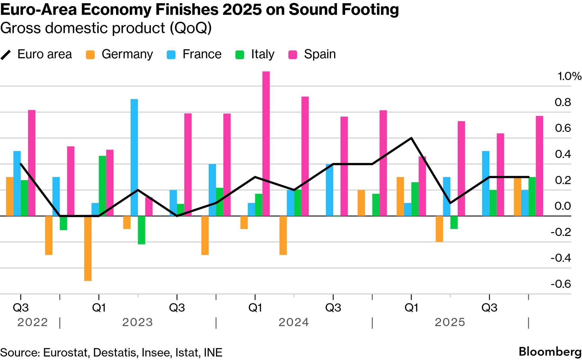 ![]() ![]() Welcome to the Brussels Edition. I'm Suzanne Lynch, Bloomberg's Brussels bureau chief, bringing you the latest from the EU each weekday. Make sure you're signed up. Some of the EU's economic behemoths shrugged off the trade turmoil unleashed by US President Donald Trump to post better-than-expected growth. Overall, the euro zone grew by 0.3 per cent in the last quarter of 2025. Germany, Italy and Spain all surpassed estimates, with the latter once again the standout performer with an expansion of 0.8%. At 0.2%, meanwhile, France matched forecasts. The positive news comes as markets digest Trump's pick of Kevin Warsh to succeed Jerome Powell as chair of the Federal Reserve. Confirmation of who will take over one of the biggest jobs in banking when Powell's term ends in May has given some direction to markets after a whirlwind week. Warsh, who will need Senate approval, has aligned himself with the president in recent months by arguing publicly for lower interest rates, a position that belies his longstanding reputation as an inflation hawk. ![]() The main market impact so far has been a bump for the dollar, reversing an extended slide, while gold and silver also fell this morning in anticipation of the Warsh announcement. The dollar's rise is likely to be welcomed on this side of the Atlantic, as the European Central Bank looks ahead to its rate-setting meeting next week. Though analysts expect the ECB to keep rates steady, the recent dollar rout this month has given food for thought to decision-makers. The euro briefly traded above $1.20 on Wednesday – the highest since 2021. That's a potential headwind for the euro zone economy given the bloc's dependence on exports. German inflation also edged past 2% ahead of next week's meeting. Separately, in a sign of potential waning enthusiasm for the US investment case, Dutch pension fund PME is pivoting toward more European opportunities, especially in the technology sector. The US is "no longer the reliable ally it once was," PME Chairman Alae Laghrich said yesterday. While Laghrich acknowledged that the US economy can't be ignored, he listed Trump administration policies such as trade tariffs, as well as what he called "threats and not upholding existing agreements" as reasons for the fund's decision. Whether PME's move is a bellwether for a broader investment shift is yet to be seen. The Latest